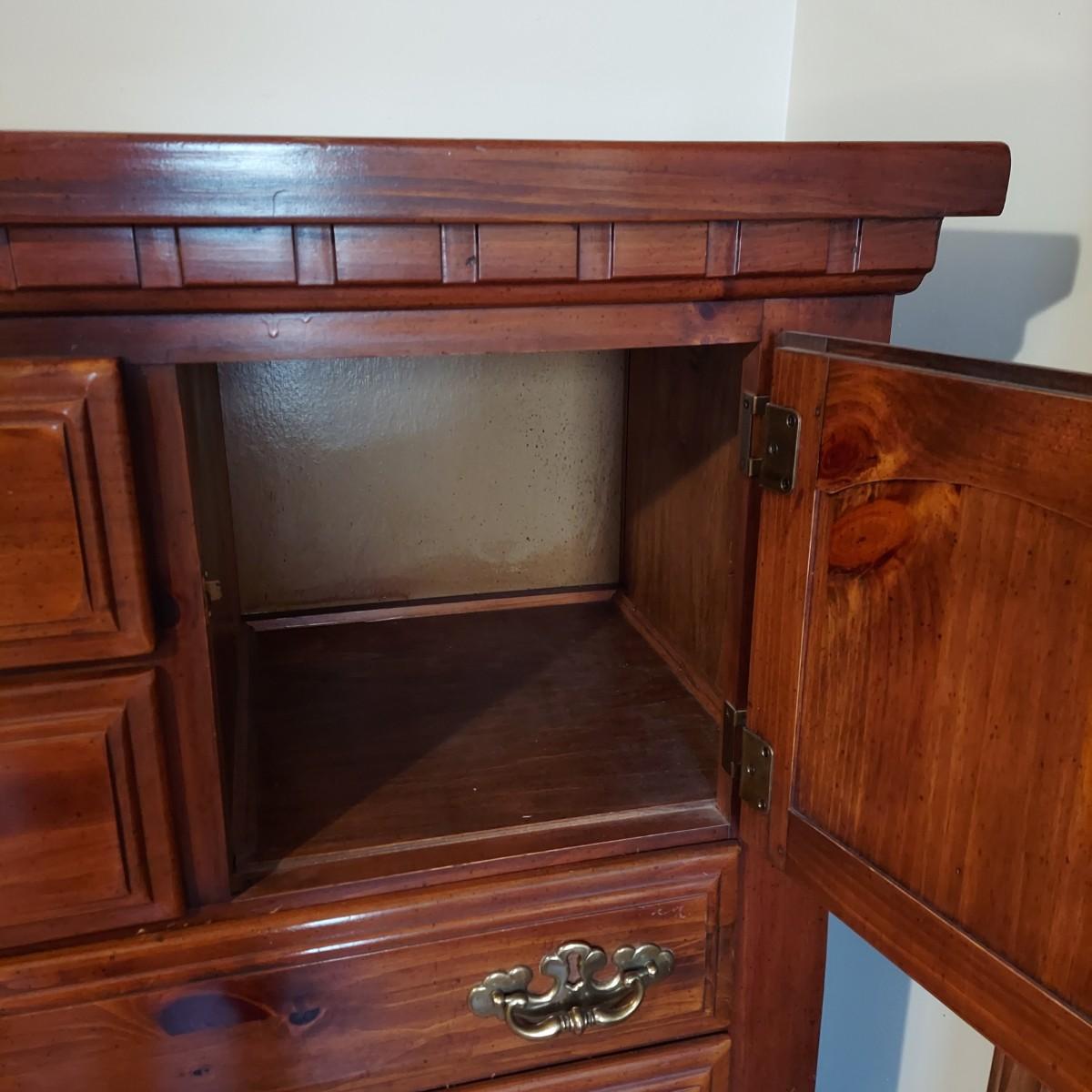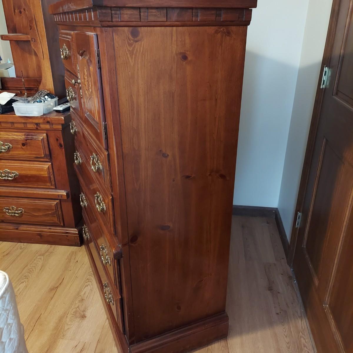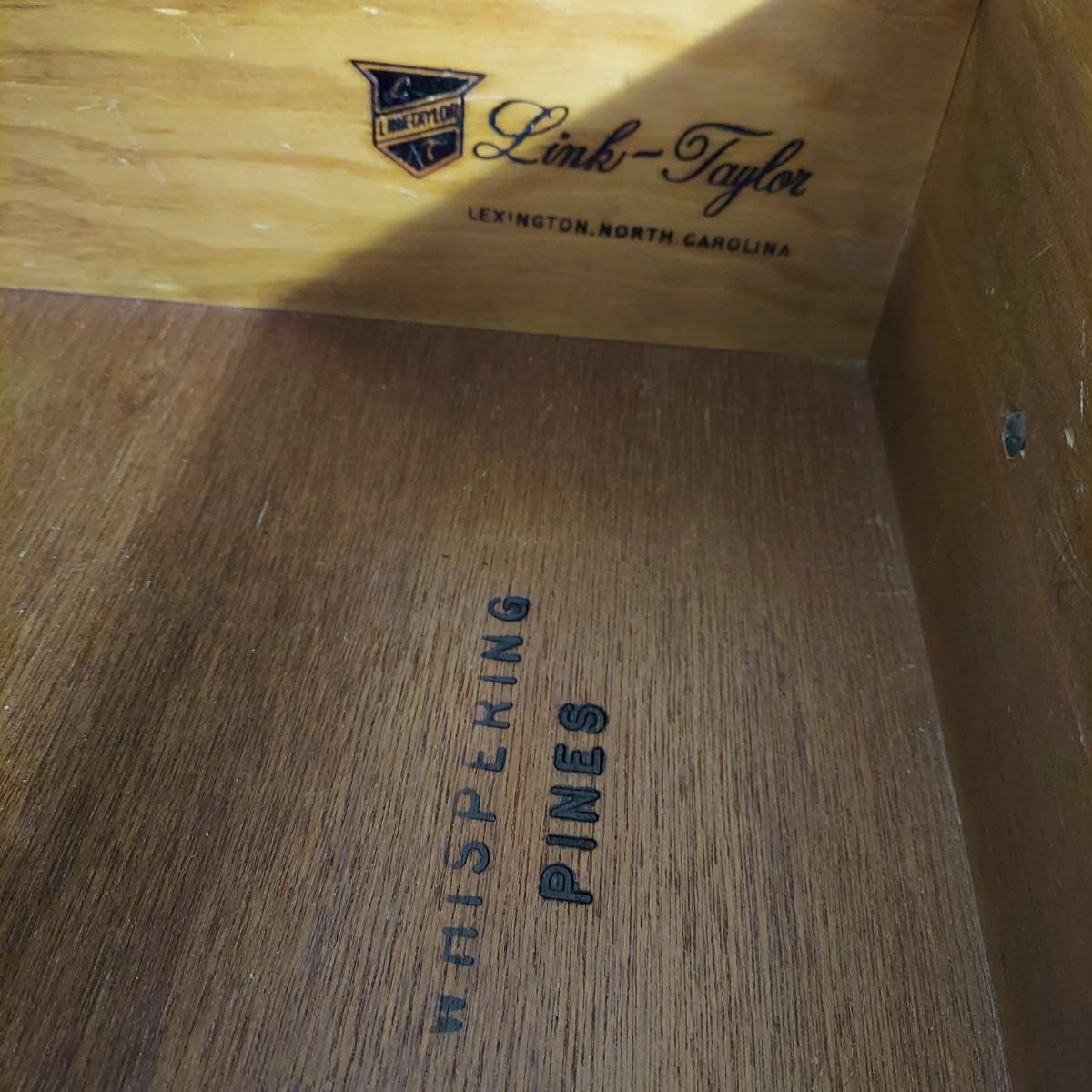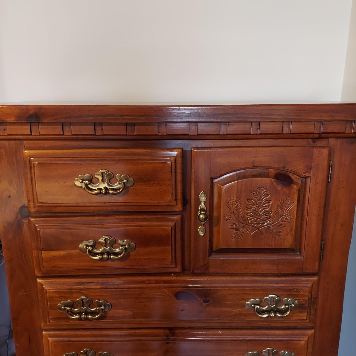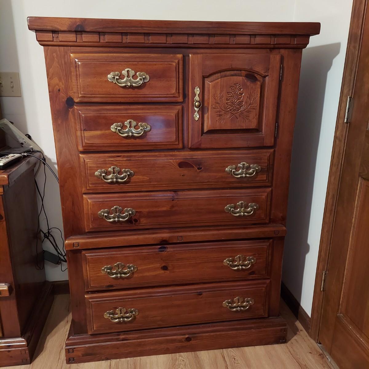 This tall solid wood dresser is Link-Taylor brand. The style is Whispering Pines. There are 4 large drawers, two small drawers and a small cabinet door. It measures approximately 40" x 19" x 54.5"H. This is part of a bedroom set. Other pieces available in other lots. Local Pickup Only. Winning bidder must bring assistance to help move and load this item due to its weight and/or size.
