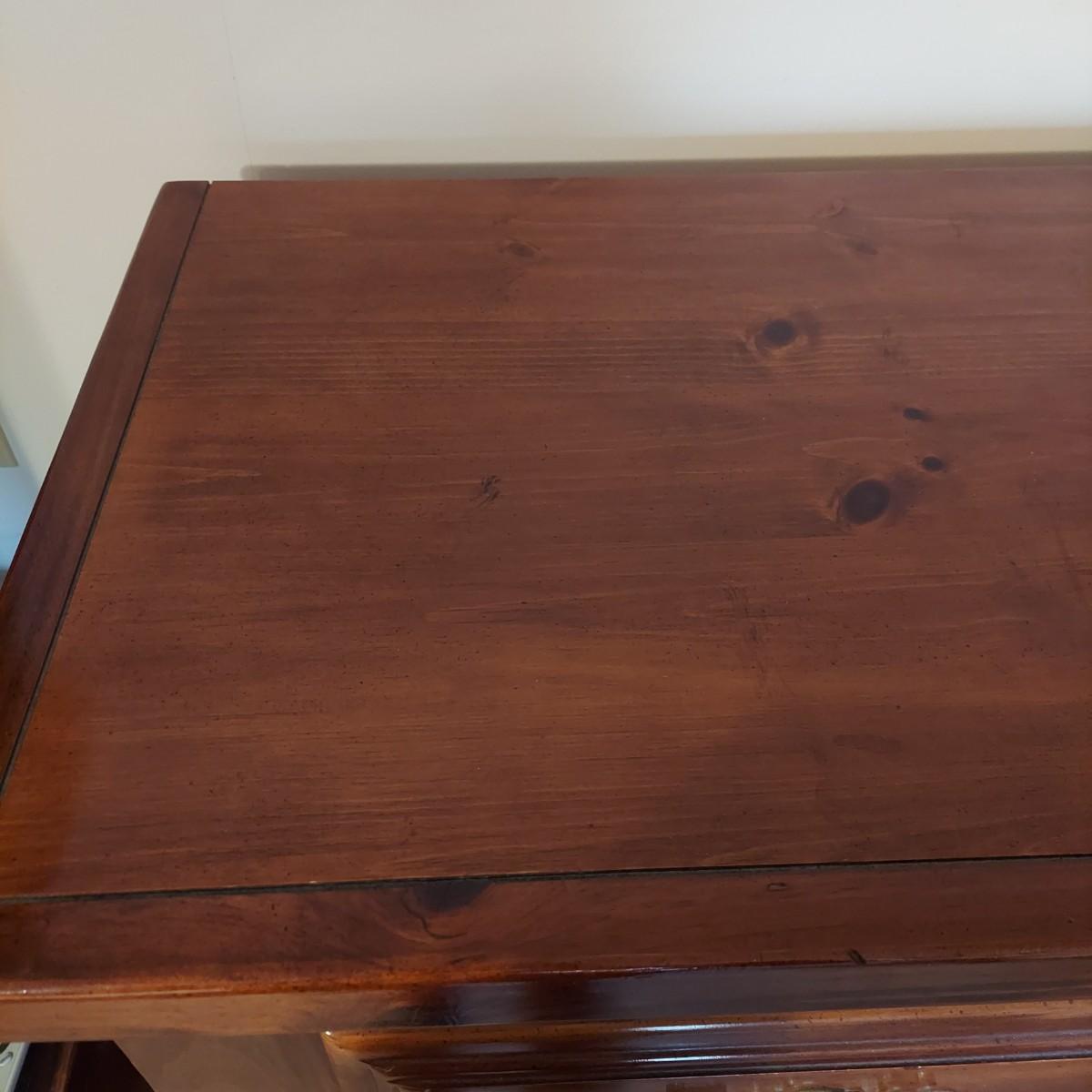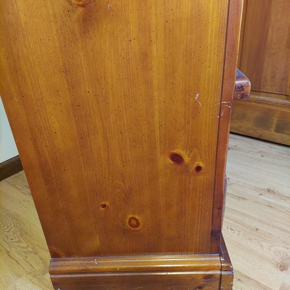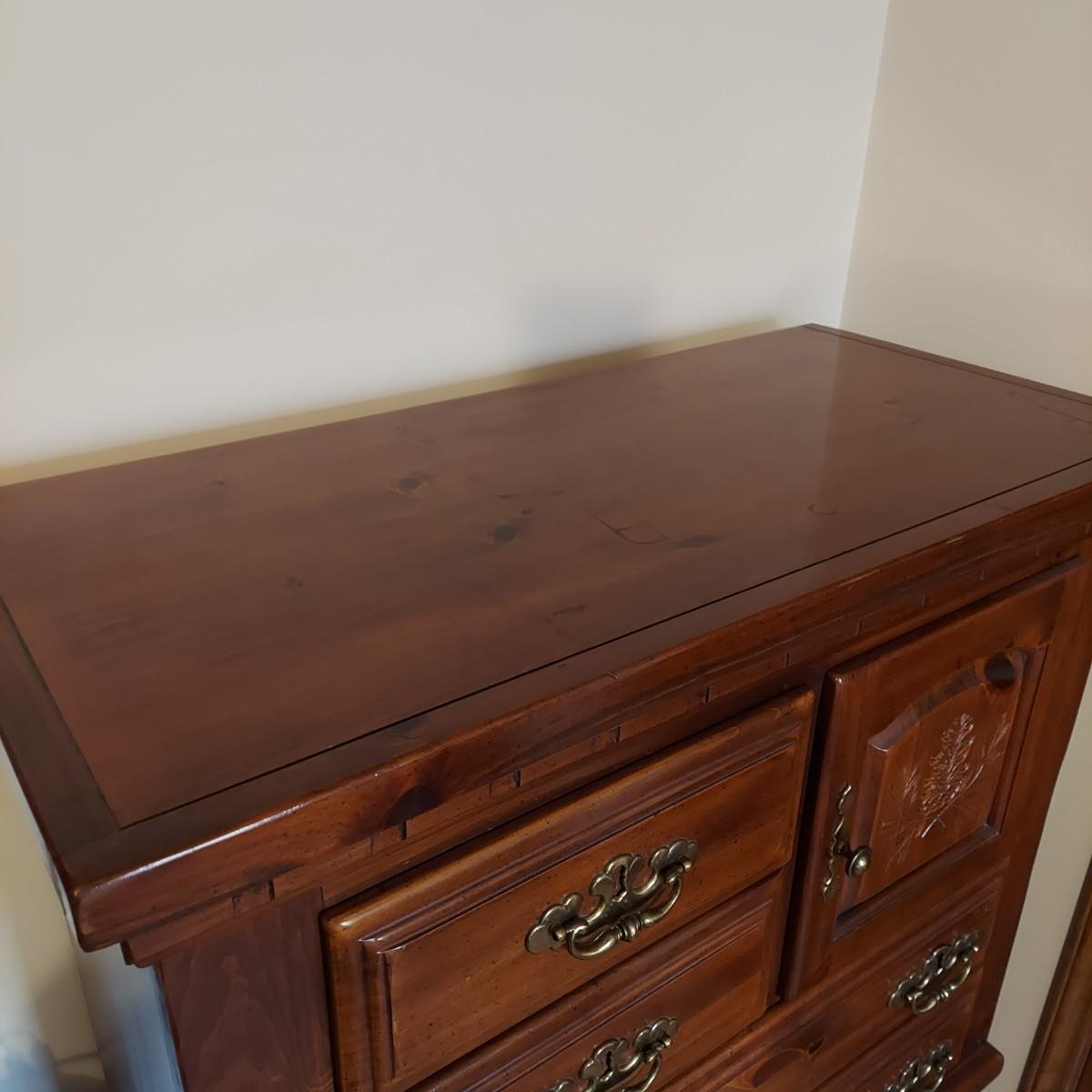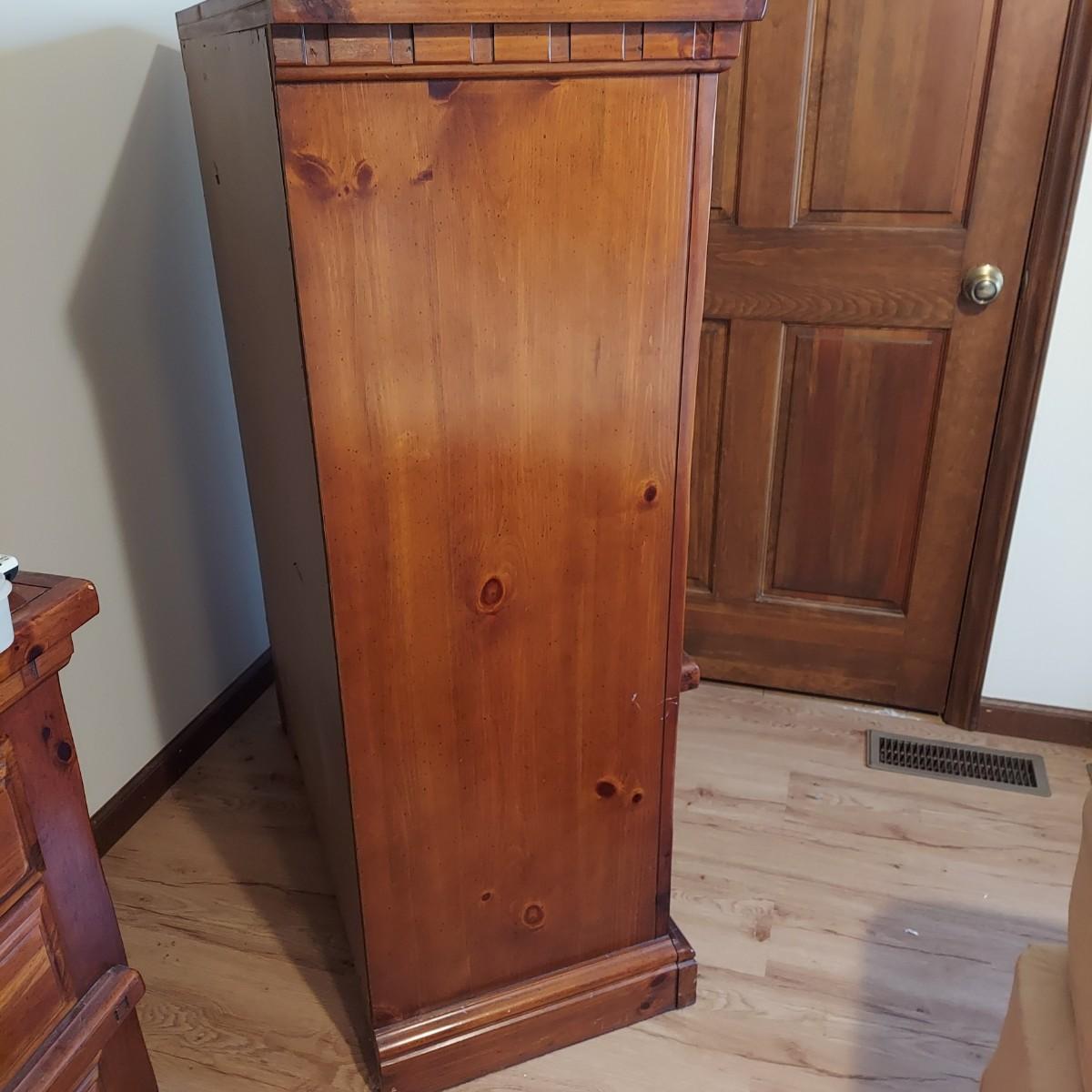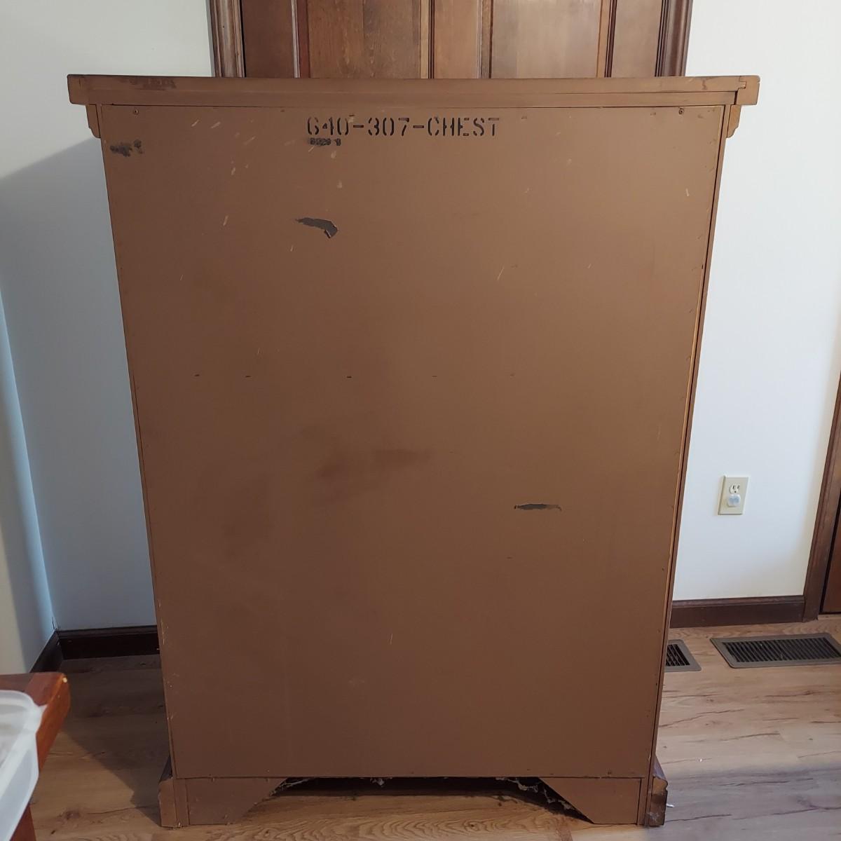 This tall solid wood dresser is Link-Taylor brand. The style is Whispering Pines. There are 4 large drawers, two small drawers and a small cabinet door. It measures approximately 40" x 19" x 54.5"H. This is part of a bedroom set. Other pieces available in other lots. Local Pickup Only. Winning bidder must bring assistance to help move and load this item due to its weight and/or size.