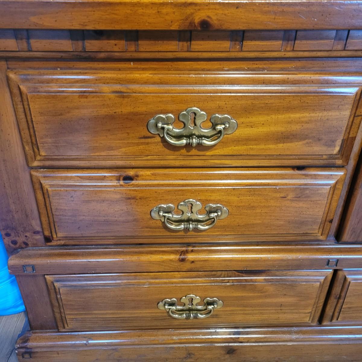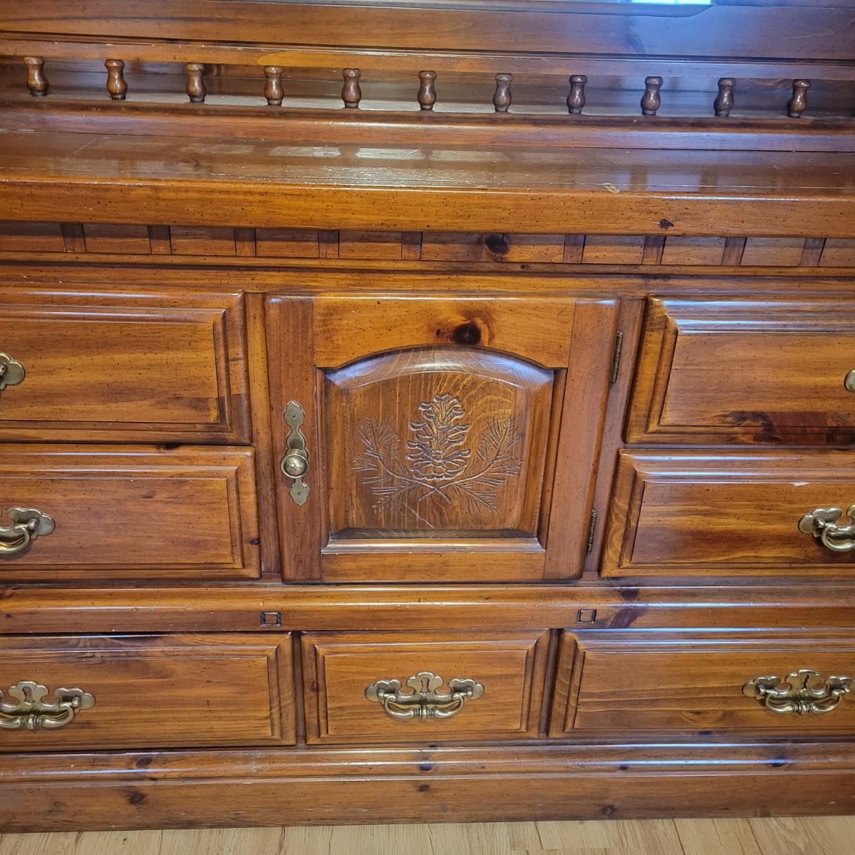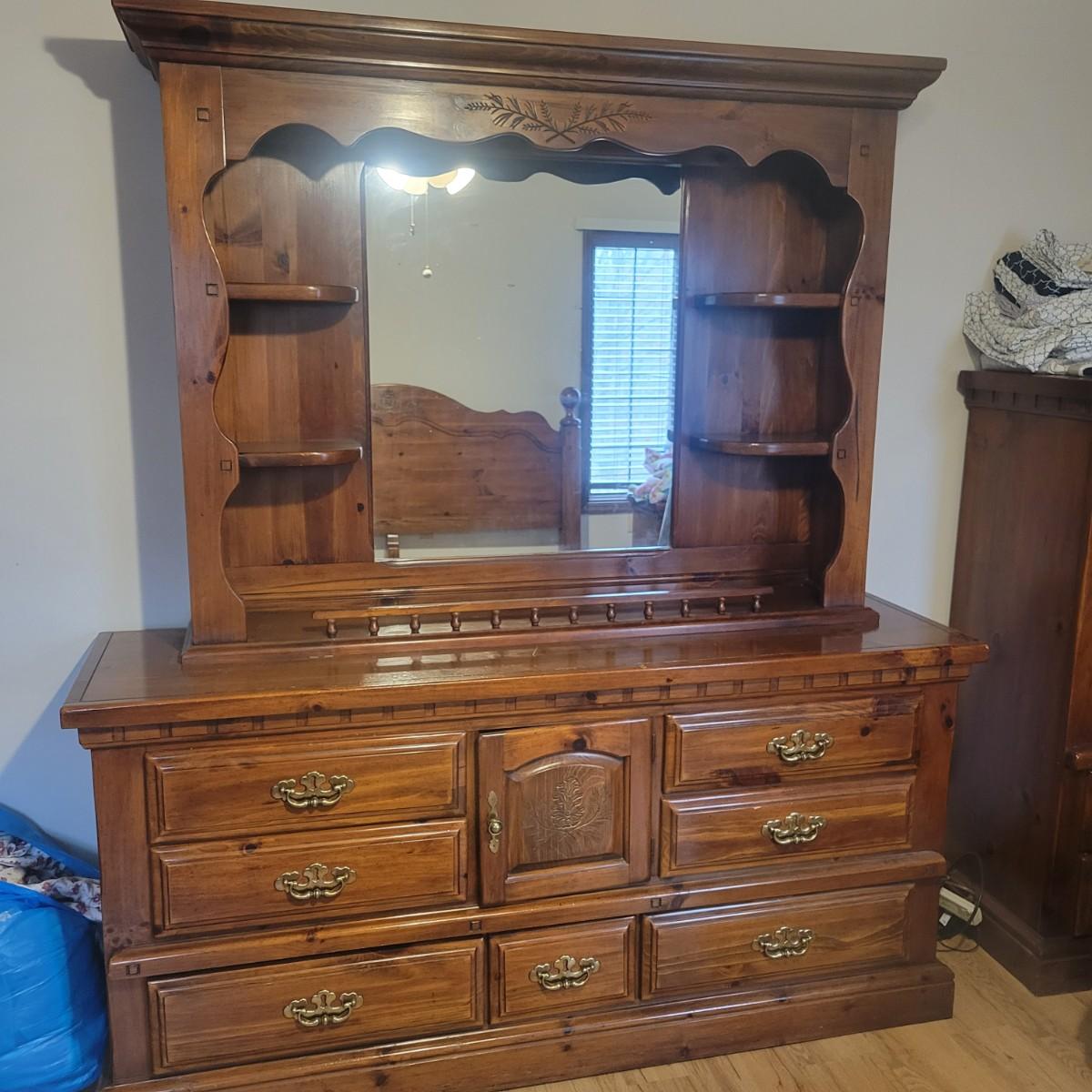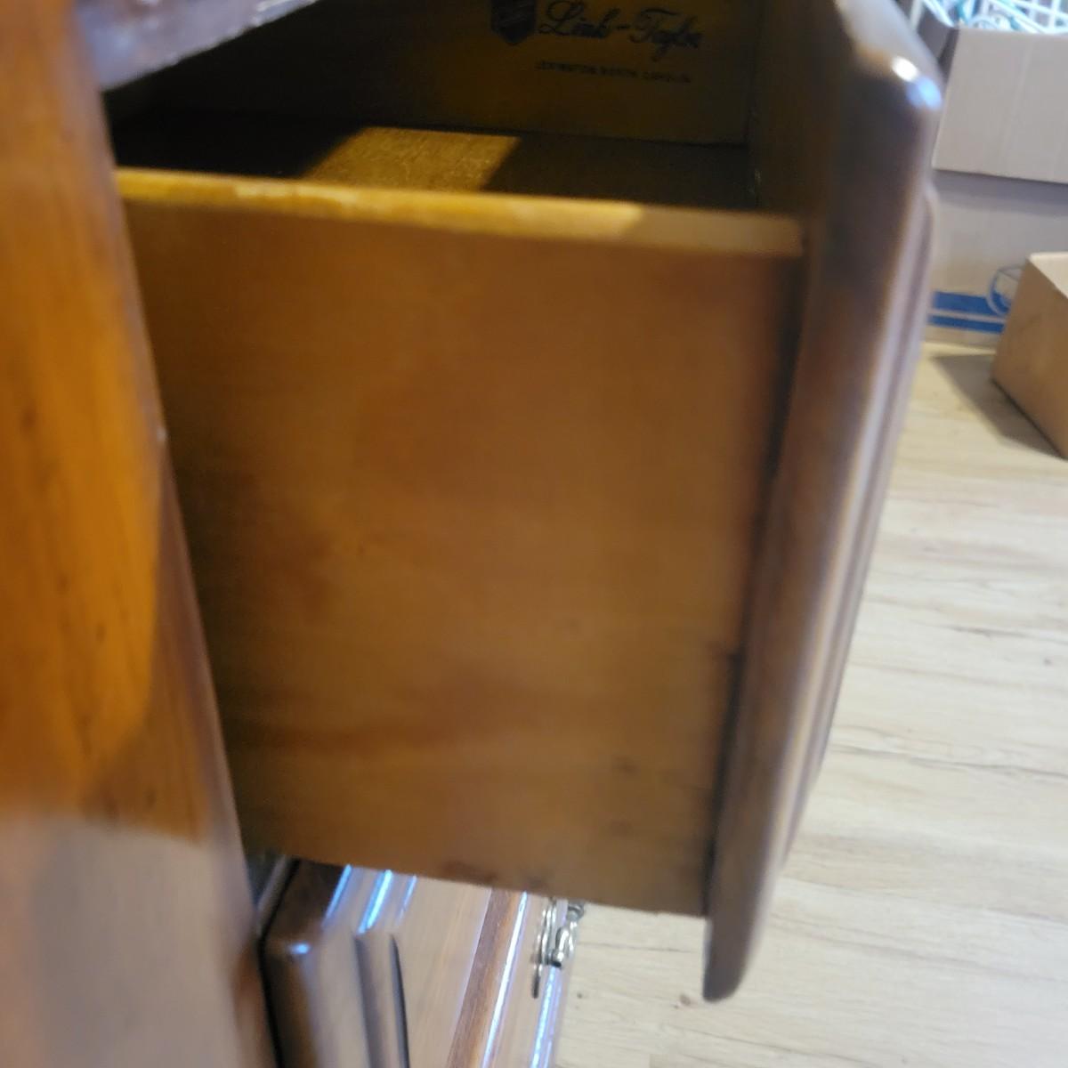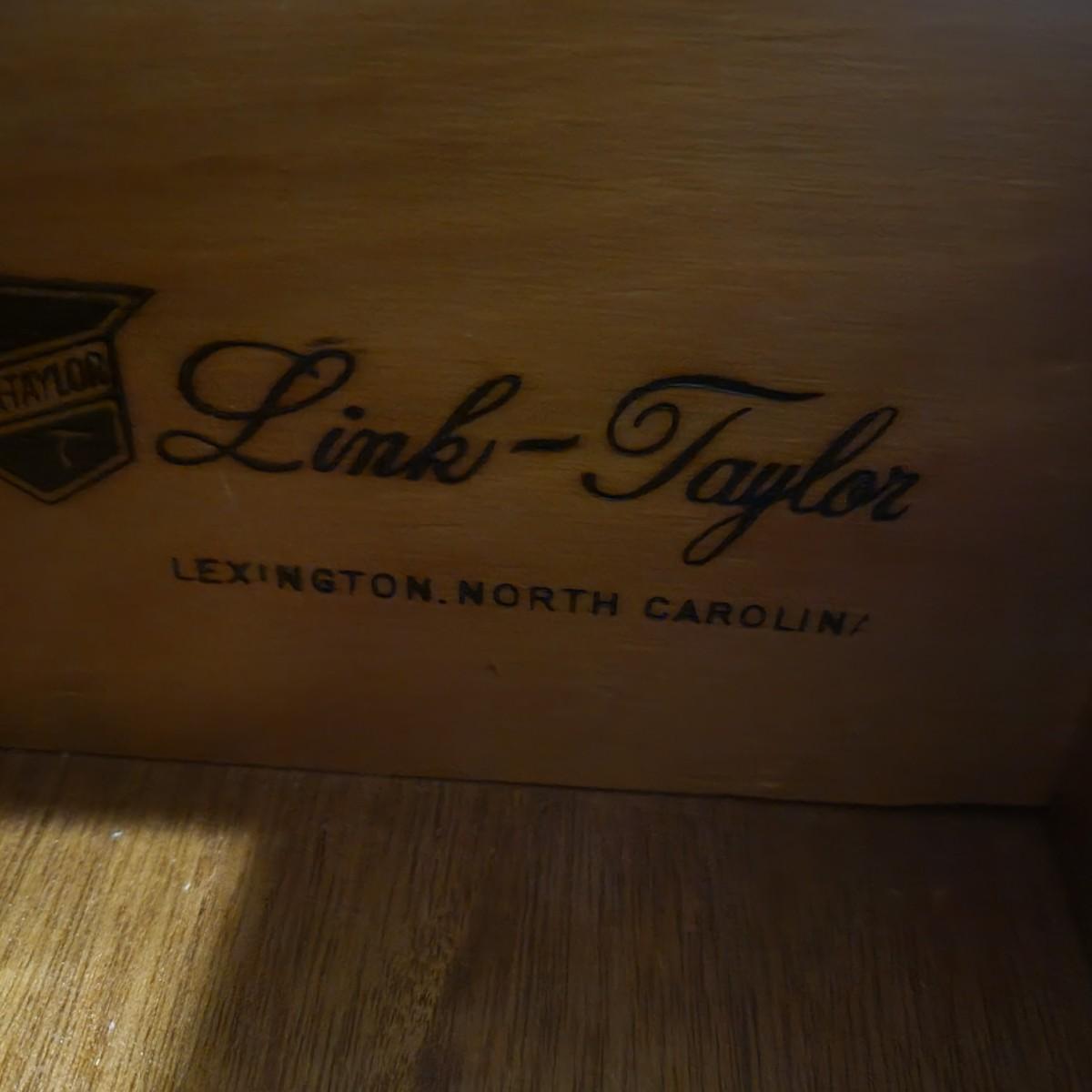 A Link-Tayor dresser with a detachable mirror. Dresser features seven drawers and a small cabinet, and has brass hardware. The mirror is able to be separated from the dresser with a flathead screw driver. Measures approximately 70" x 18" x 78"H. This piece has some scratches and blemishes, see photos for more detail. Local pickup only. Winning bidder must bring assistance to help move and load this item due to its weight and/or size.