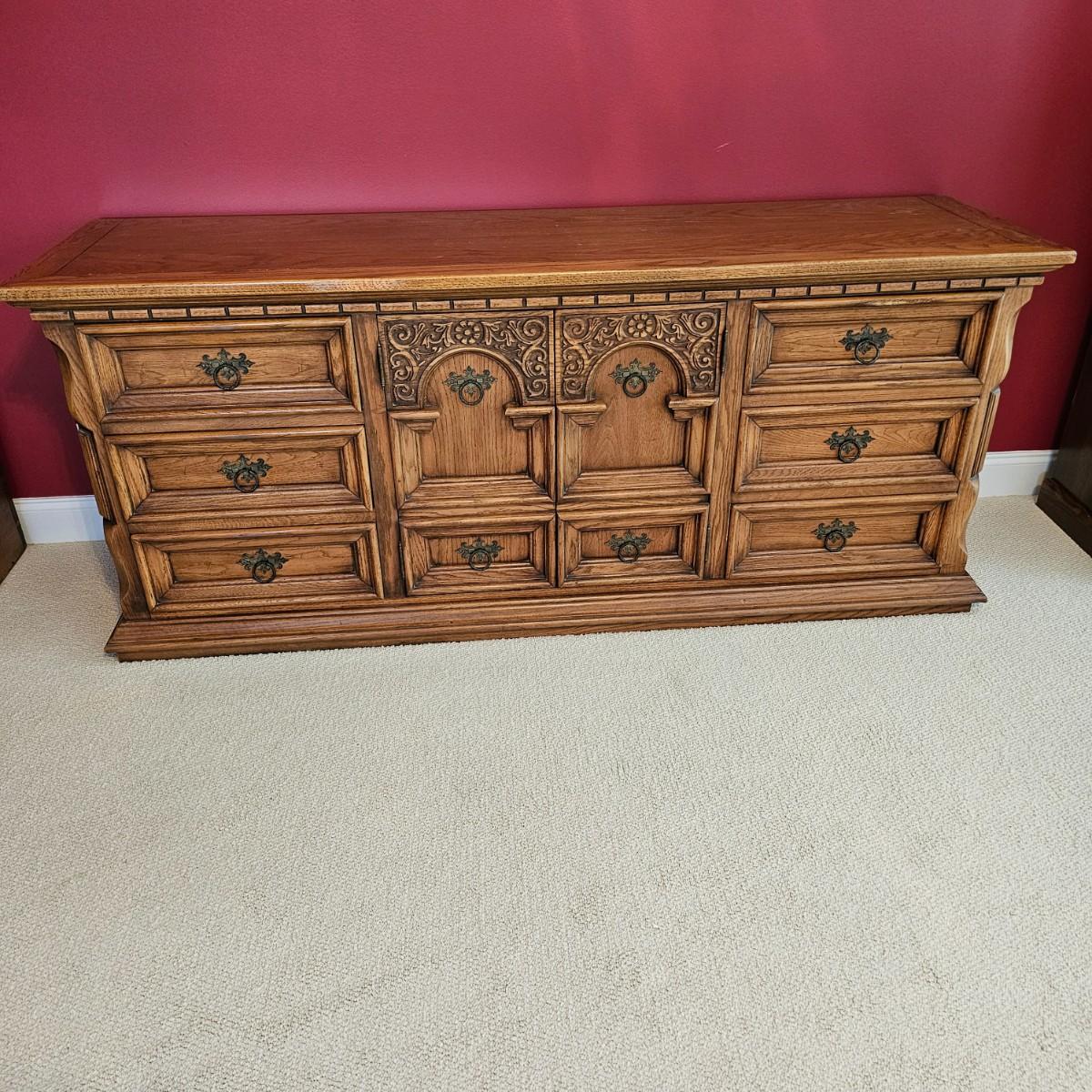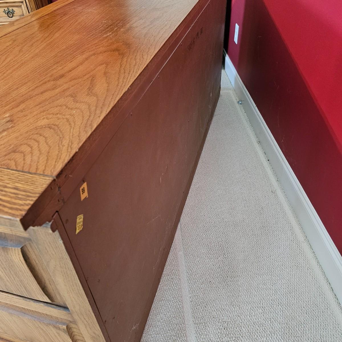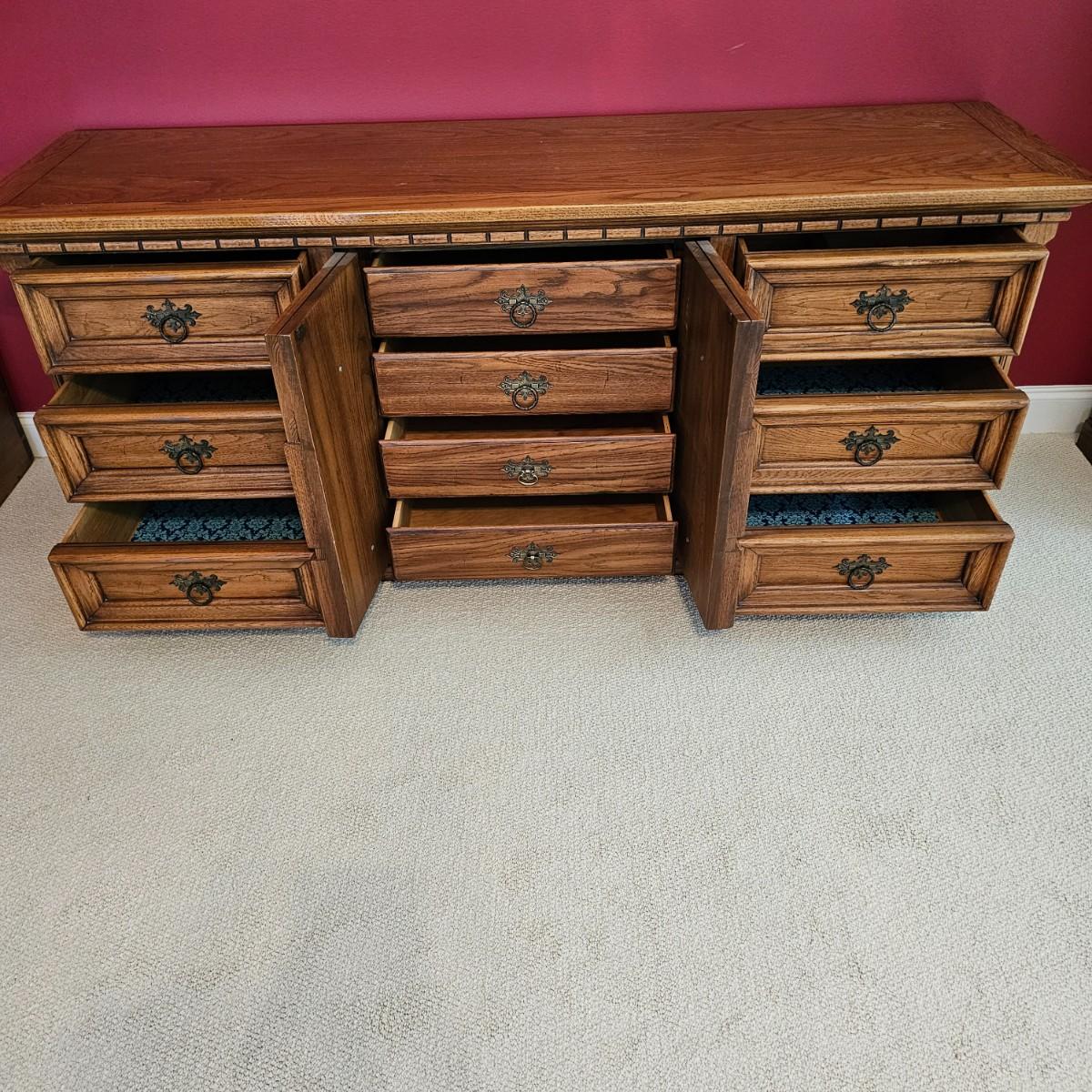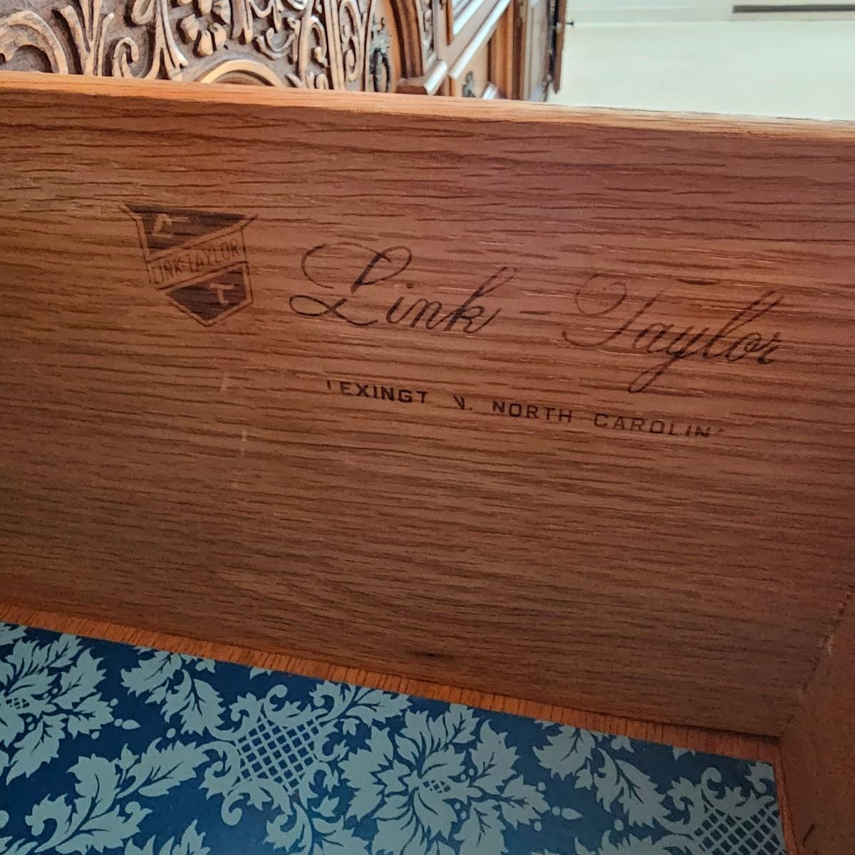 Long, low multi drawer dresser by Link-Taylor. Dresser has three drawers each side and four drawers inside closed doors in center. All drawer joints are dovetailed. Note two bottom drawer pulls in center do not match. Item measures 21.5" x 76" x 32"H. Minor scuffs on top. Also see other matching Link-Taylor furniture in this auction. See photos for details. Local pickup only. Winning bidder must bring assistance to help move and load this item due to its weight and/or size.
