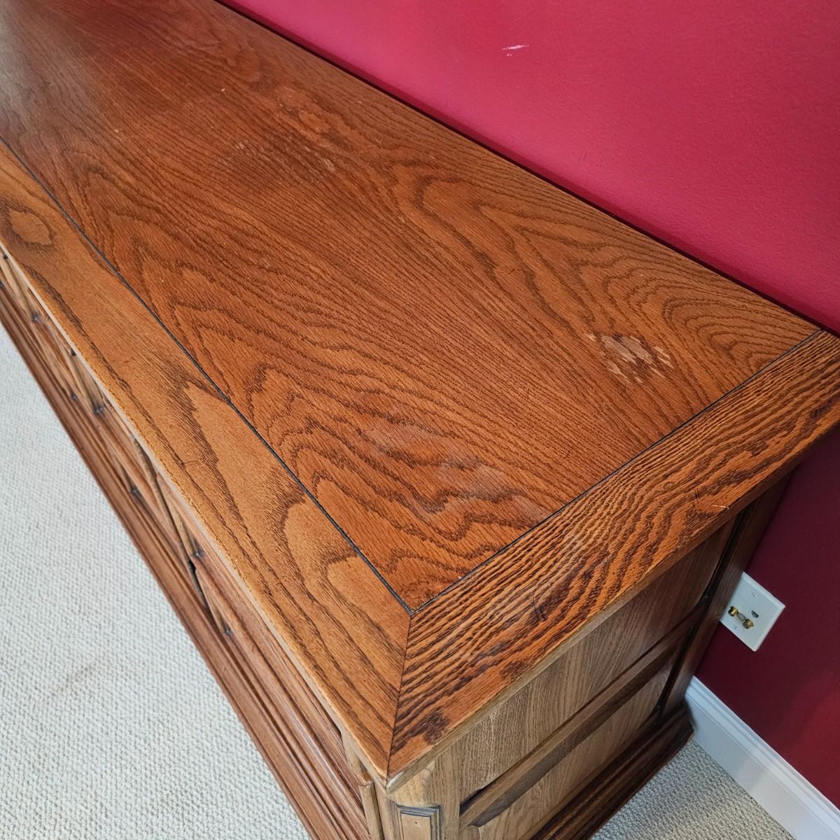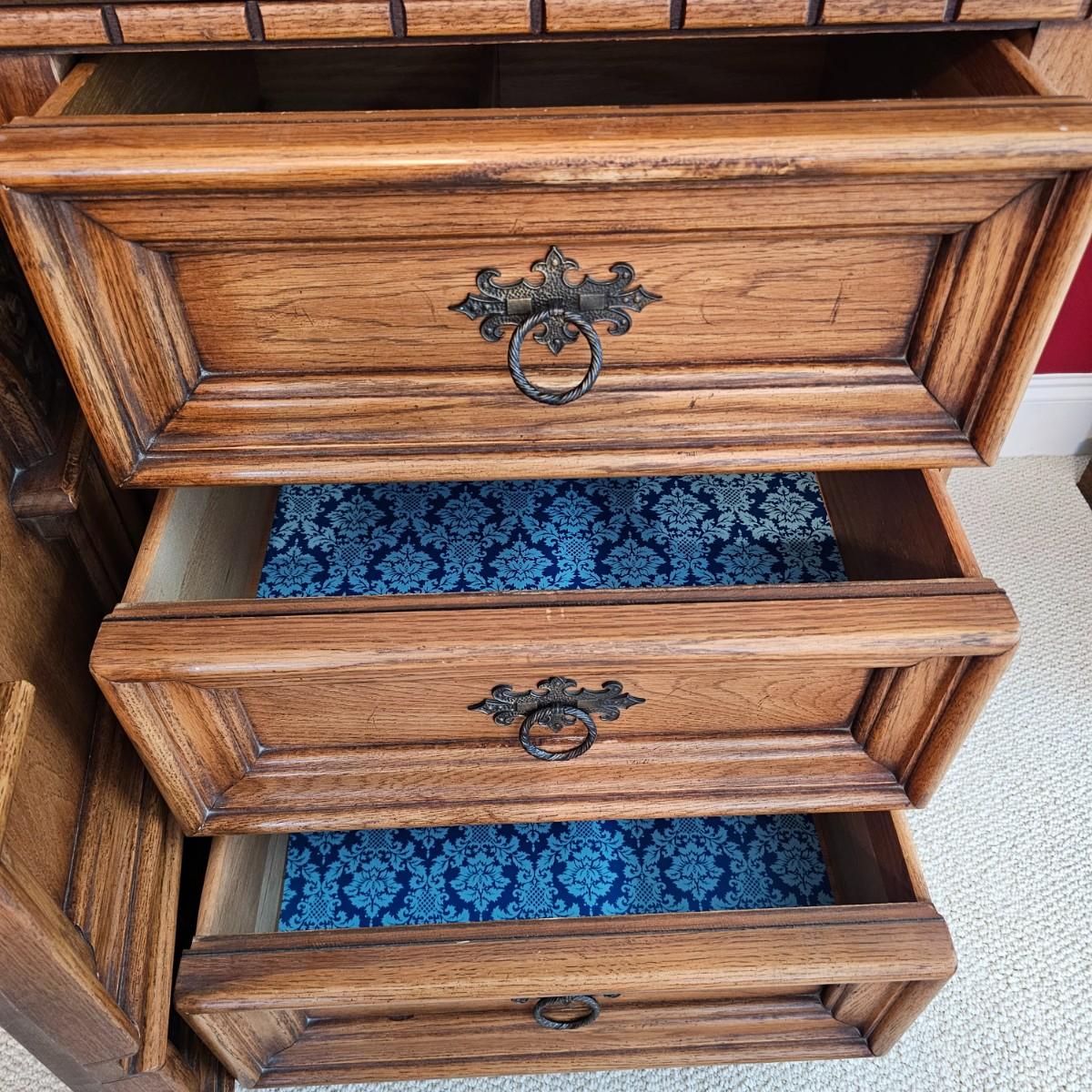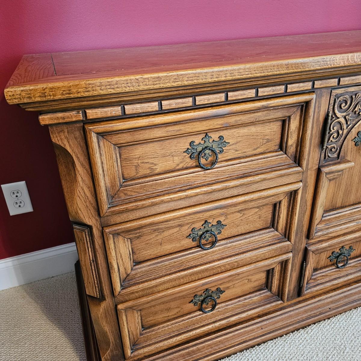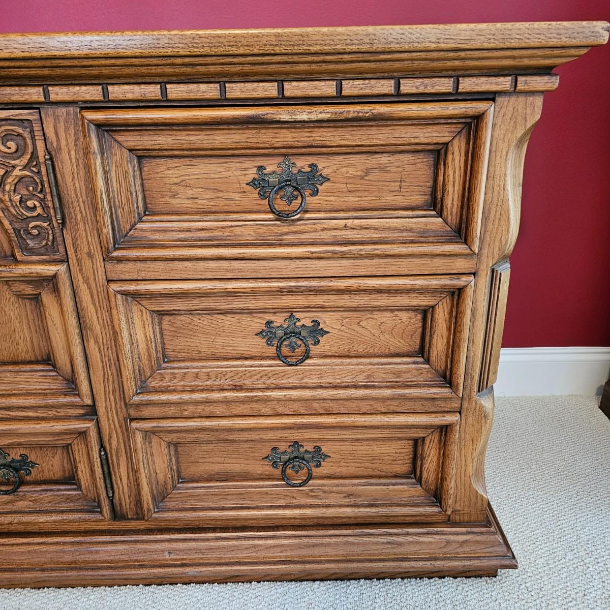 Long, low multi drawer dresser by Link-Taylor. Dresser has three drawers each side and four drawers inside closed doors in center. All drawer joints are dovetailed. Note two bottom drawer pulls in center do not match. Item measures 21.5" x 76" x 32"H. Minor scuffs on top. Also see other matching Link-Taylor furniture in this auction. See photos for details. Local pickup only. Winning bidder must bring assistance to help move and load this item due to its weight and/or size.