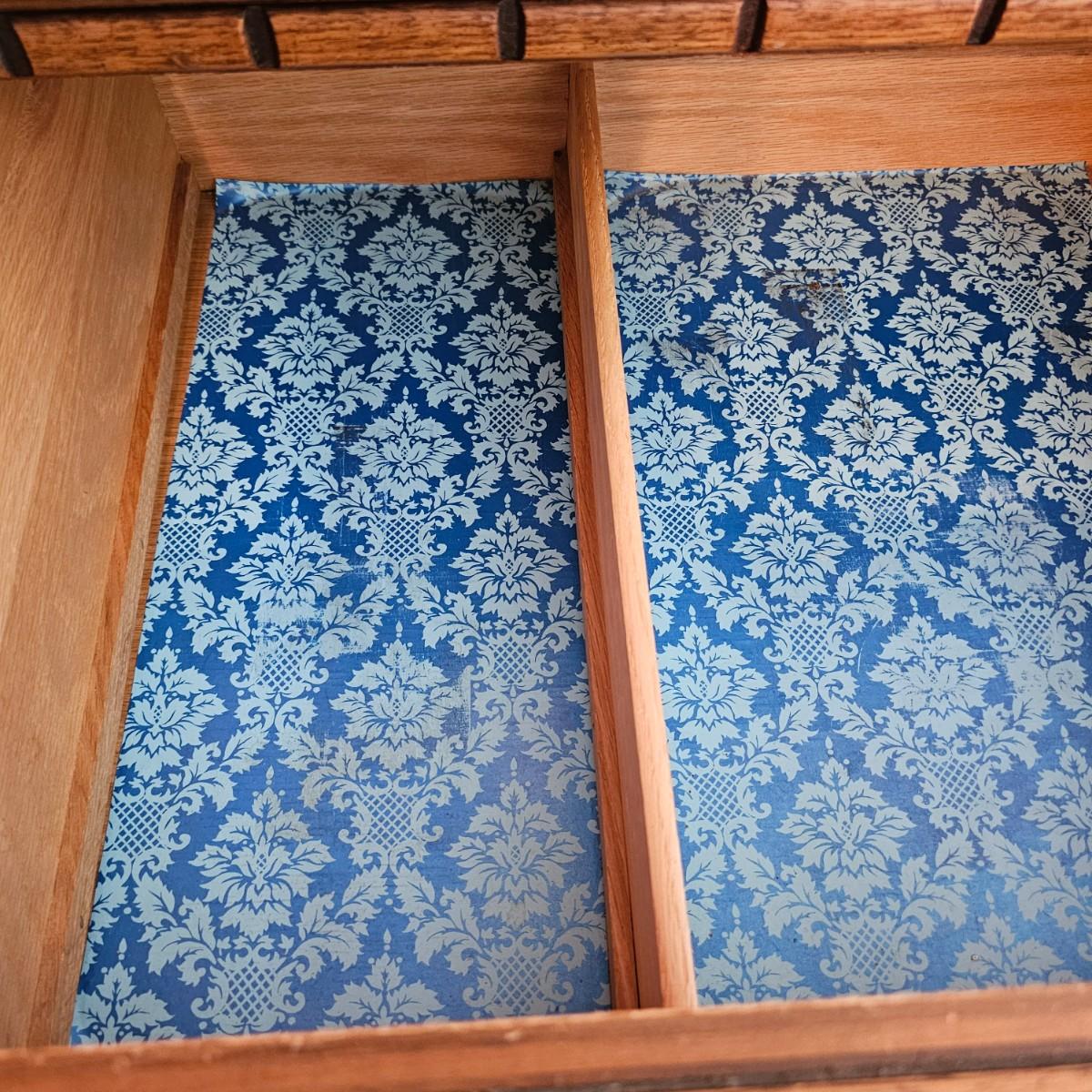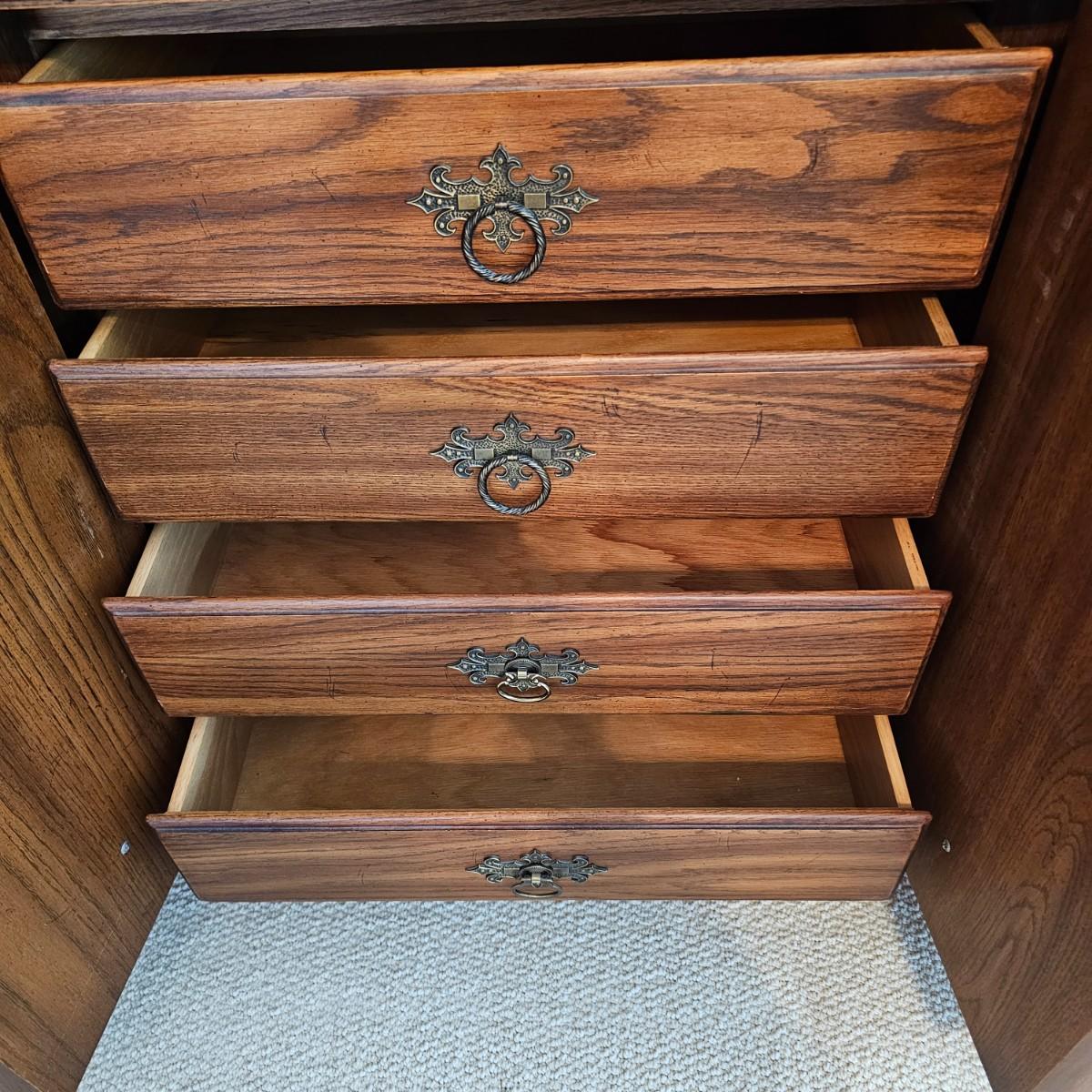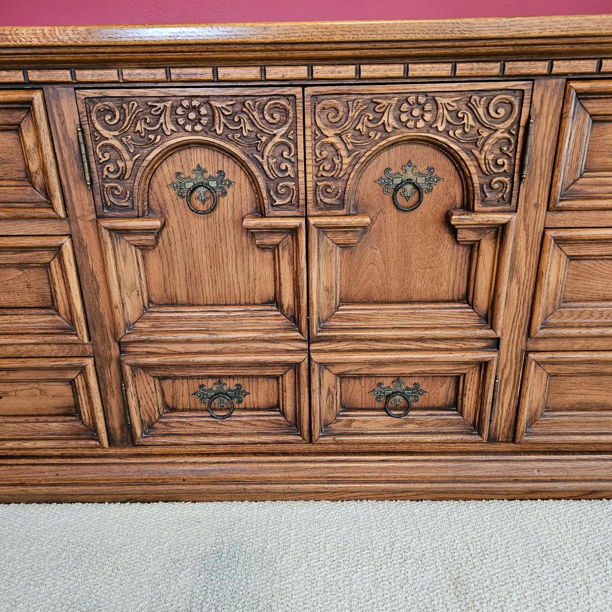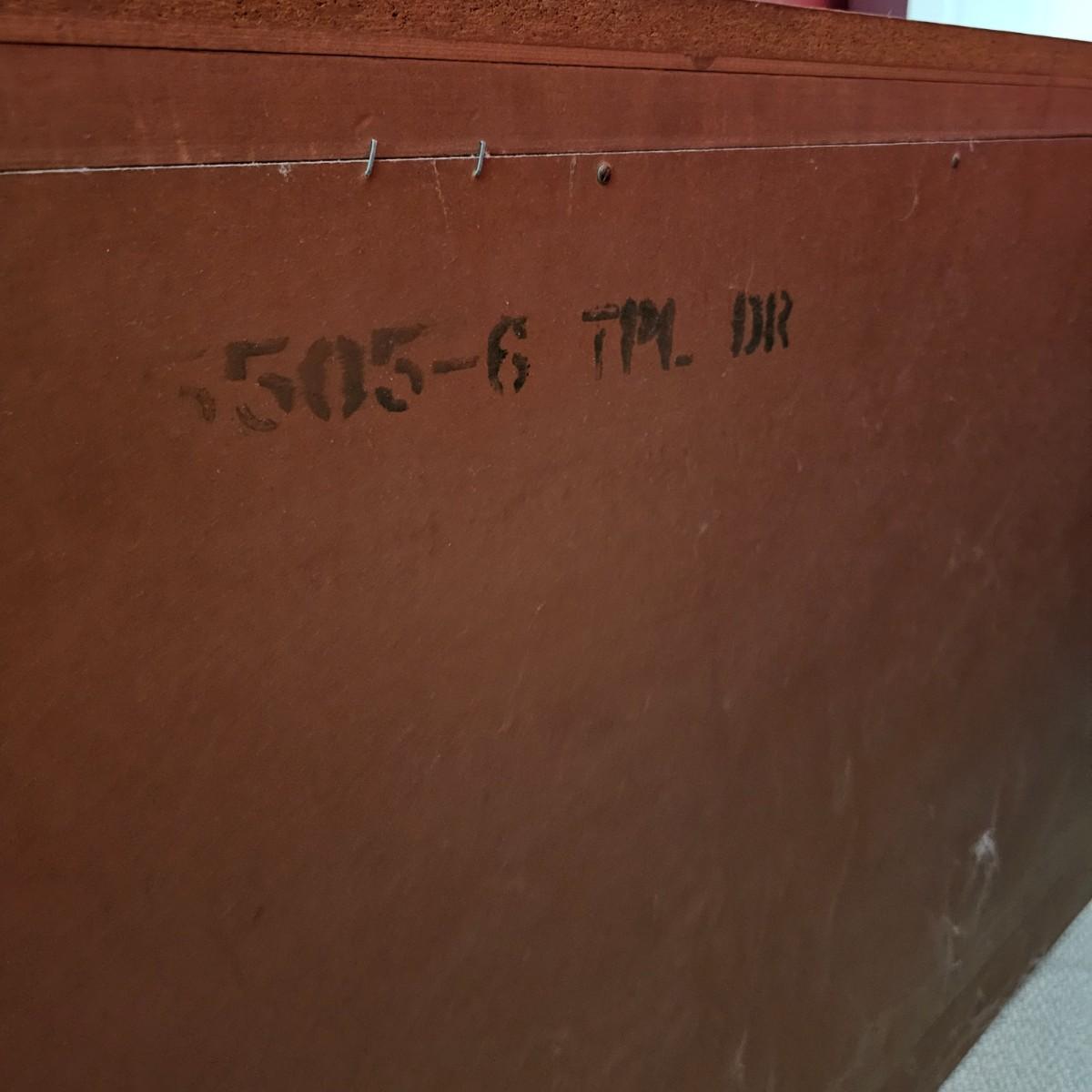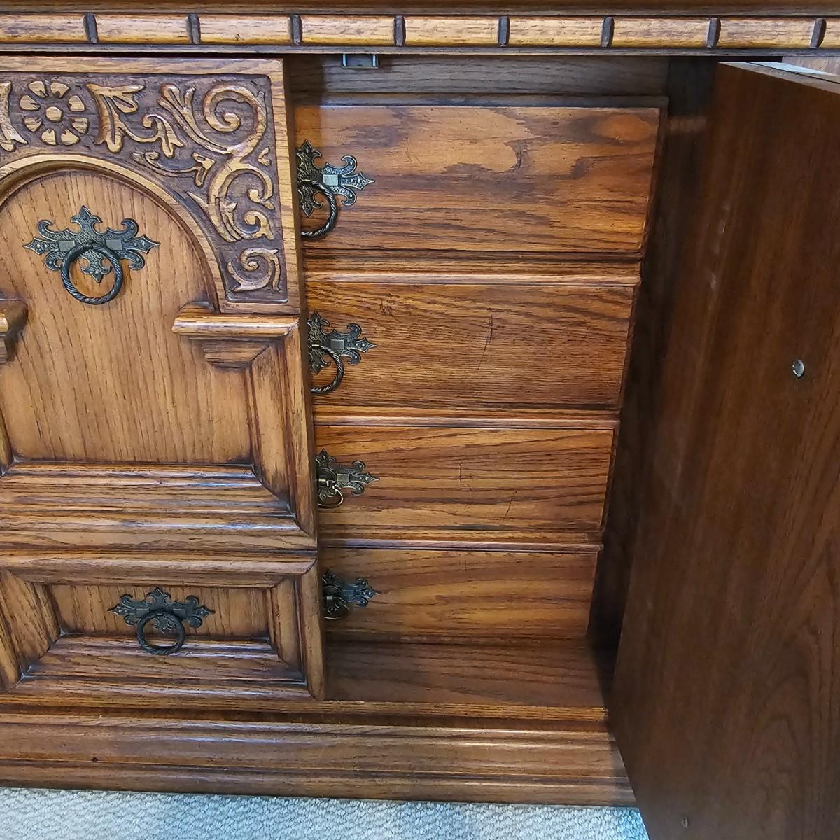 Long, low multi drawer dresser by Link-Taylor. Dresser has three drawers each side and four drawers inside closed doors in center. All drawer joints are dovetailed. Note two bottom drawer pulls in center do not match. Item measures 21.5" x 76" x 32"H. Minor scuffs on top. Also see other matching Link-Taylor furniture in this auction. See photos for details. Local pickup only. Winning bidder must bring assistance to help move and load this item due to its weight and/or size.