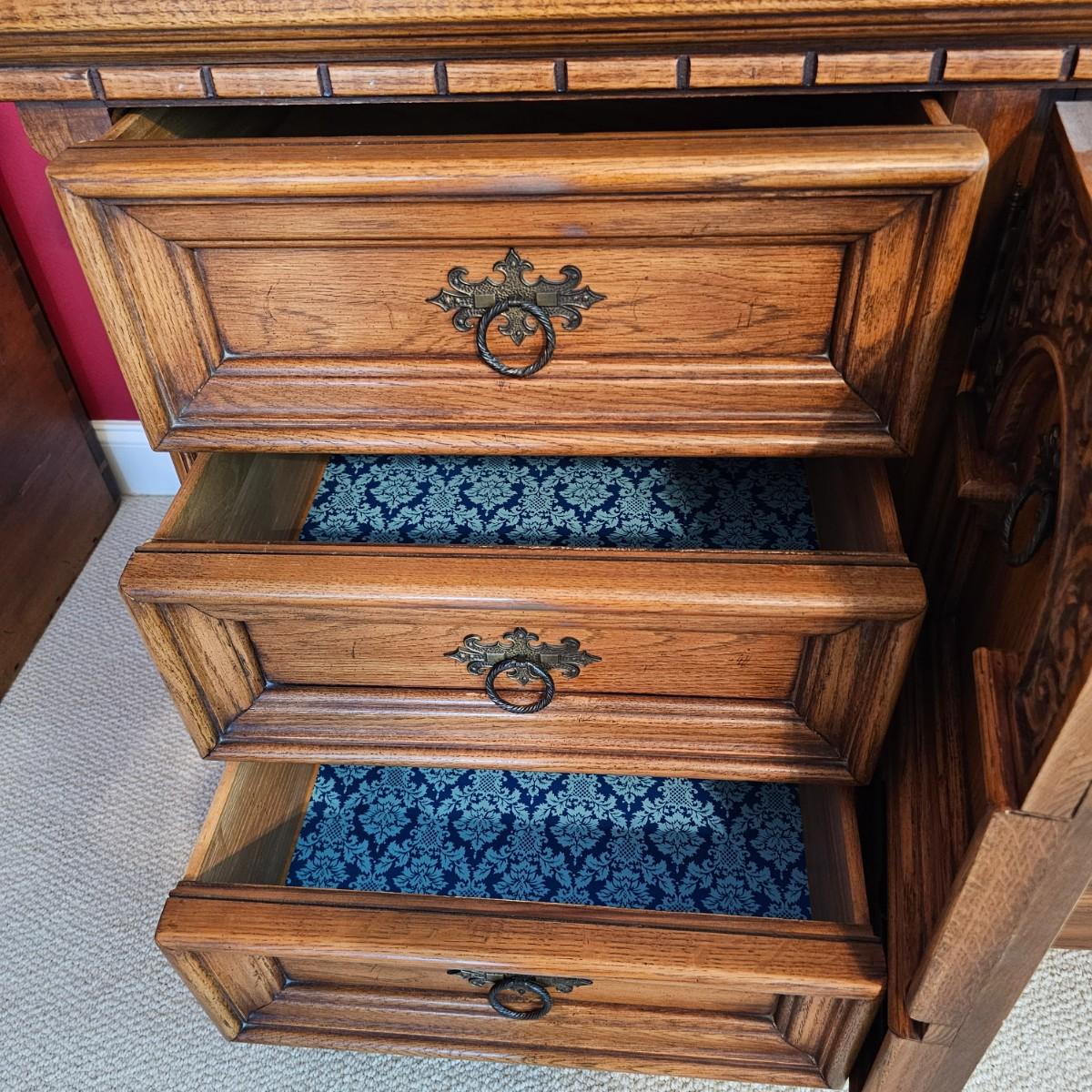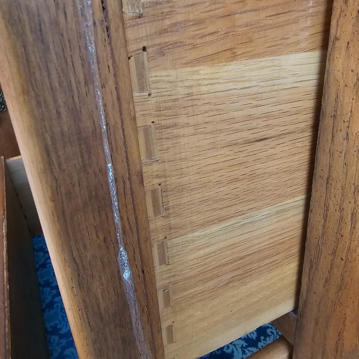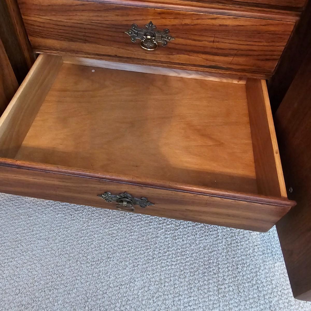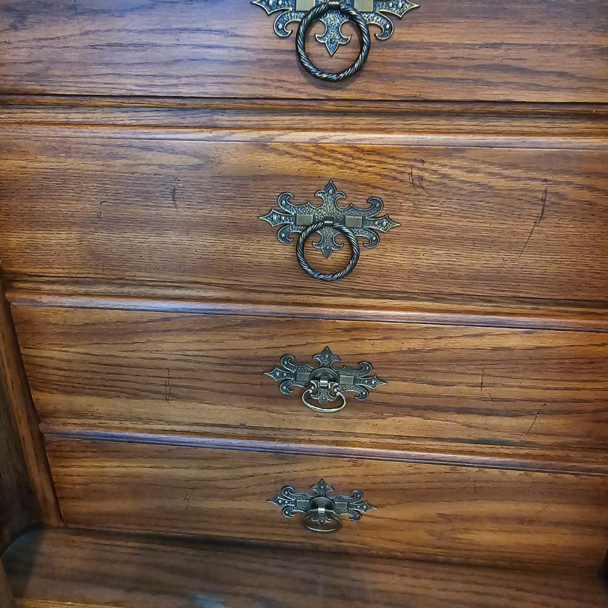 Long, low multi drawer dresser by Link-Taylor. Dresser has three drawers each side and four drawers inside closed doors in center. All drawer joints are dovetailed. Note two bottom drawer pulls in center do not match. Item measures 21.5" x 76" x 32"H. Minor scuffs on top. Also see other matching Link-Taylor furniture in this auction. See photos for details. Local pickup only. Winning bidder must bring assistance to help move and load this item due to its weight and/or size.