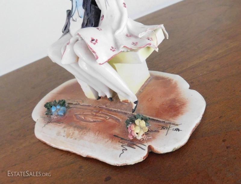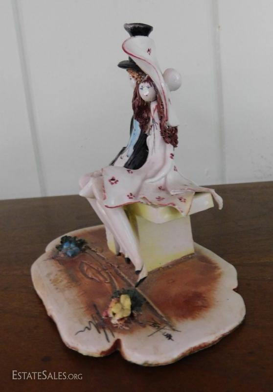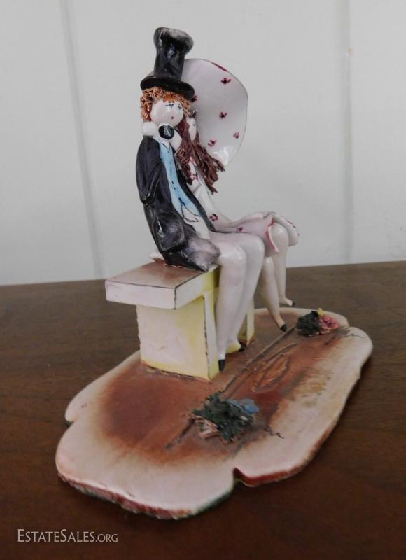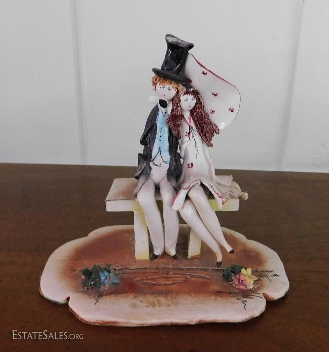 Italian artist Lino Zampiva clay figurine of couple sitting on bench. Item is in great condition with no visible chips or nicks. Shipping Available.