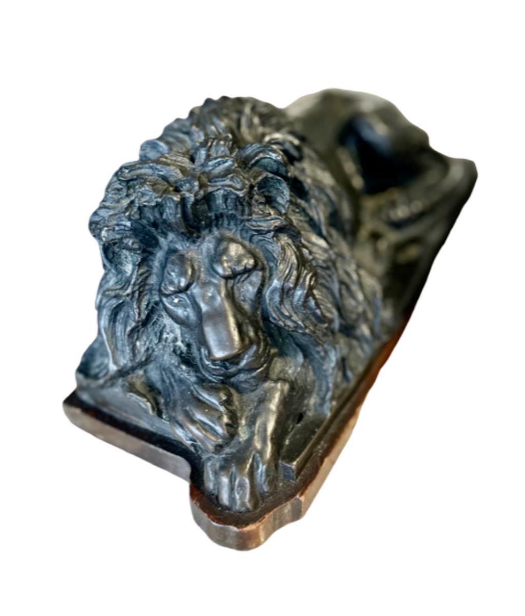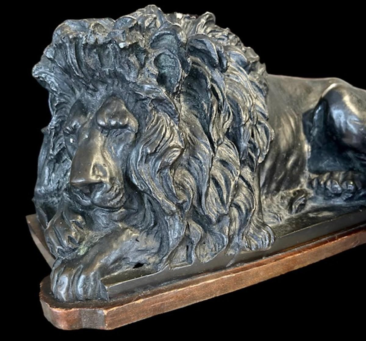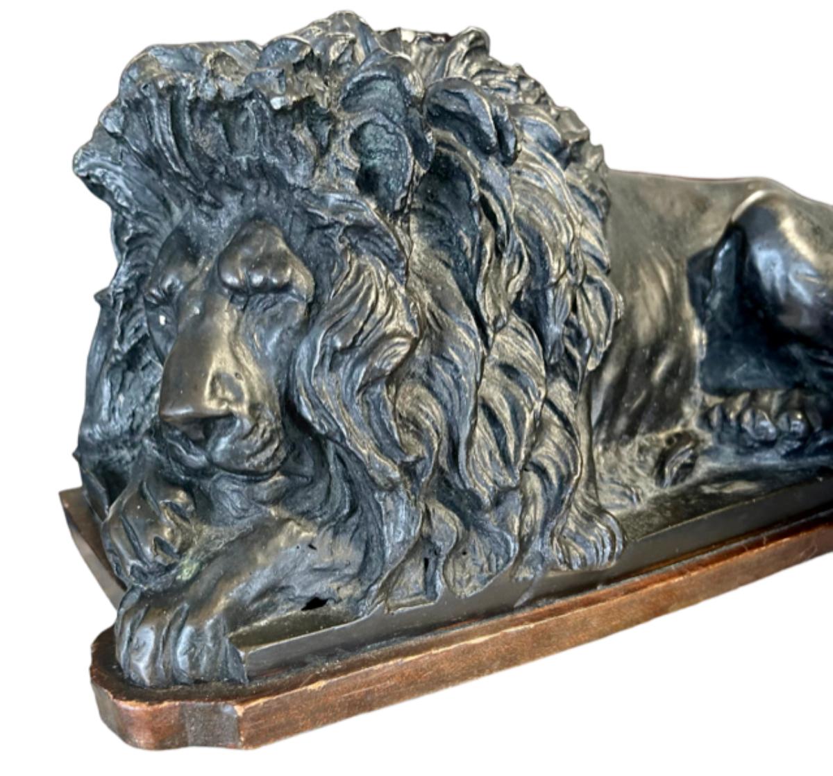 This is a British Bronze Figure of a Recumbent Lion on a wooden base.