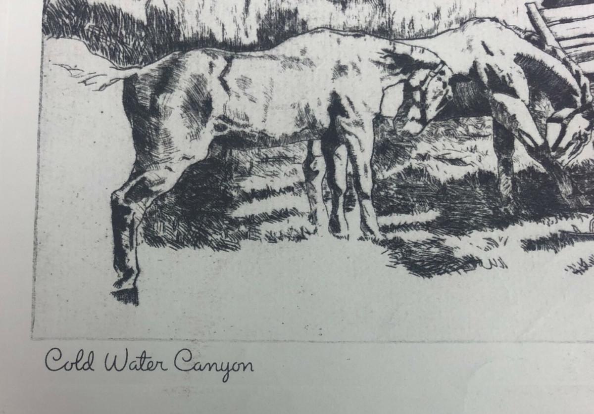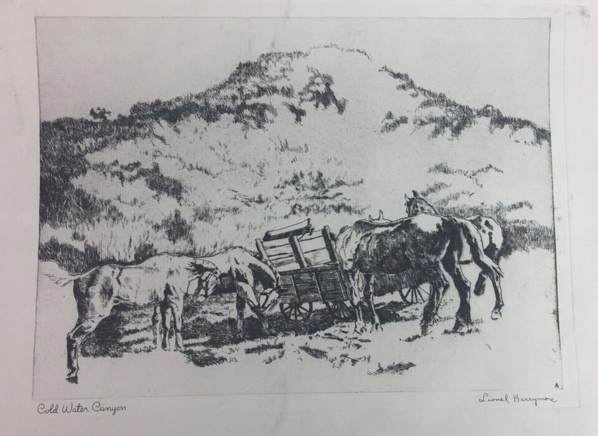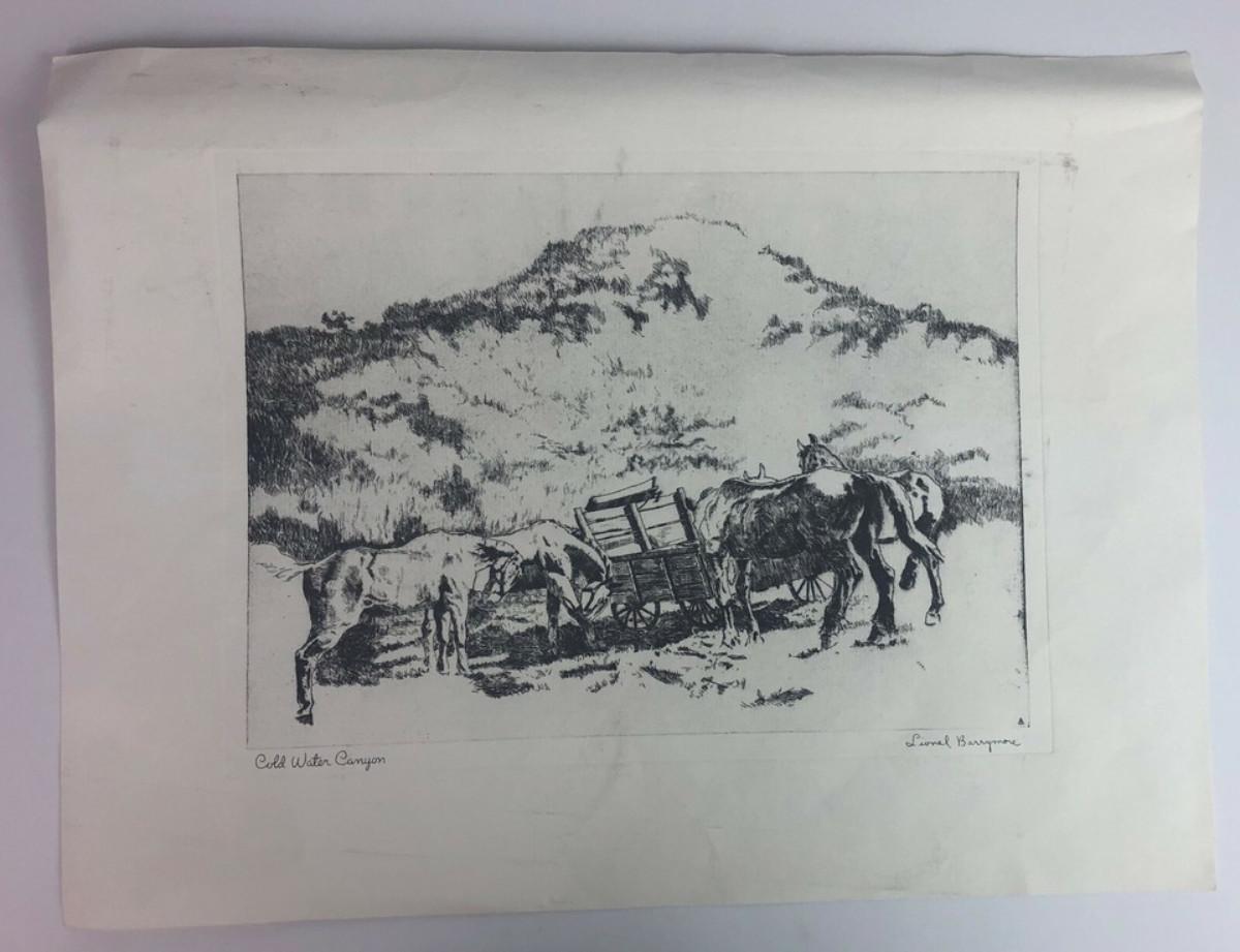From actor and artist, John Barrymore, here is one of his charcoal prints produced by Brown & Bigelow sometime between the mid-fifties and seventies...Suitable for framing...Image measures 11.5 x 8.5"...entitled "COLD WATER CANYON"...in California.