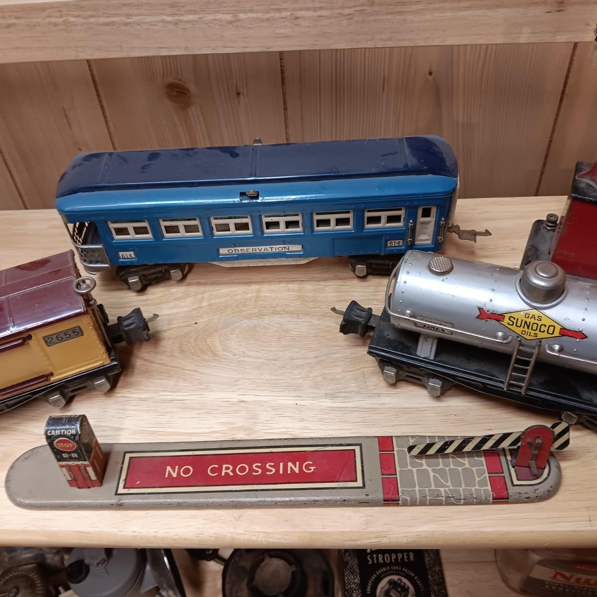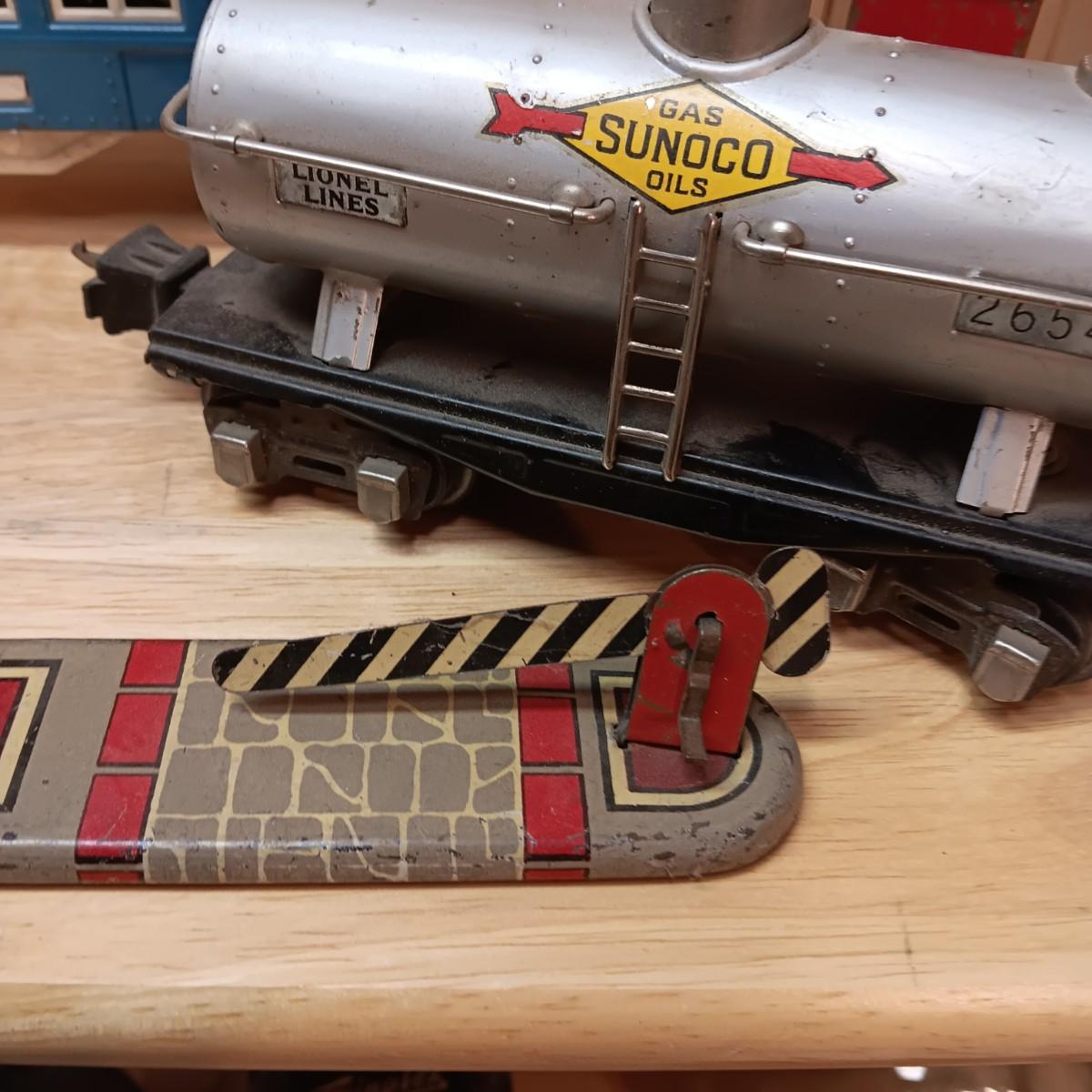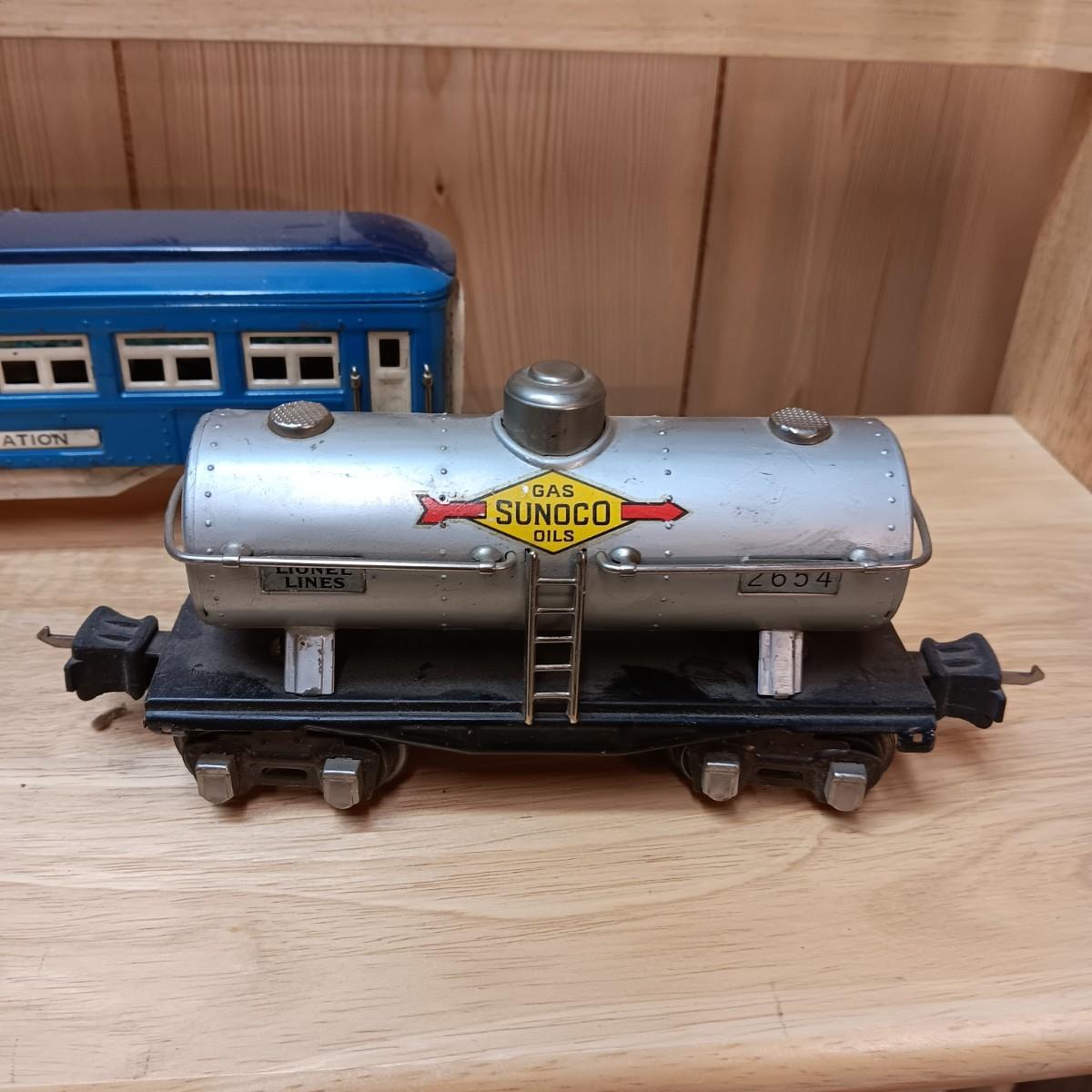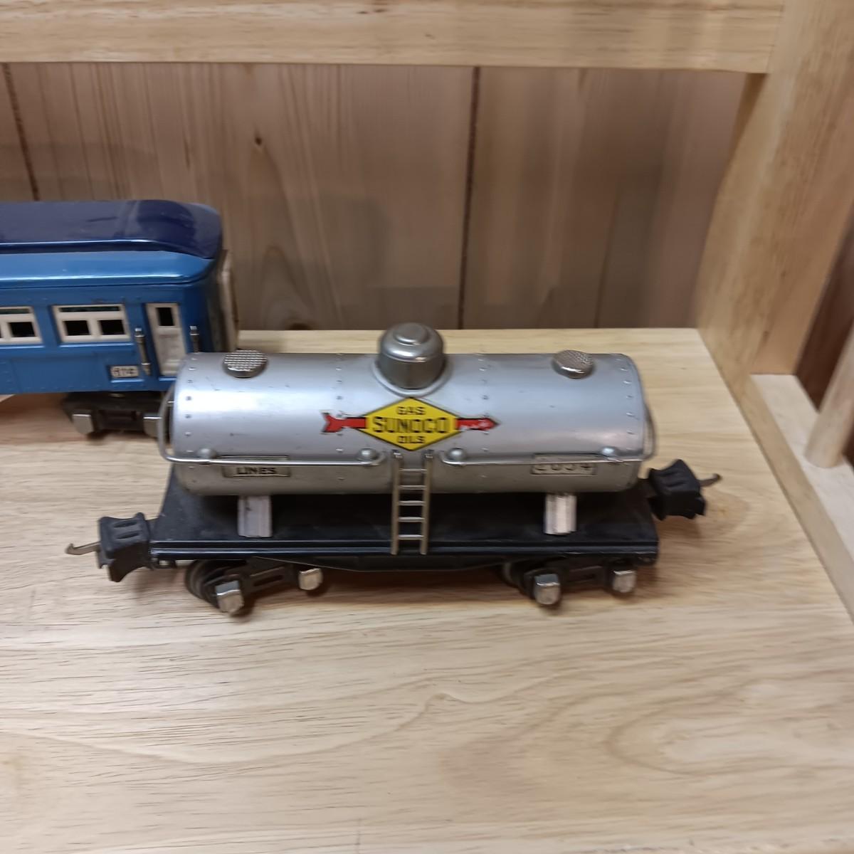 LIONEL BLUE COMET PASSENGER TRAIN, SUNOCO TANK CAR, A BOXCAR, RAILROAD LIGHT AND NO CROSSING