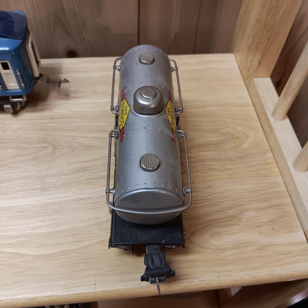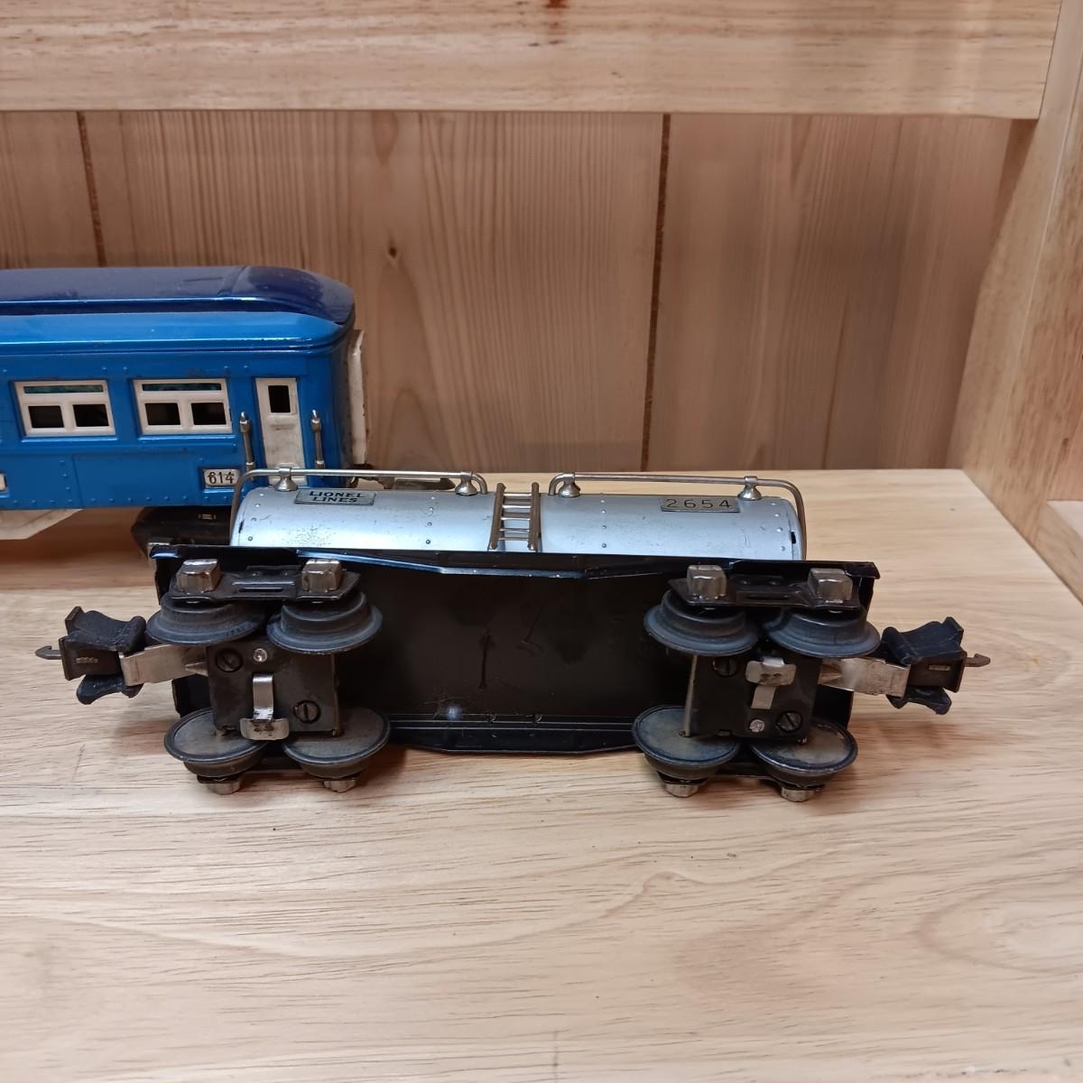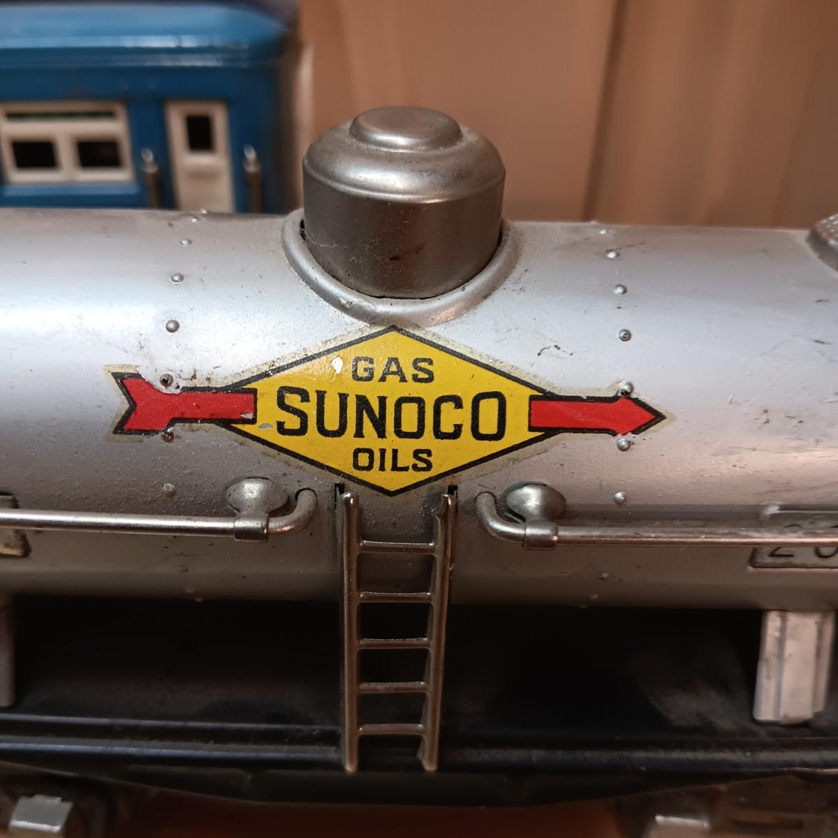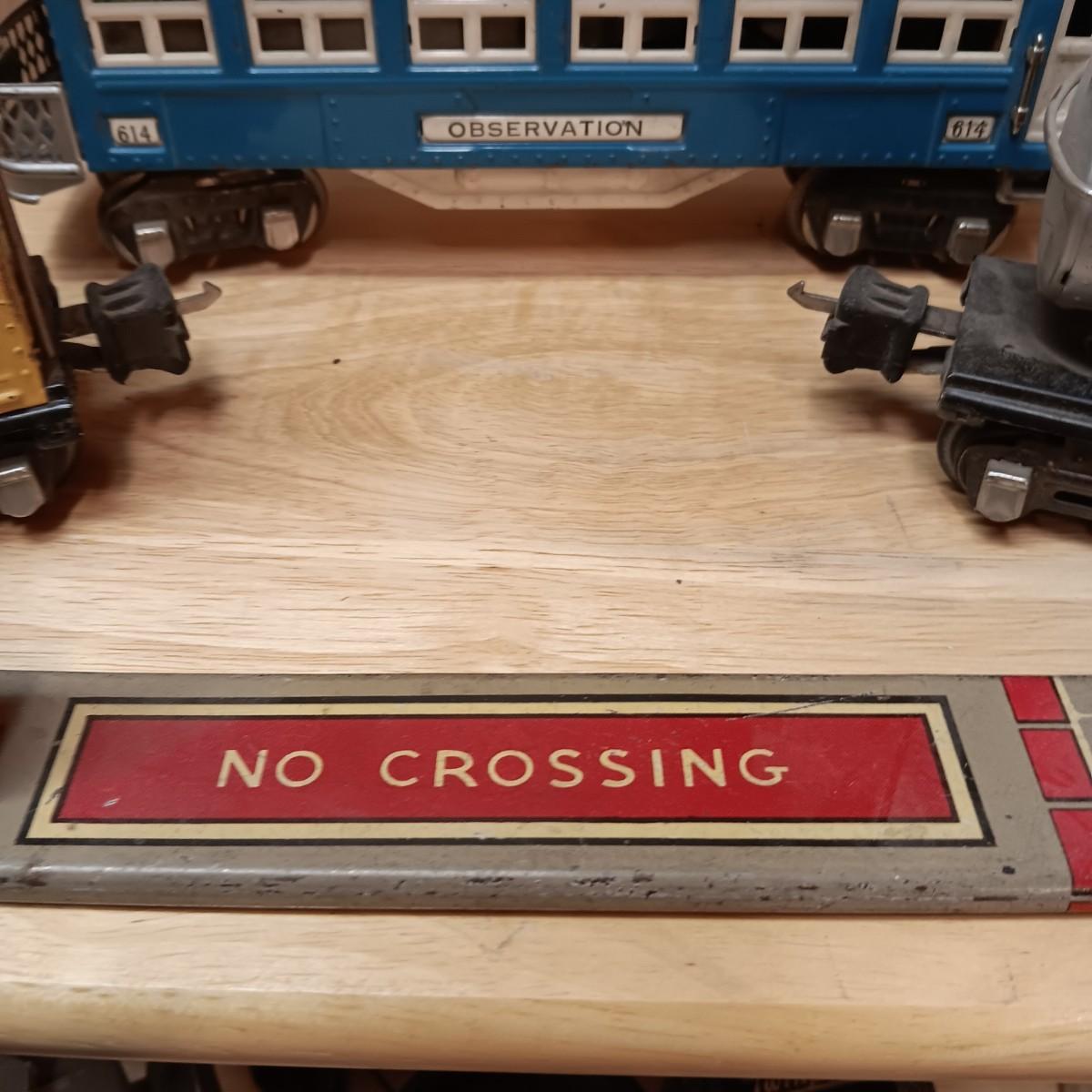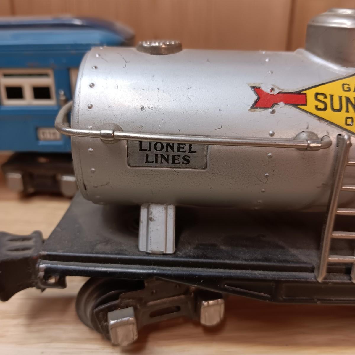 LIONEL BLUE COMET PASSENGER TRAIN, SUNOCO TANK CAR, A BOXCAR, RAILROAD LIGHT AND NO CROSSING