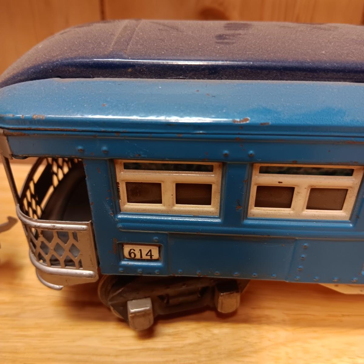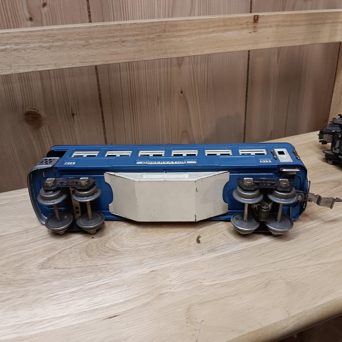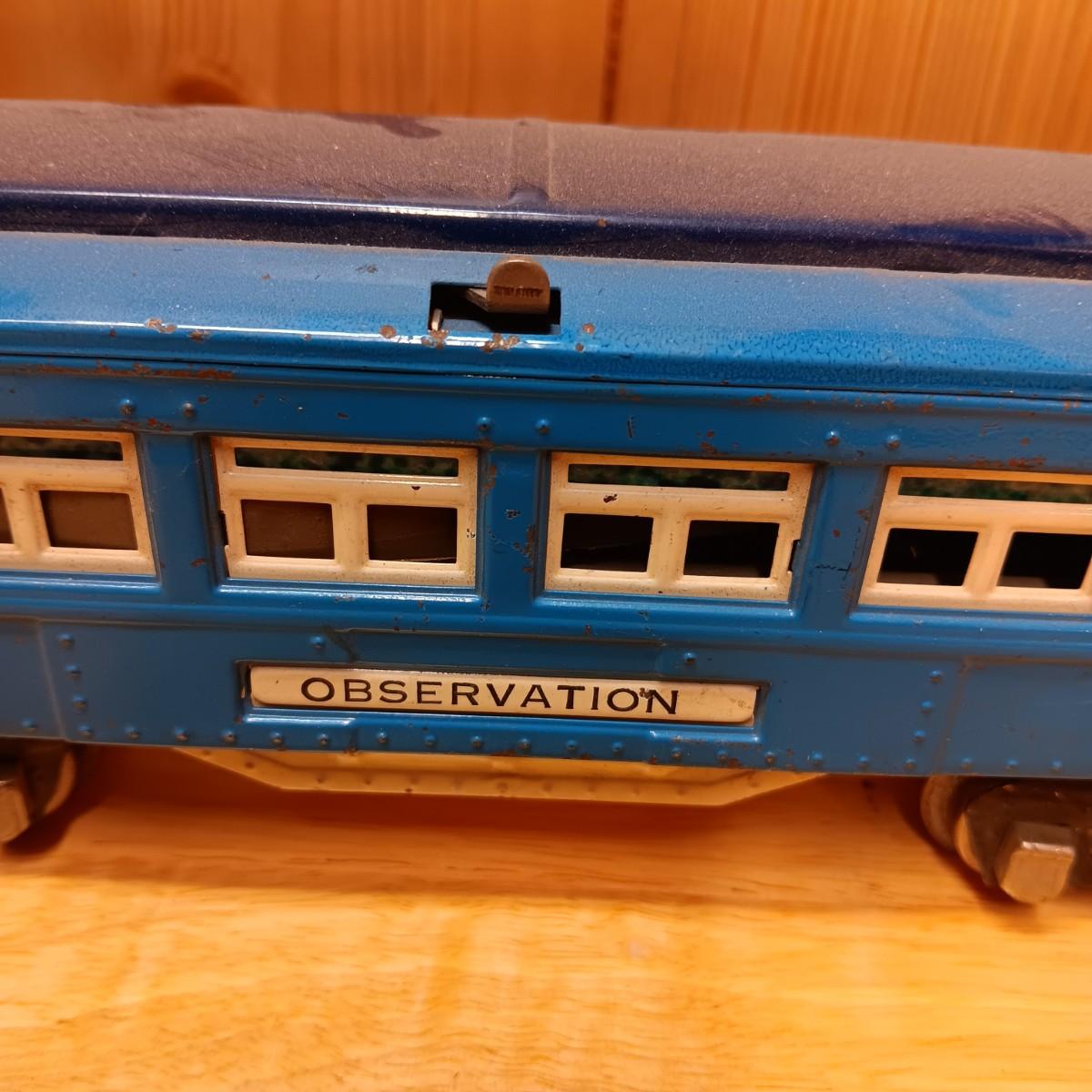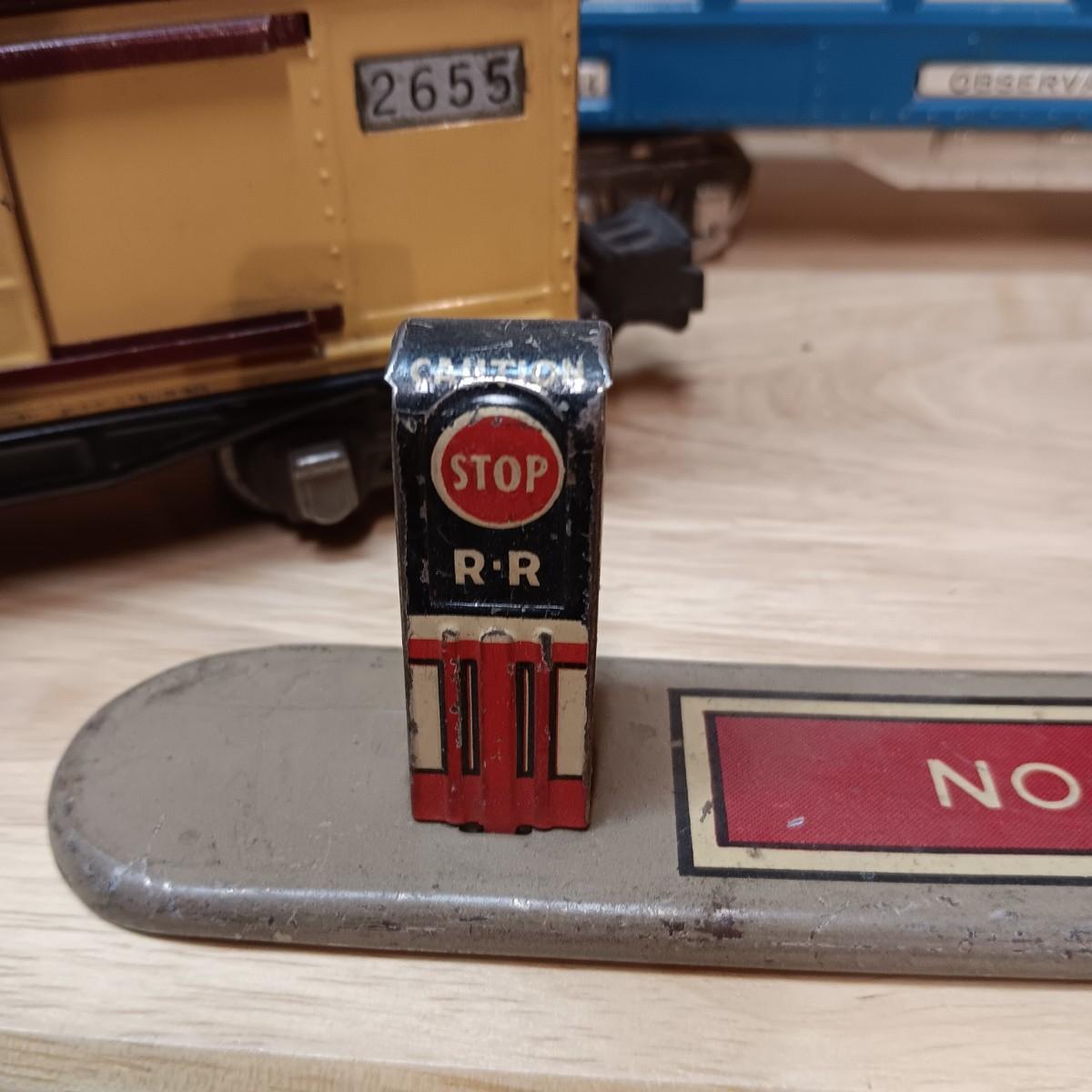 LIONEL BLUE COMET PASSENGER TRAIN, SUNOCO TANK CAR, A BOXCAR, RAILROAD LIGHT AND NO CROSSING