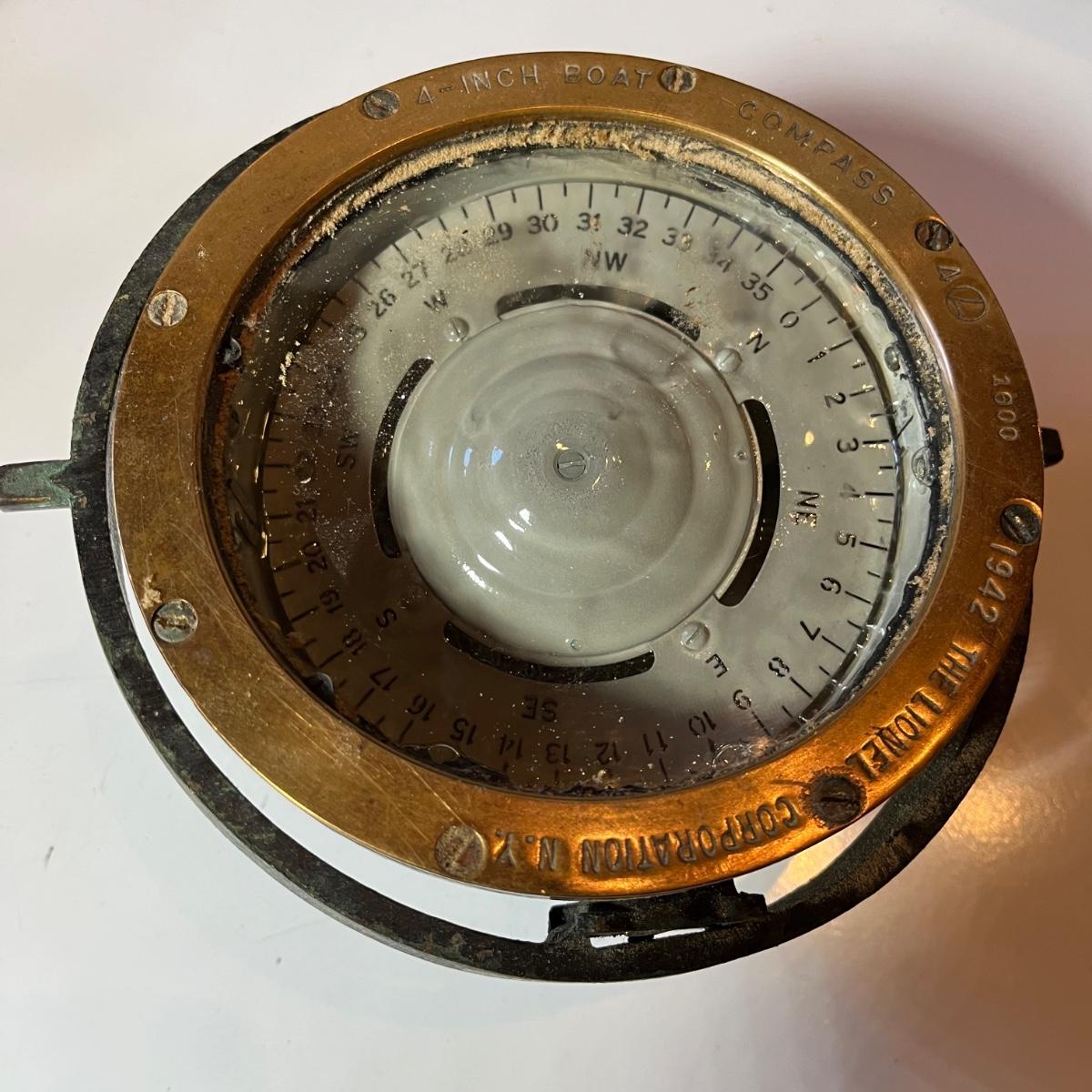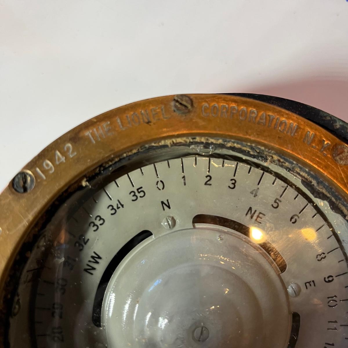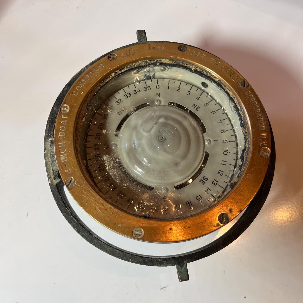 Lot includes a Lionel Co. 4 inch boat compass marked 1942. Compass is heavy metal with a copper and glass top. Compass measures 6”D x 3.5” tall.