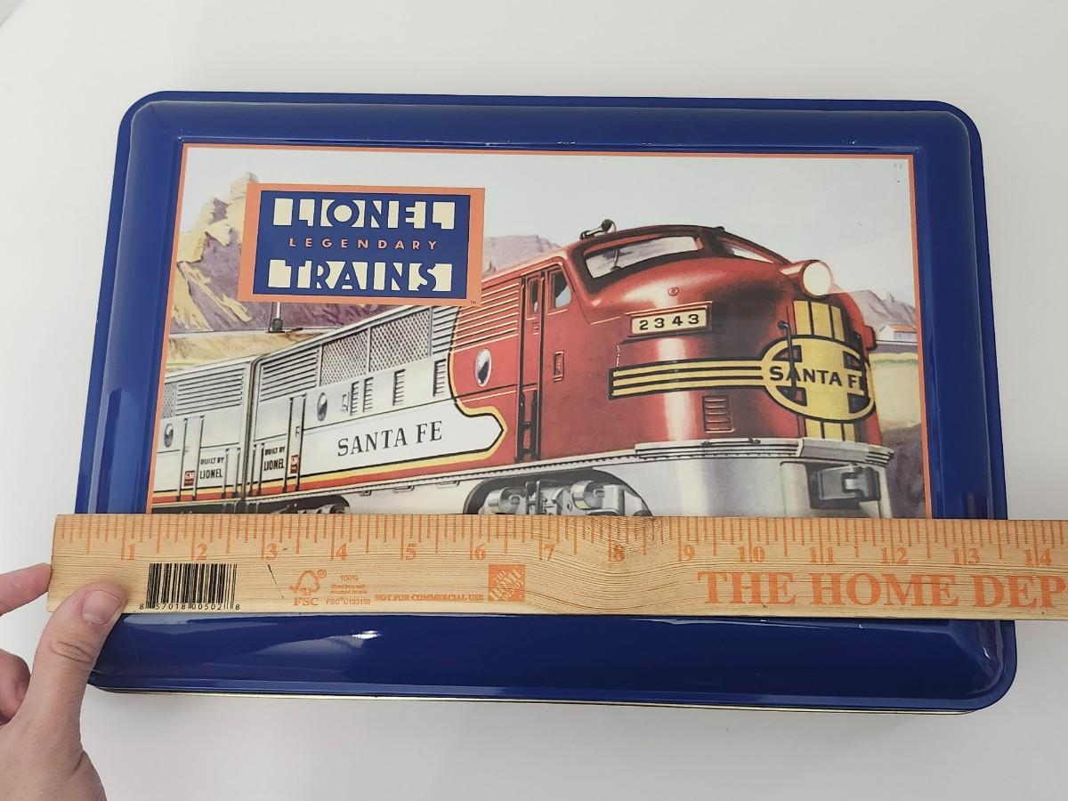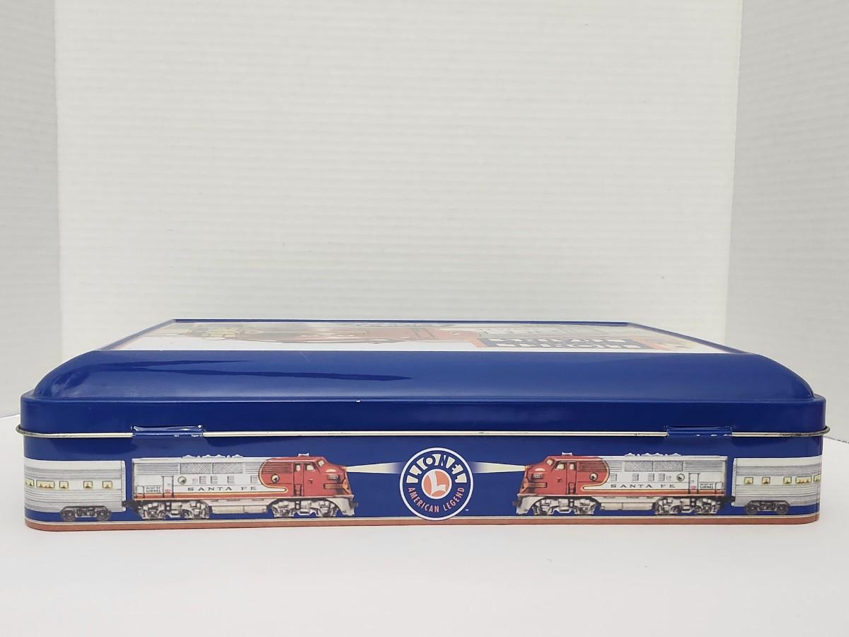 Decorative Lionel Legendary Trains storage case featuring Santa Fe locomotive artwork on the lid. Rectangular blue tin style case with raised edges and printed train graphic. Front artwork shows Santa Fe diesel locomotive numbered 2343 with Lionel branding. Suitable for storage, display, or railroad memorabilia collections. Case only, no contents included.