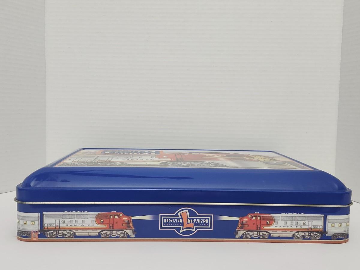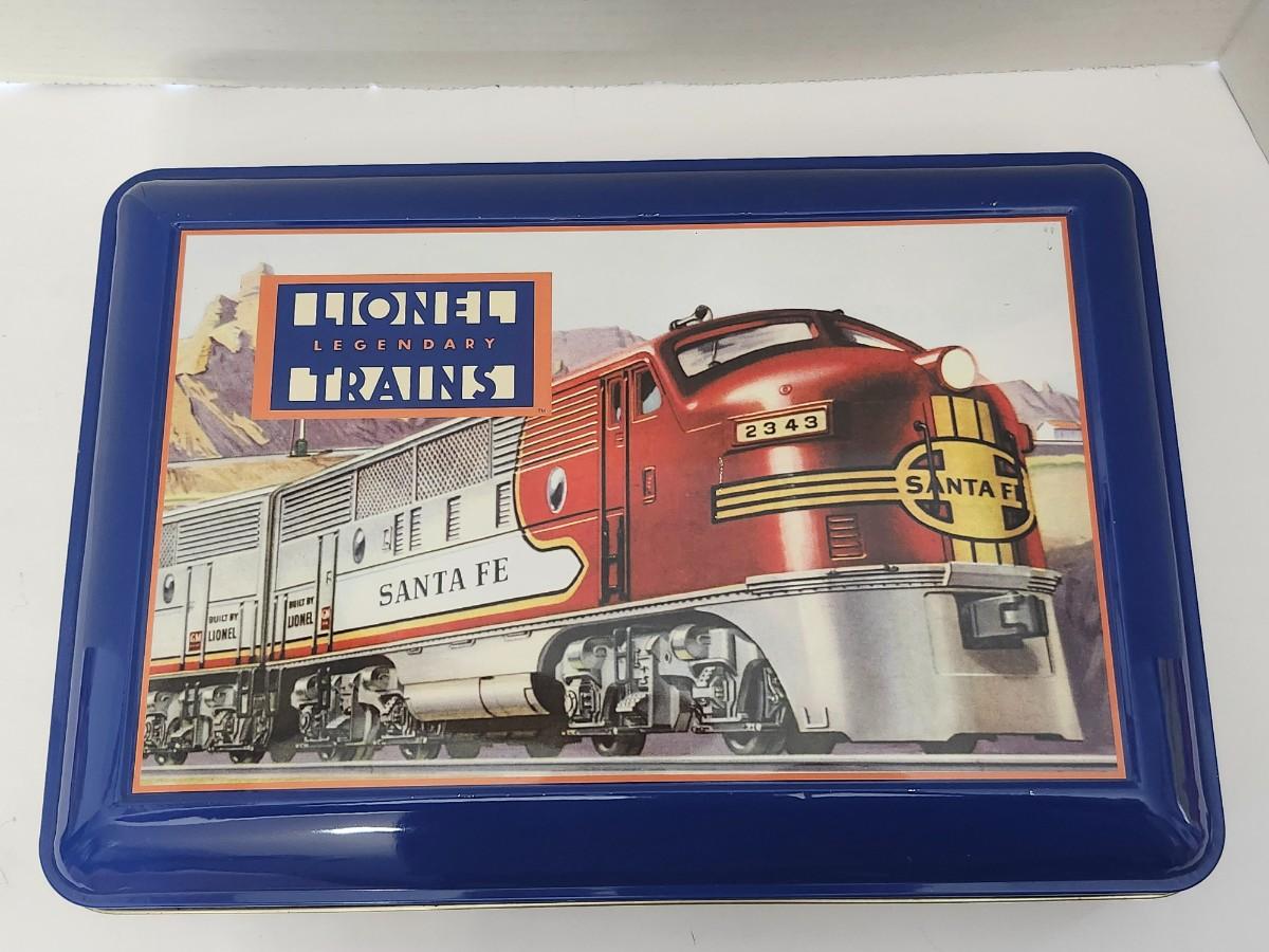 Decorative Lionel Legendary Trains storage case featuring Santa Fe locomotive artwork on the lid. Rectangular blue tin style case with raised edges and printed train graphic. Front artwork shows Santa Fe diesel locomotive numbered 2343 with Lionel branding. Suitable for storage, display, or railroad memorabilia collections. Case only, no contents included.