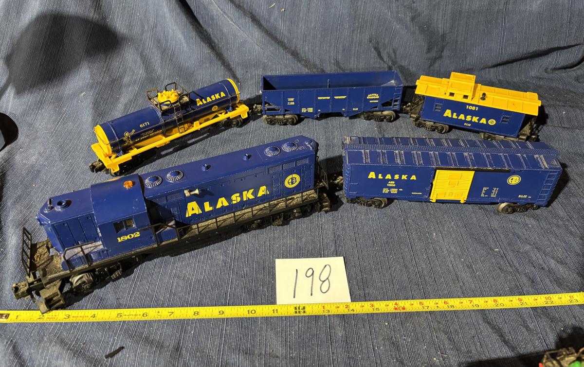 Lionel O Gauge Alaska Railroad model train cars and a diesel