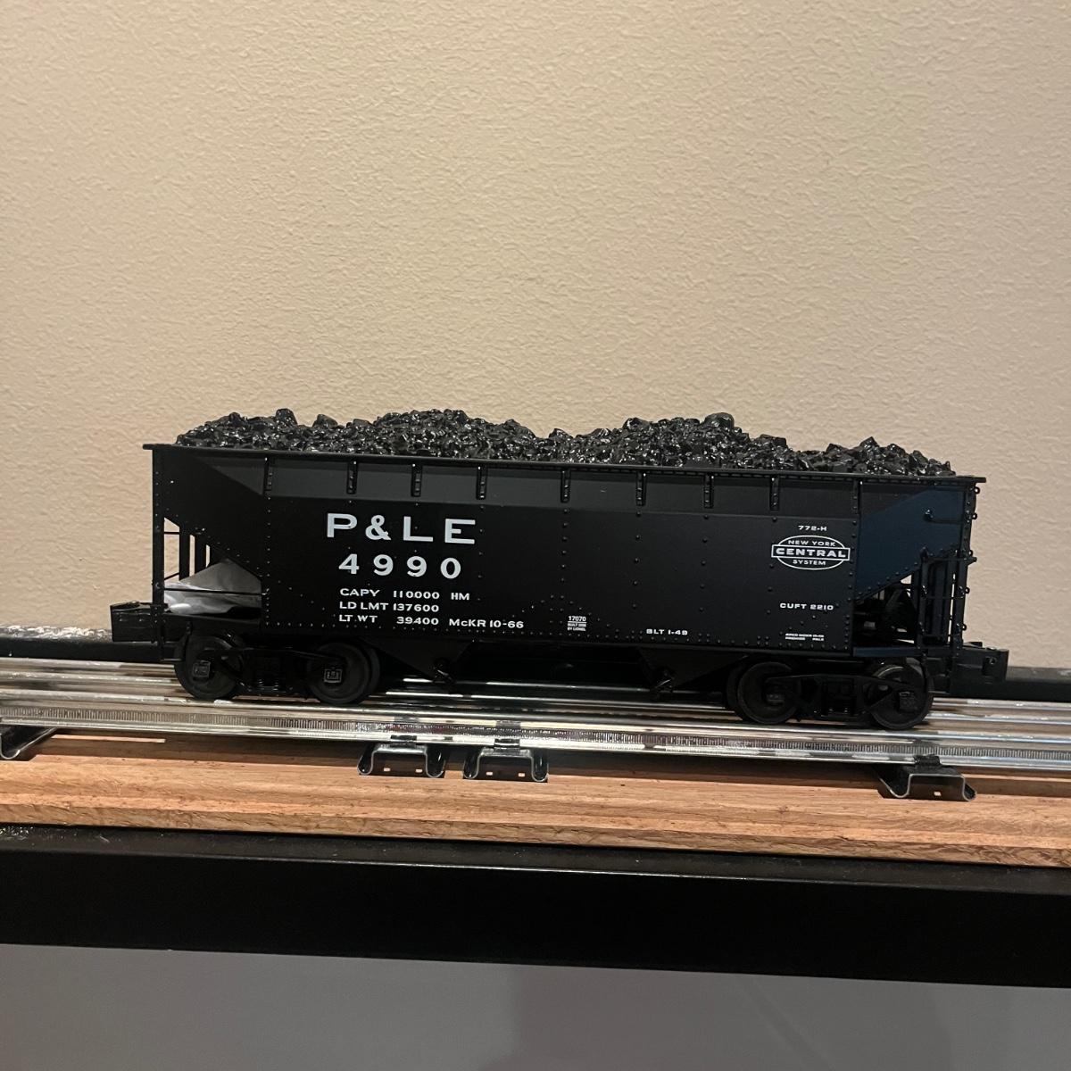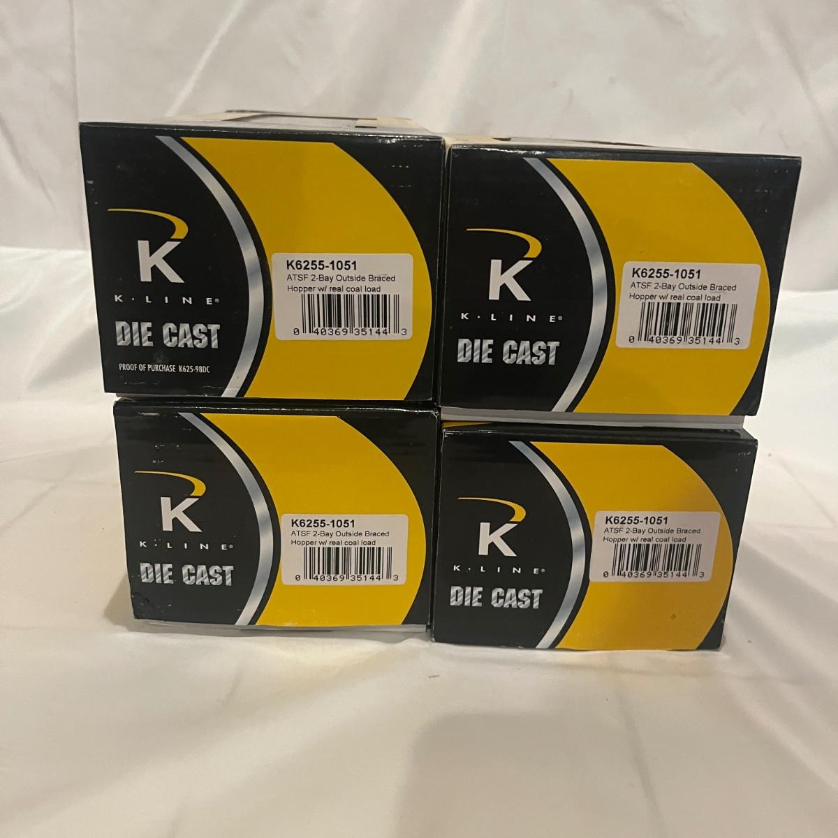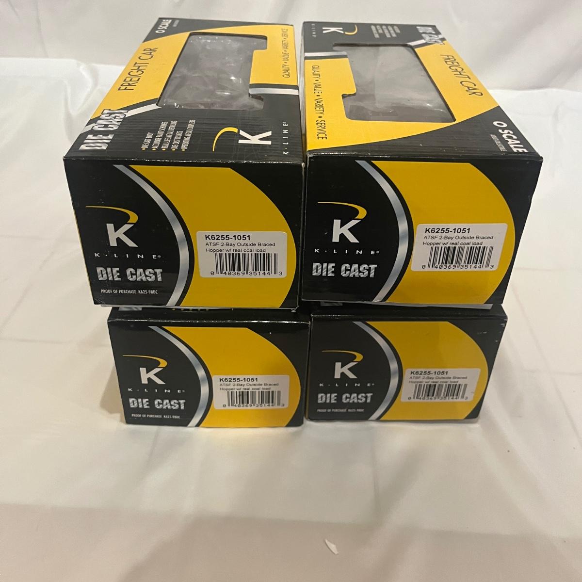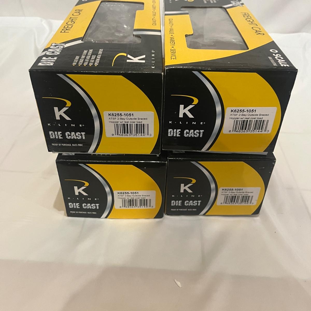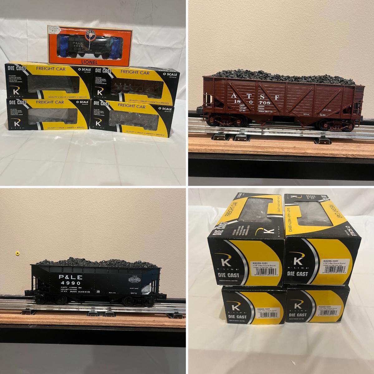 Lot includes four die cast K-Line ATSF 2 Bay outside braced hopper with real coal load and one Lionel die cast P&LE offset hopper. Trains are 9” long. Tracks in photos are not part of this lot but are in this auction in a different lot. Please note that any price tag seen on an item was not put there by Sterling Transitions and does not reflect the current value of the item.