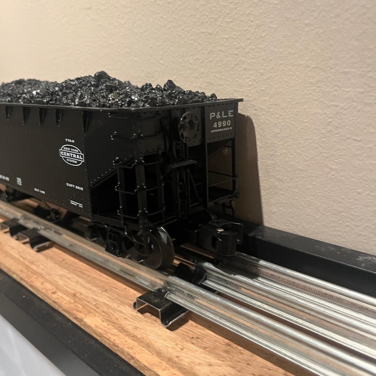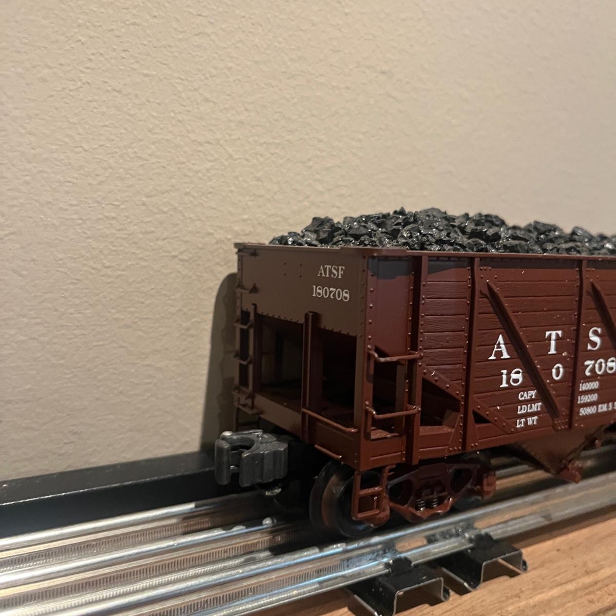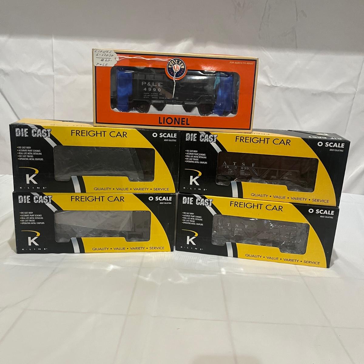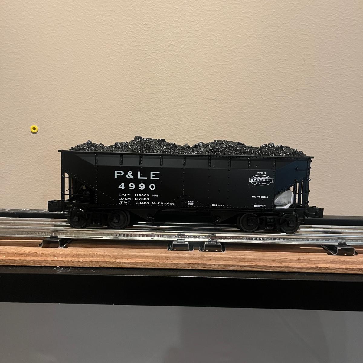 Lot includes four die cast K-Line ATSF 2 Bay outside braced hopper with real coal load and one Lionel die cast P&LE offset hopper. Trains are 9” long. Tracks in photos are not part of this lot but are in this auction in a different lot. Please note that any price tag seen on an item was not put there by Sterling Transitions and does not reflect the current value of the item.