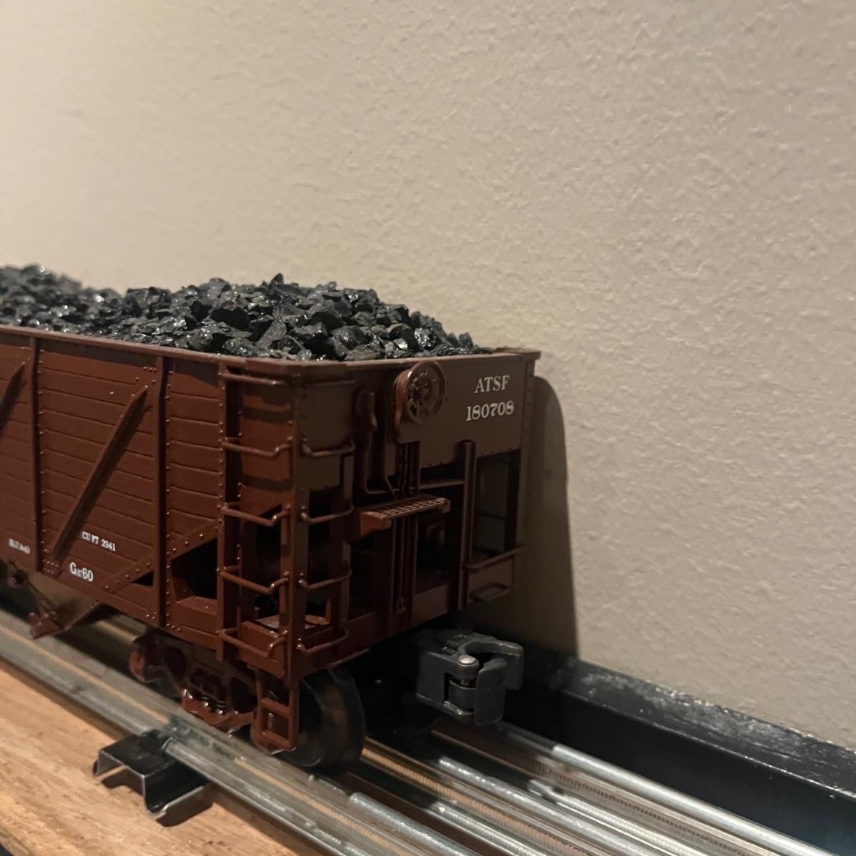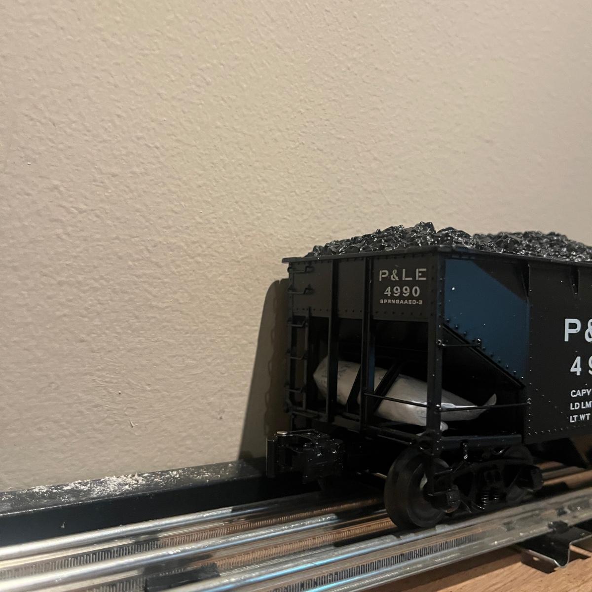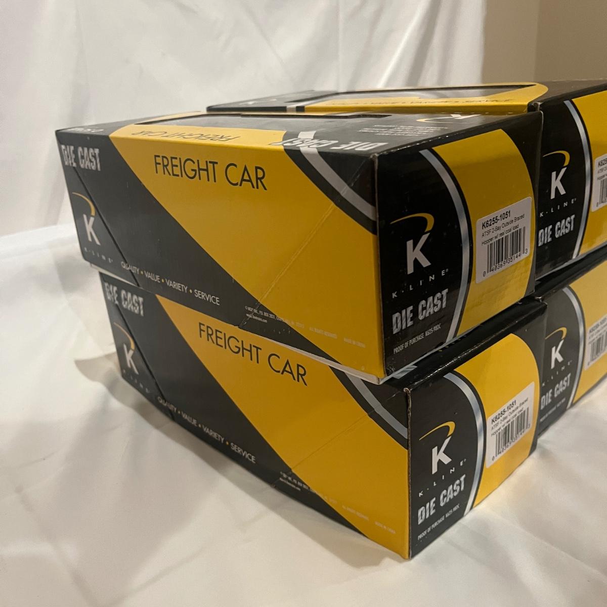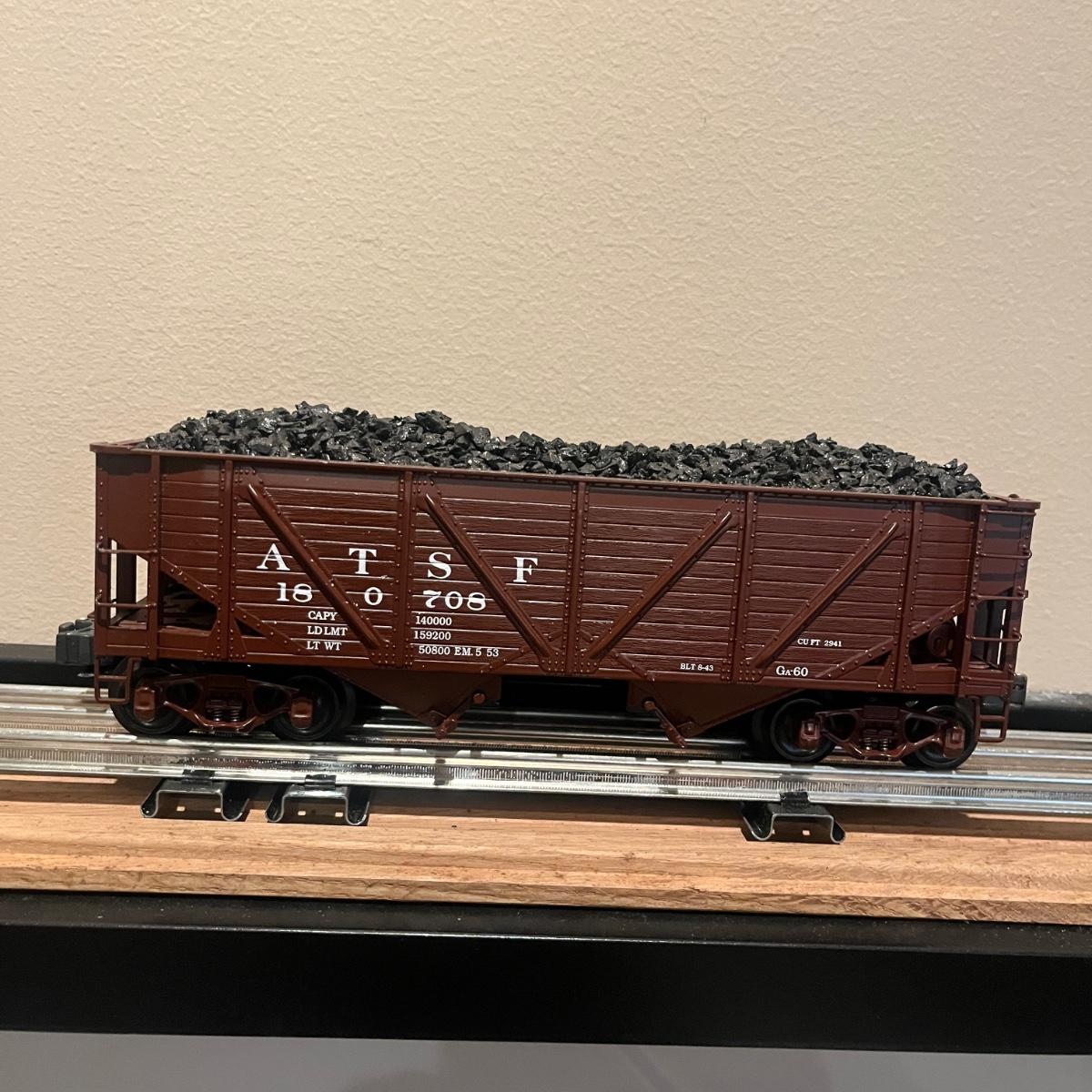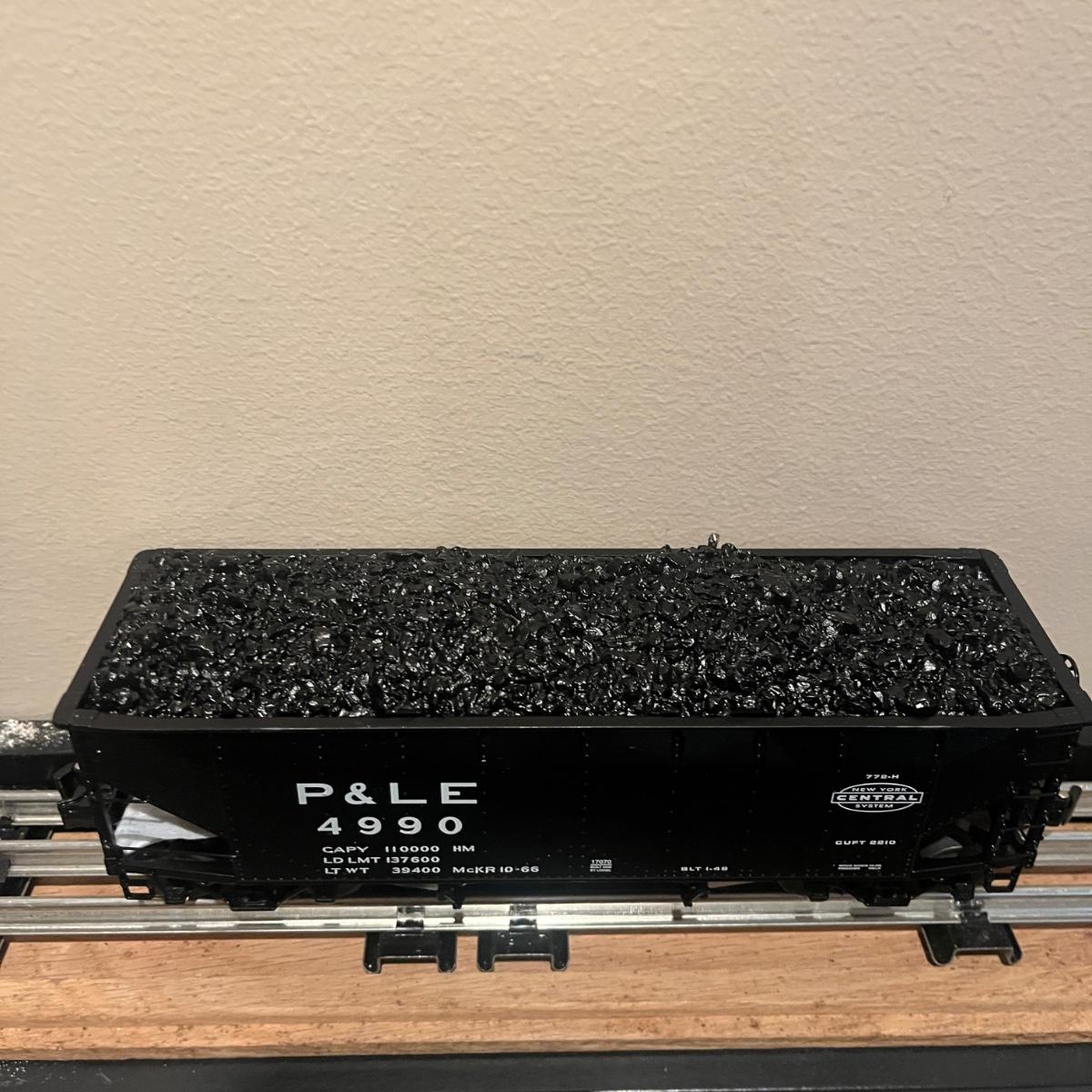 Lot includes four die cast K-Line ATSF 2 Bay outside braced hopper with real coal load and one Lionel die cast P&LE offset hopper. Trains are 9” long. Tracks in photos are not part of this lot but are in this auction in a different lot. Please note that any price tag seen on an item was not put there by Sterling Transitions and does not reflect the current value of the item.