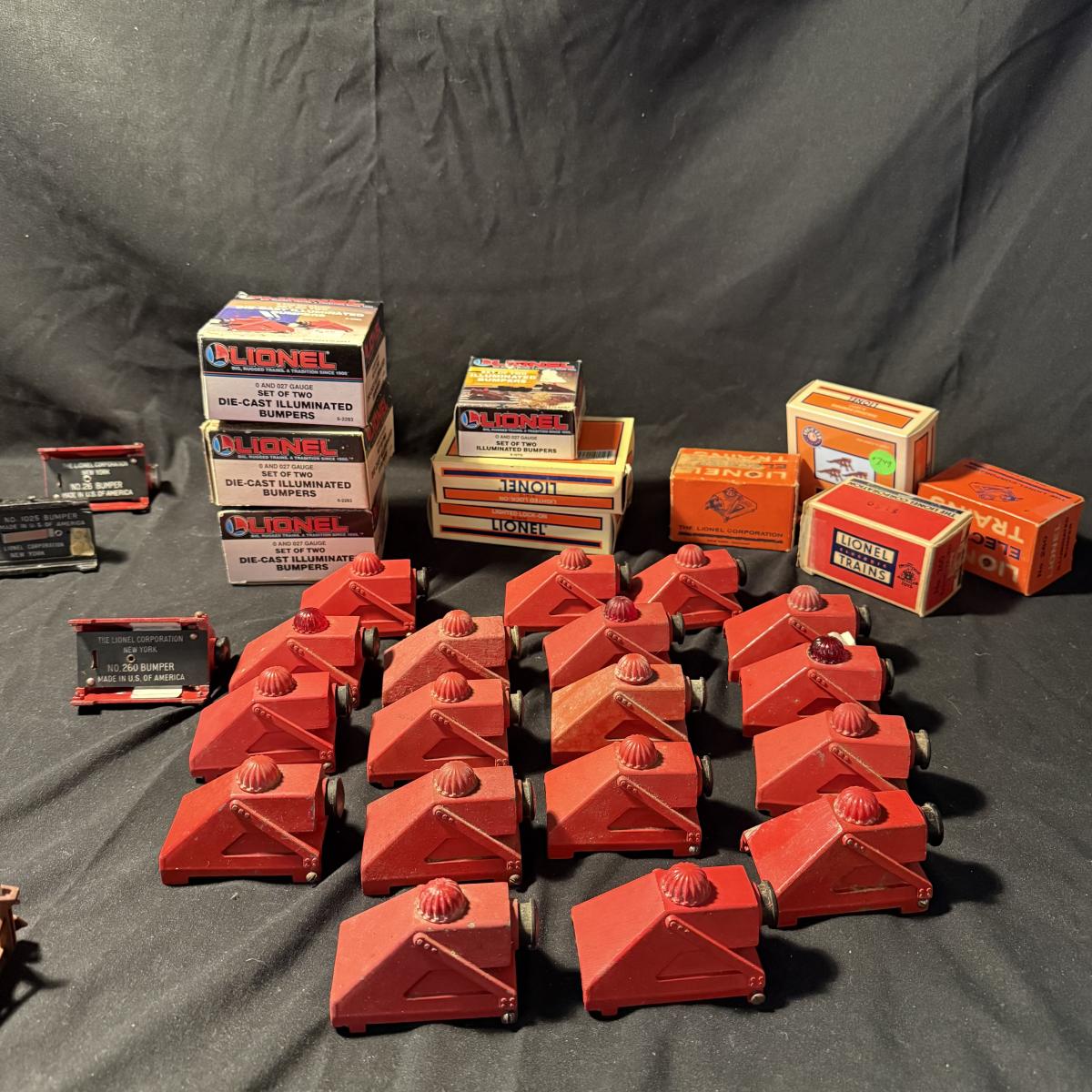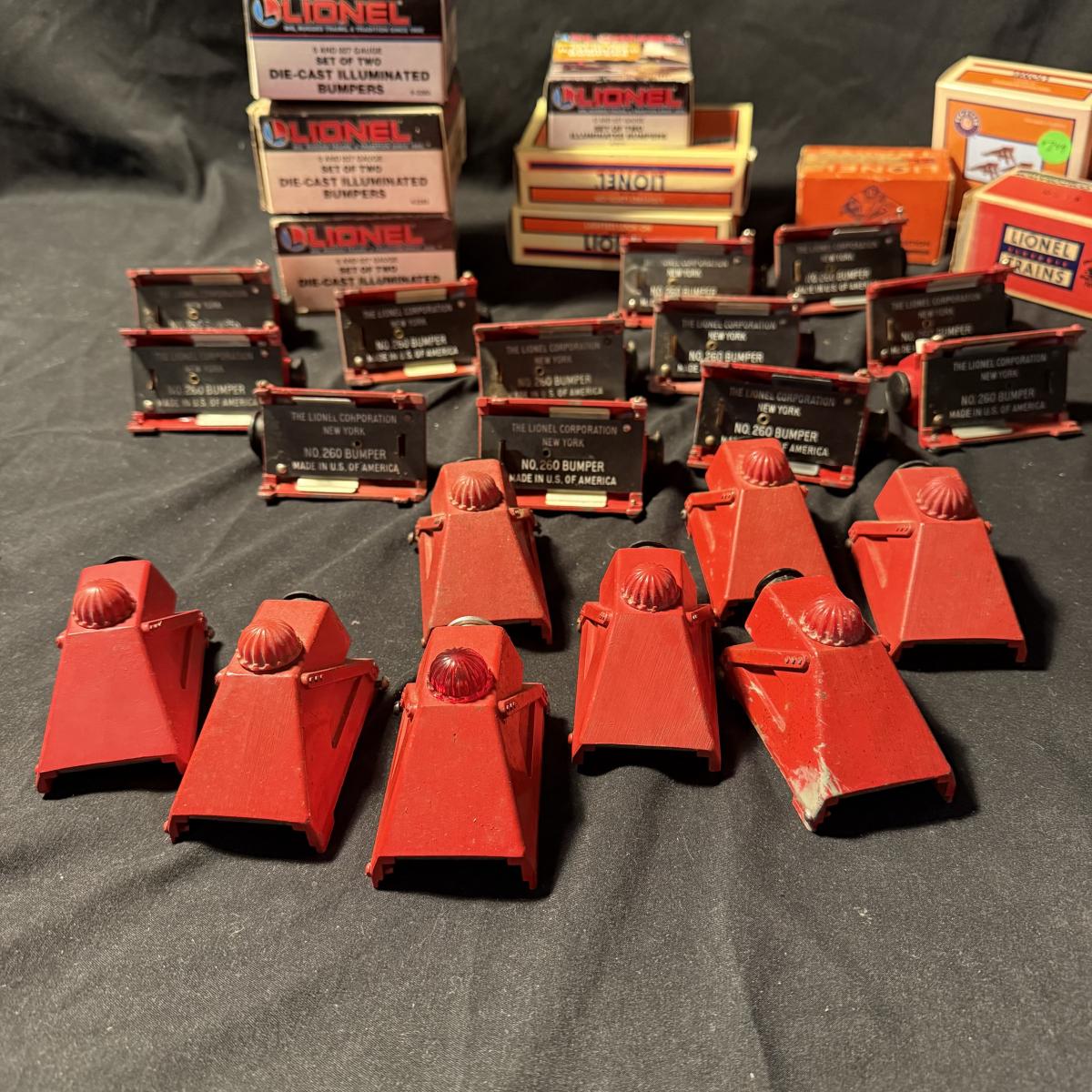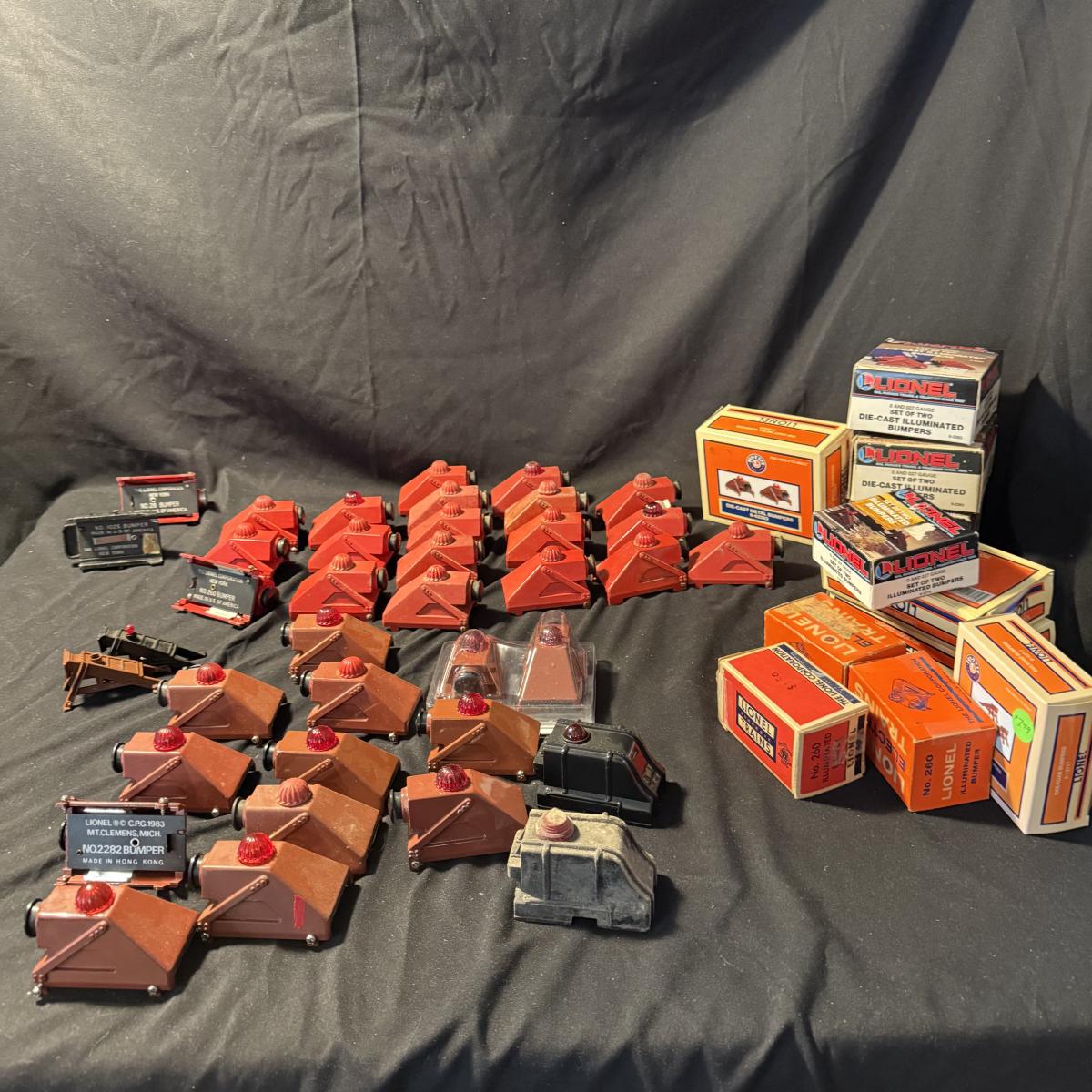 This lot contains over 30 Lionel illuminated bumpers including a set of two what appears to be railroad bumpers. Nearly half are NO. 2282 which measure 3.25” x 1.75” x 2”H and the other half are NO. 260. Also included are some of the original boxes to the bumpers already shown in photos. See pictures for full inventory. Shipping available. Please note that any price tag seen on an item was not put there by Sterling Transitions and does not reflect the current value of the item.