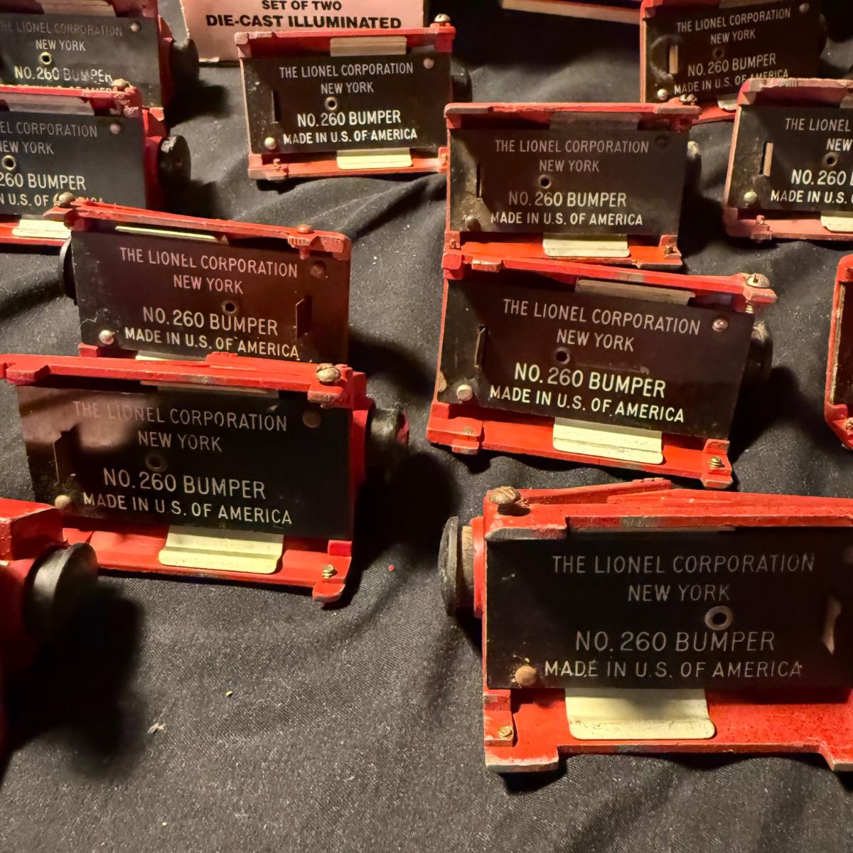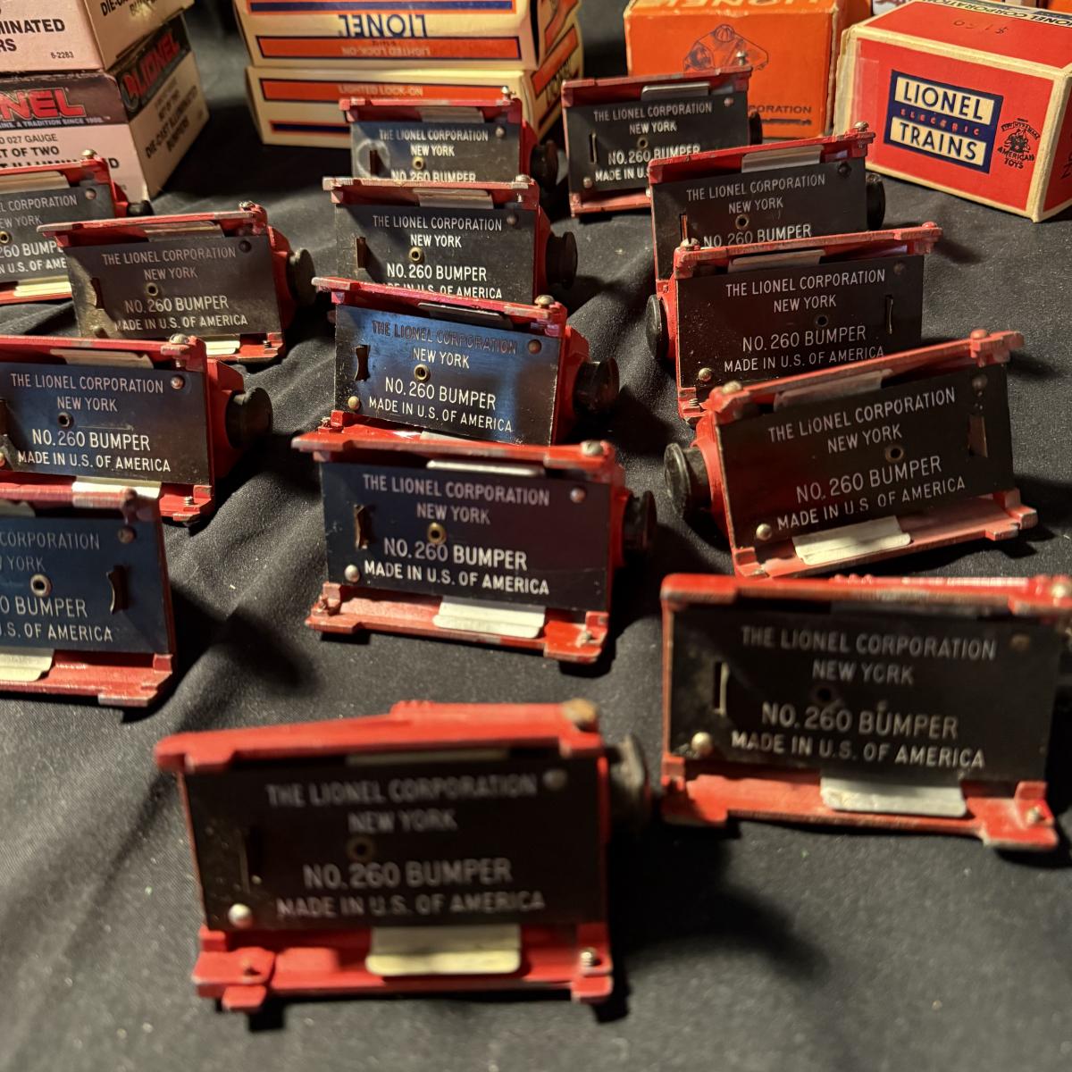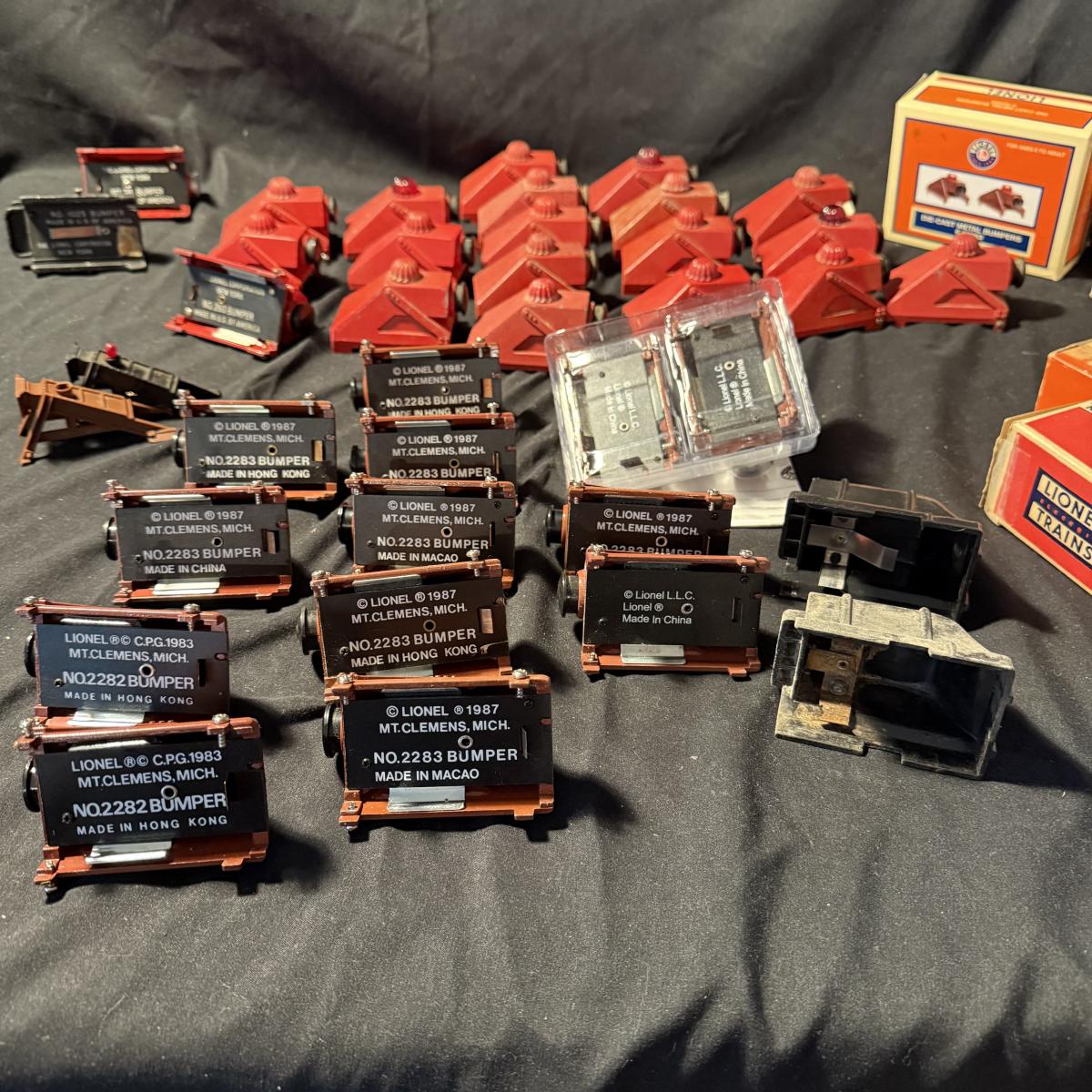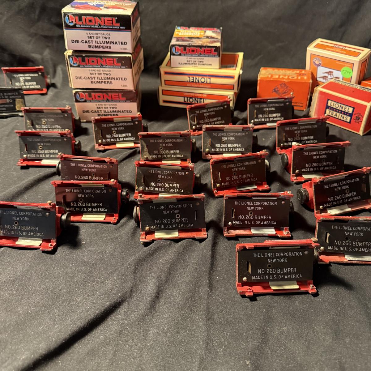 This lot contains over 30 Lionel illuminated bumpers including a set of two what appears to be railroad bumpers. Nearly half are NO. 2282 which measure 3.25” x 1.75” x 2”H and the other half are NO. 260. Also included are some of the original boxes to the bumpers already shown in photos. See pictures for full inventory. Shipping available. Please note that any price tag seen on an item was not put there by Sterling Transitions and does not reflect the current value of the item.