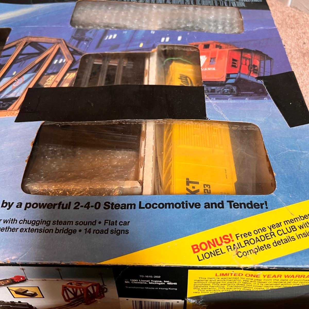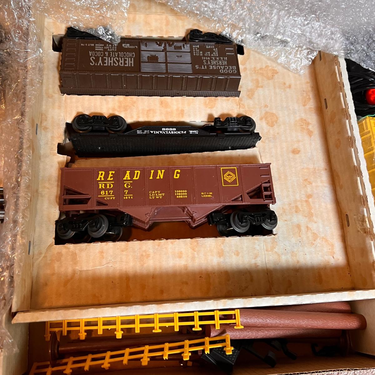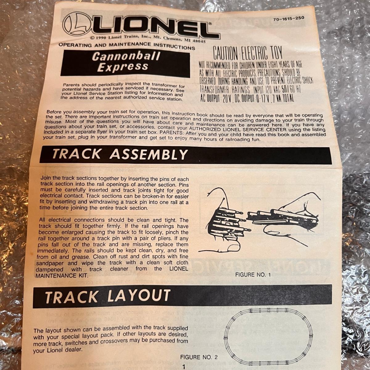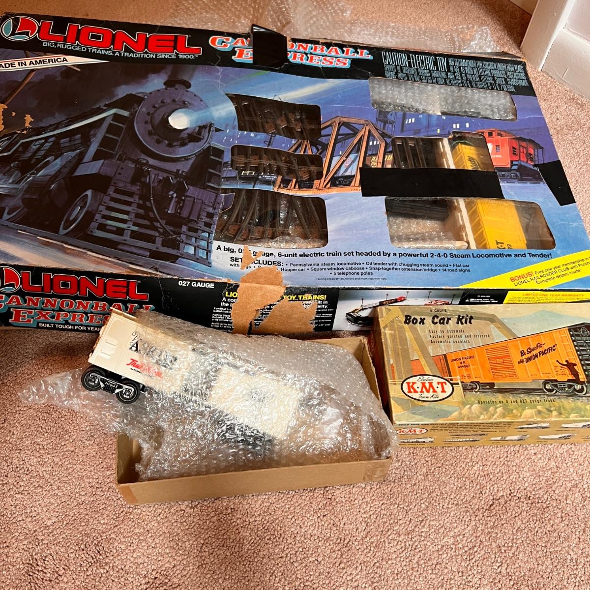 Lionel Cannonball Express train set - box has lots of wear but pieces were carefully stored with packing bubble wrap. Looks to be complete but see all pics for details. Parts were not counted. True Value Lionel car is stored in a KMT box, not the original box.
