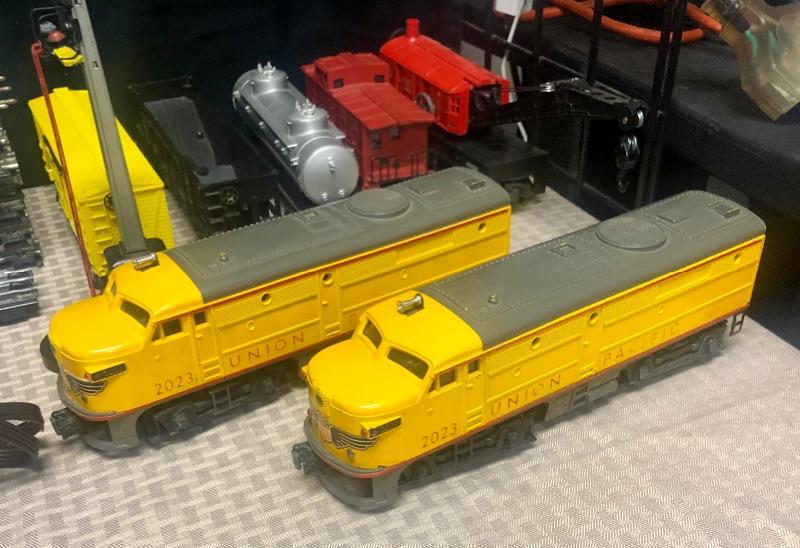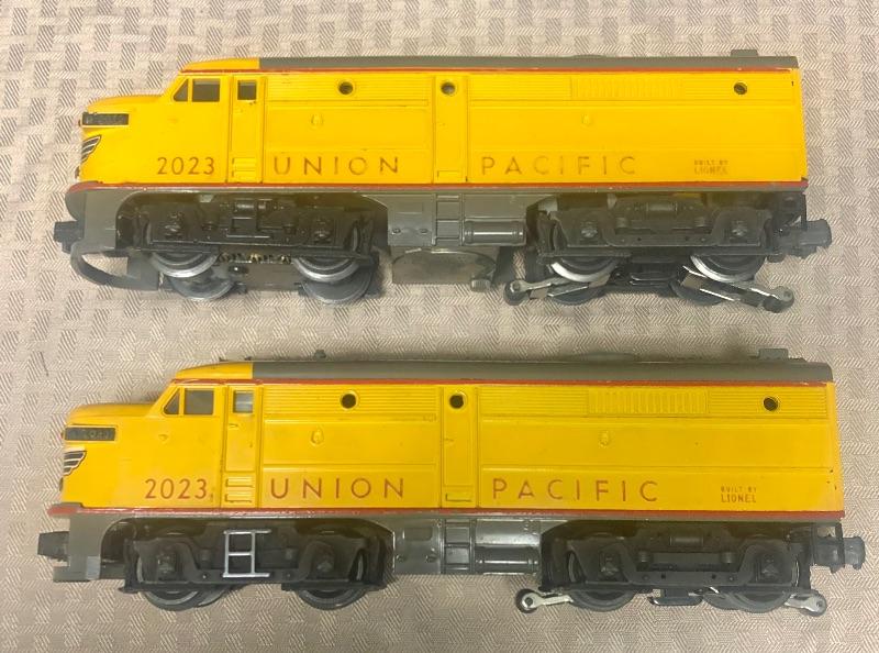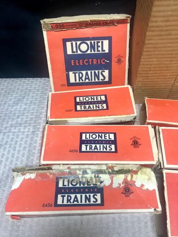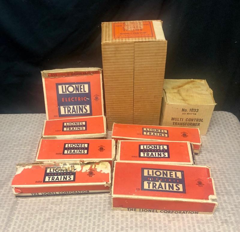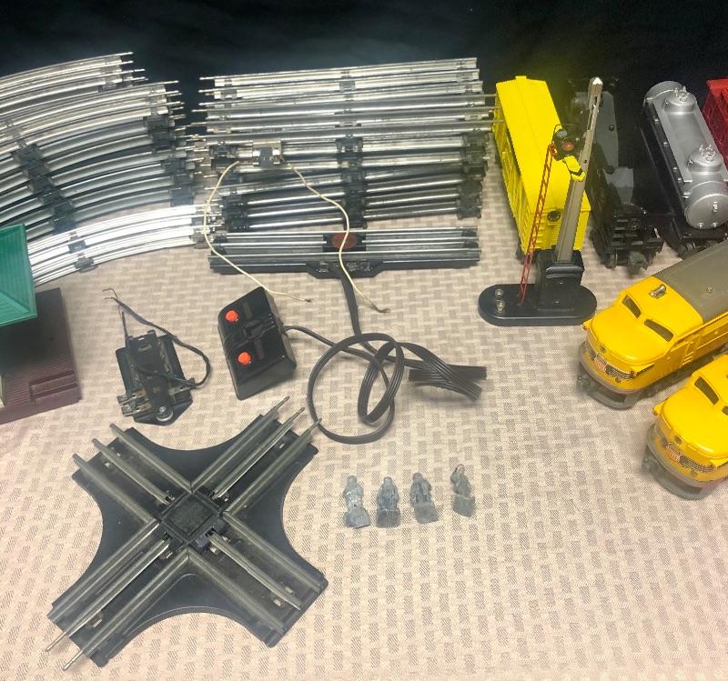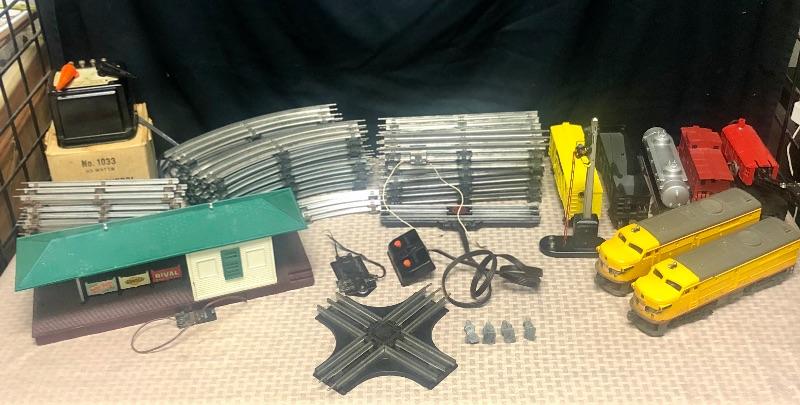 Vintage Lionel “0” or “027” train set. Pair of 2023 Union Pacific Locomotives, 5 cars (6656 stock car, 6456 hopper car, 6465 tank car, 6560 crane car, and 6357 caboose), 40 pieces of track, 90* crossing, uncoupled track, 151 Semaphore Crossing signal, throttle/transformer, train station, 4 pewter figurines, track wiring clips, and many of the original Lionel boxes. Clean, no damage or rust. See pictures for details.