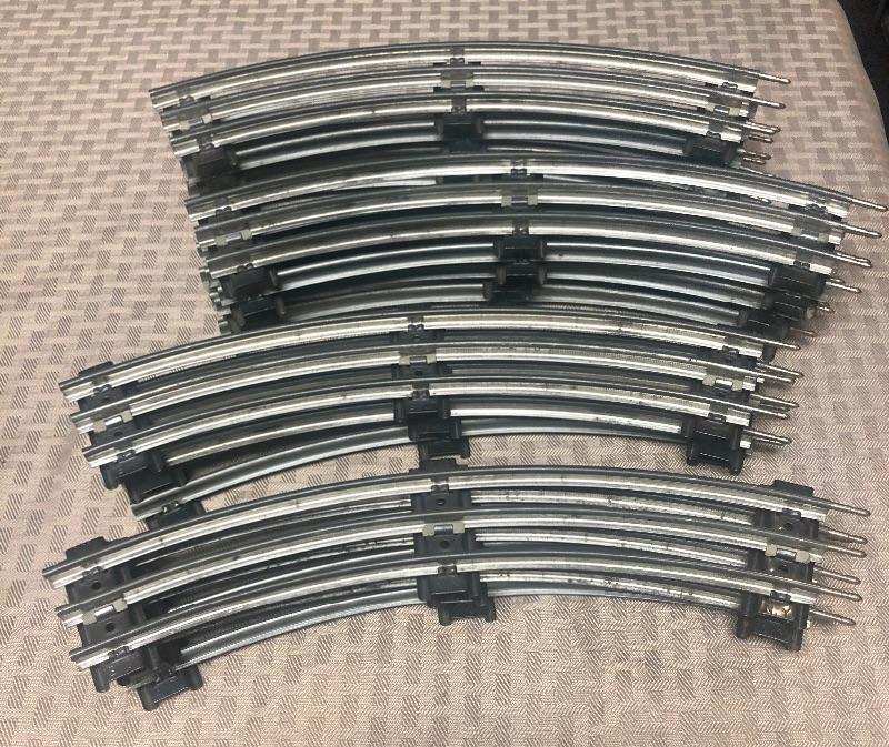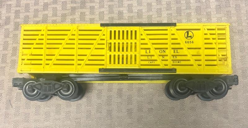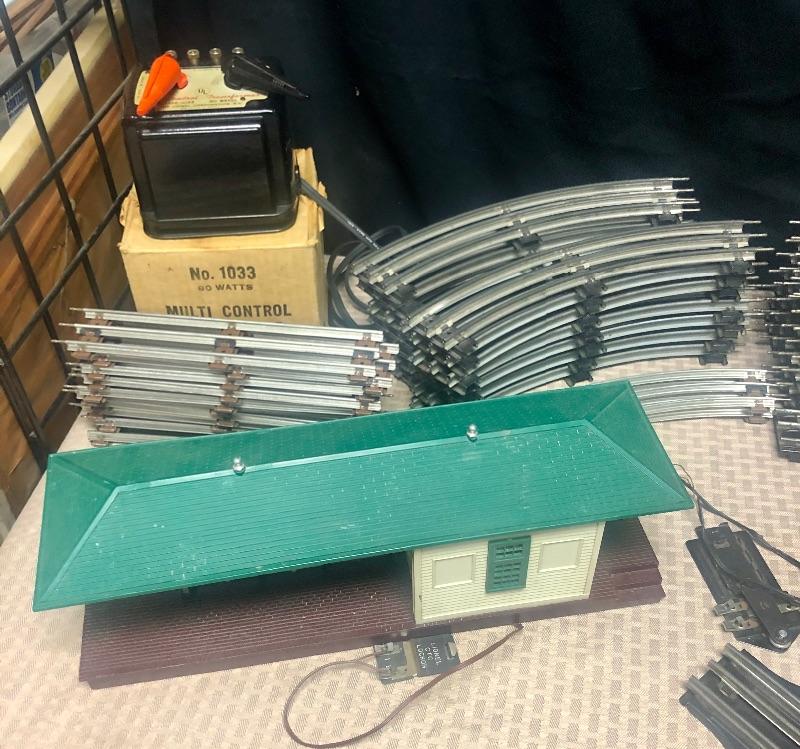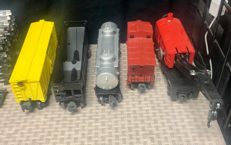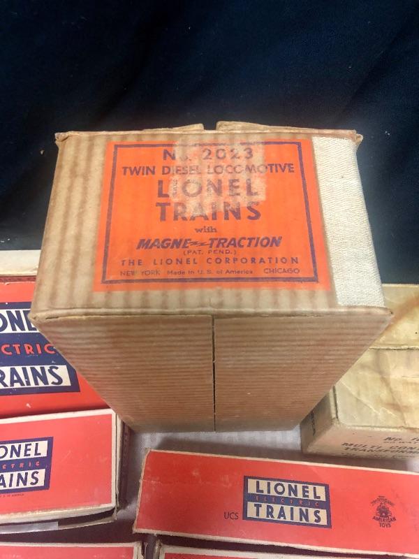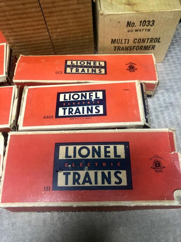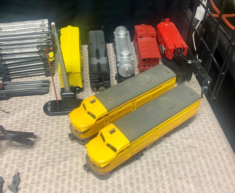Vintage Lionel “0” or “027” train set. Pair of 2023 Union Pacific Locomotives, 5 cars (6656 stock car, 6456 hopper car, 6465 tank car, 6560 crane car, and 6357 caboose), 40 pieces of track, 90* crossing, uncoupled track, 151 Semaphore Crossing signal, throttle/transformer, train station, 4 pewter figurines, track wiring clips, and many of the original Lionel boxes. Clean, no damage or rust. See pictures for details.