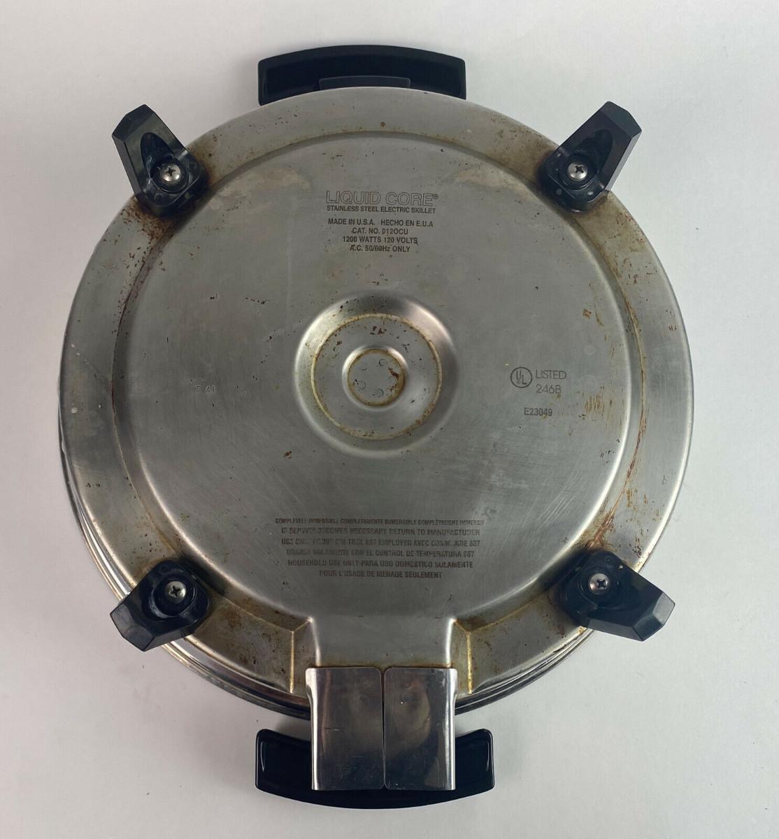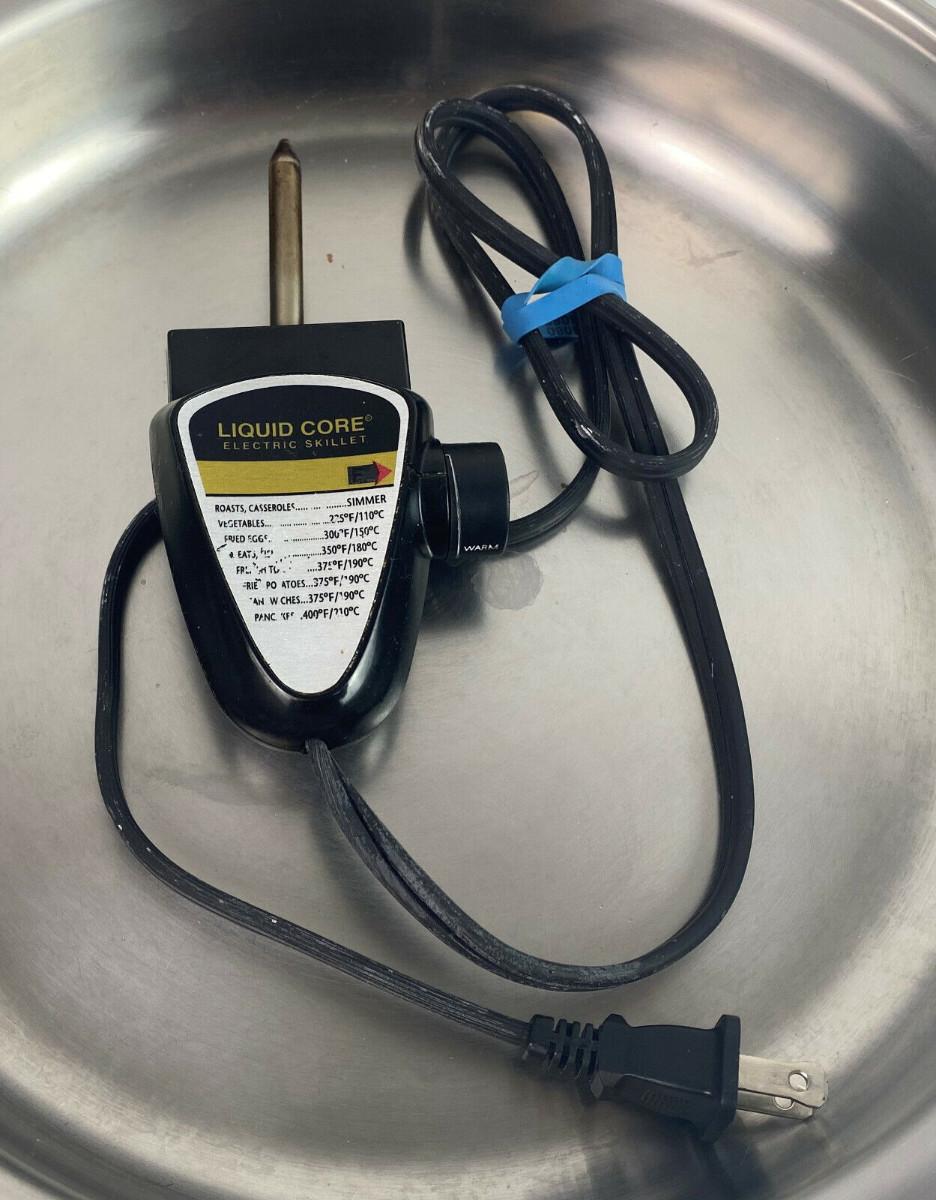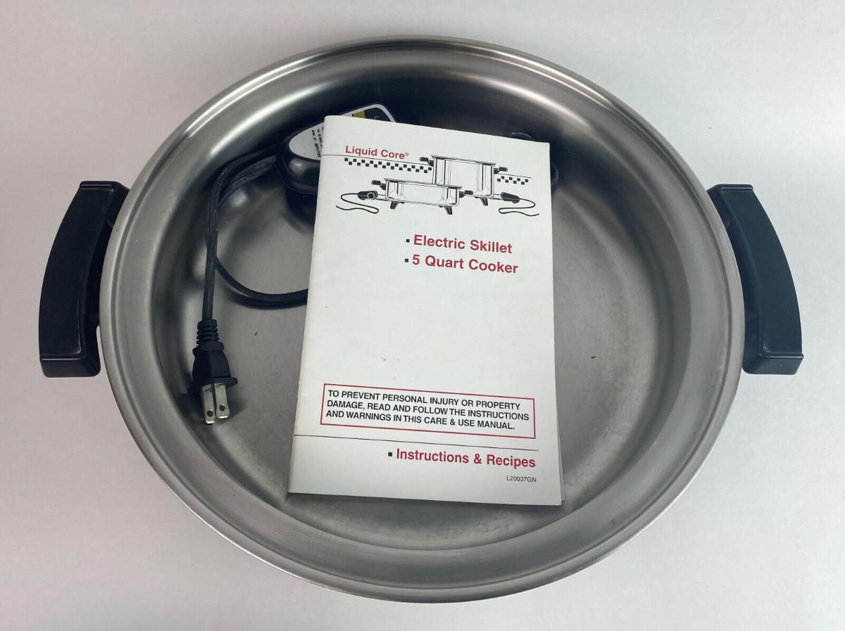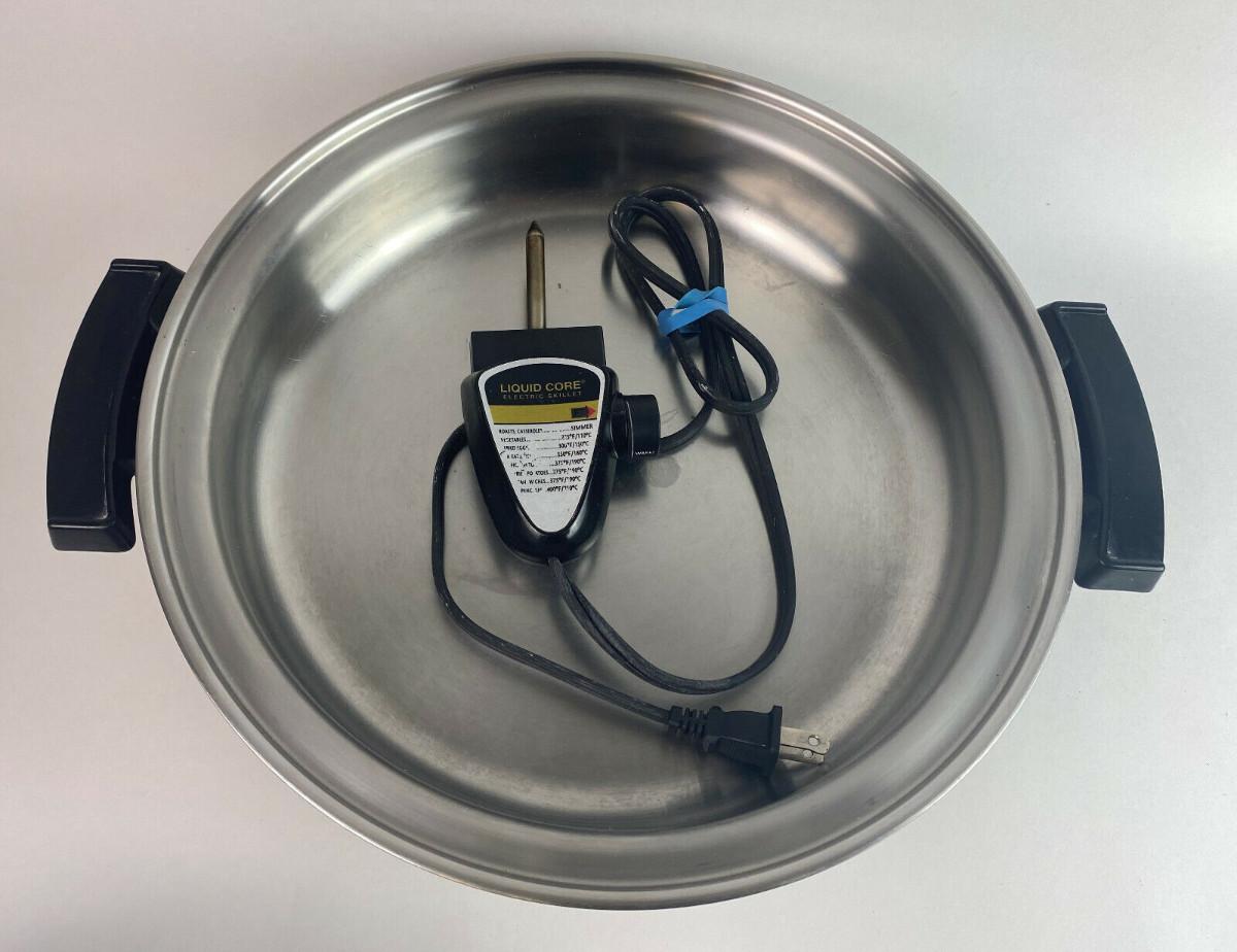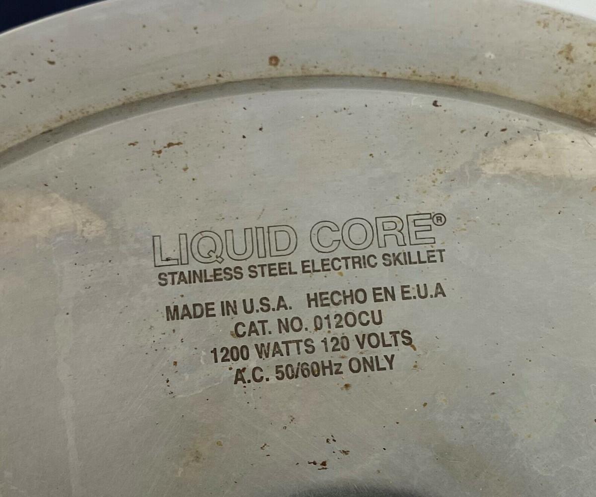 With normal use, apparent on exterior, here is a LIQUID CORE Stainless Steel Electric Skillet...Catalog No. 012OCU...1200 Watts..120 Volts...A.C. only...Clean interior...Features a Vapor Valve Whistle Knob on top. Completely immersible...12.75" diameter...With electric controller and instructions for use in English and Spanish...As shown.
