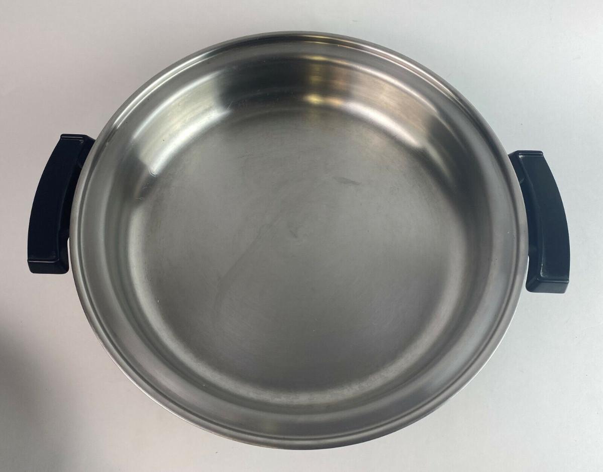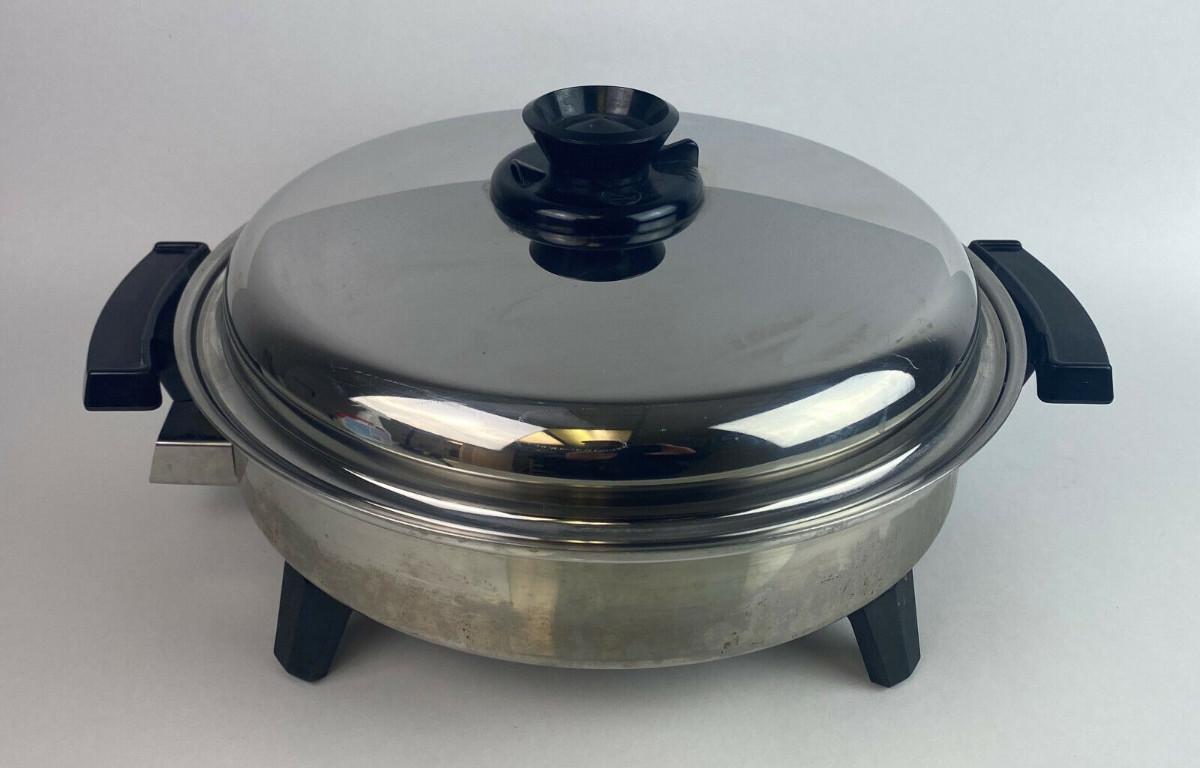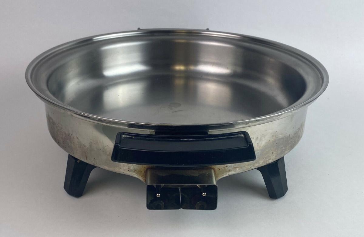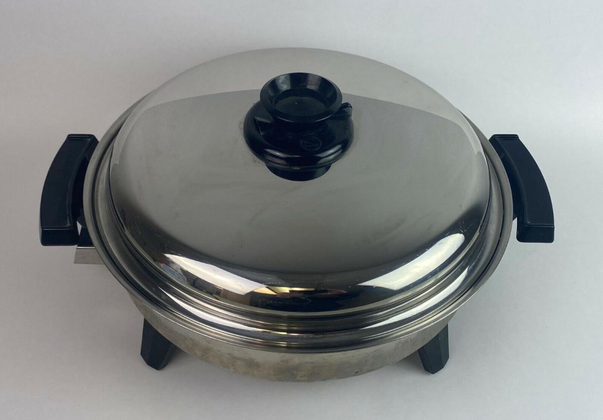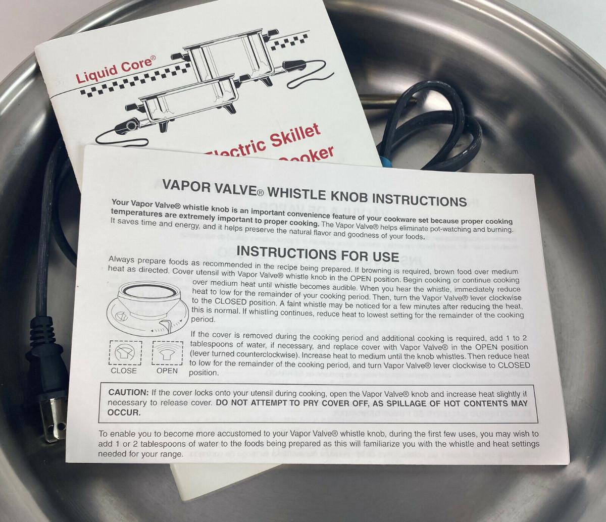 With normal use, apparent on exterior, here is a LIQUID CORE Stainless Steel Electric Skillet...Catalog No. 012OCU...1200 Watts..120 Volts...A.C. only...Clean interior...Features a Vapor Valve Whistle Knob on top. Completely immersible...12.75" diameter...With electric controller and instructions for use in English and Spanish...As shown.