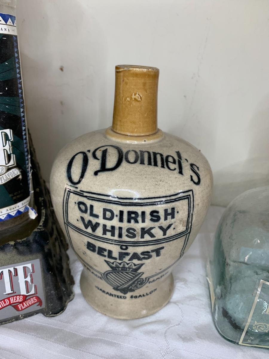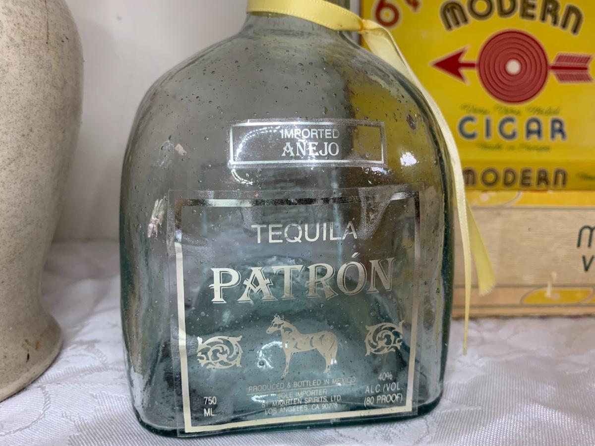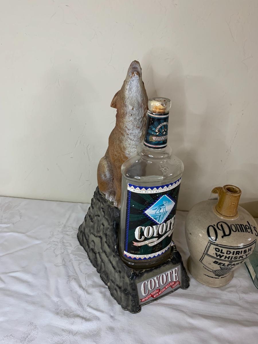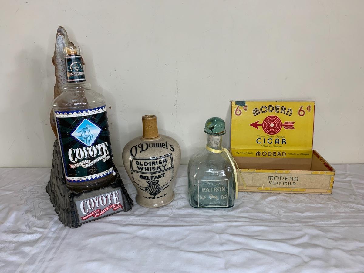 Liquor bottles including one coyote tequila bottle and stand, O’Donnels Whiskey, Patron, vintage cigar box and more.