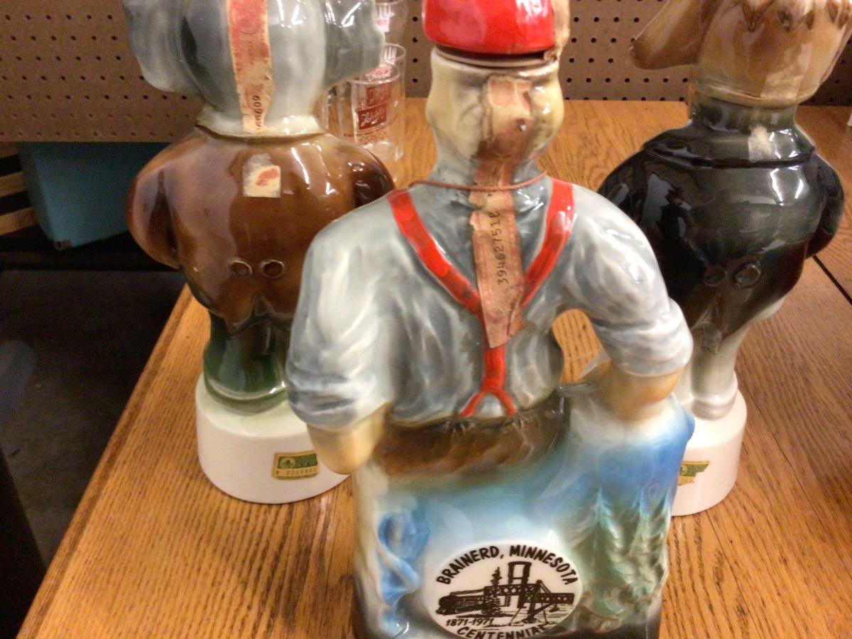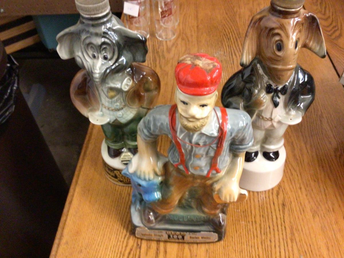 These are three great liquor decanters. You get Donkey, Elephant, and Paul Bunyan and Babe The Blue Ox. They are all empty.