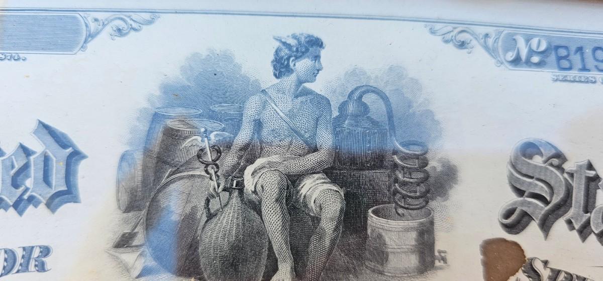Engraved illustration showing Mercury ( the Roman god who also appears on the Mercury Dime ), seated beside an alcohol distillery , wooden whiskey barrels and a large wine jug.
