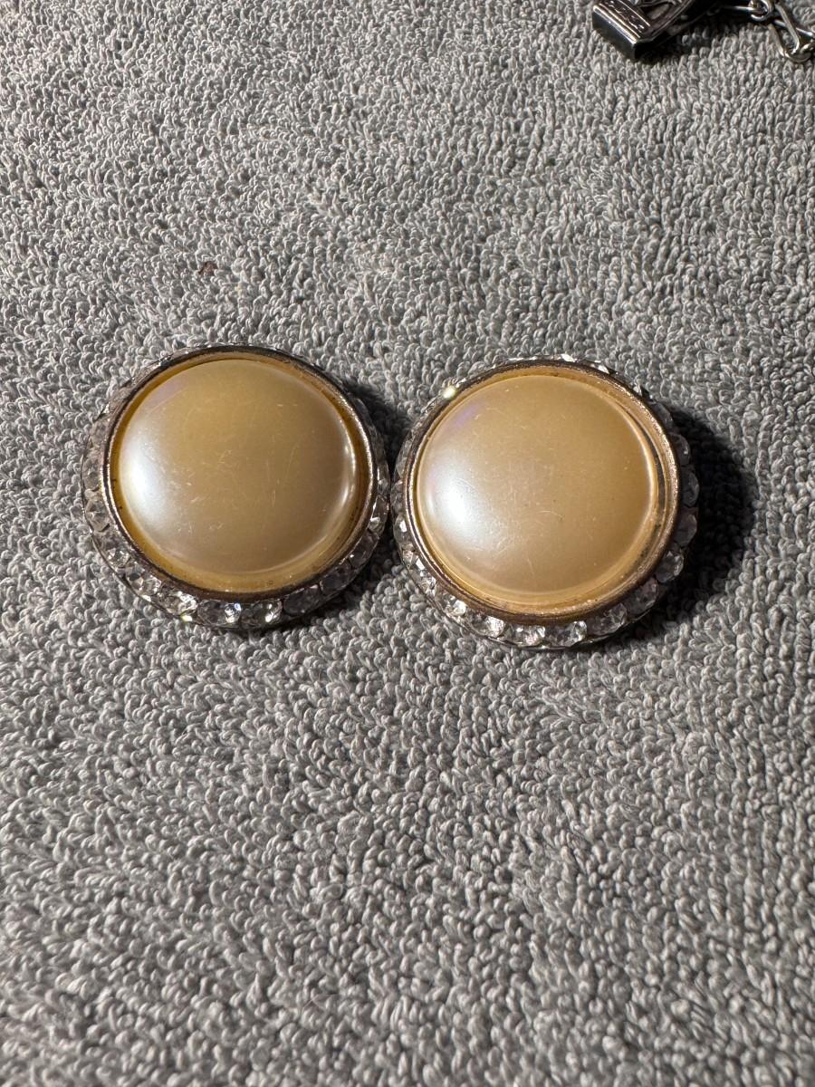 Style: These particular earrings feature a central faux pearl or thermoset material in a beige/tan color, encircled by a trim of clear rhinestones, giving them a classic and elegant "button" style.