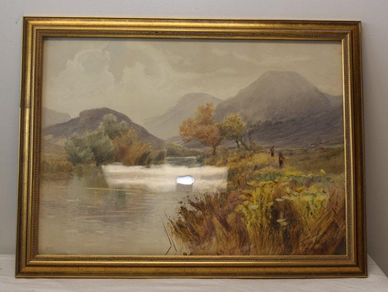 LISTED ARTIST James Arthur Jameson watercolor painting depicting couple carrying items along the stream. Measurement approximate: Image 20 H X 28 W /framed 24 H X 32 W. Material: Water Color. Shipping cost $150 Excluding California, Alaska & Hawaii.