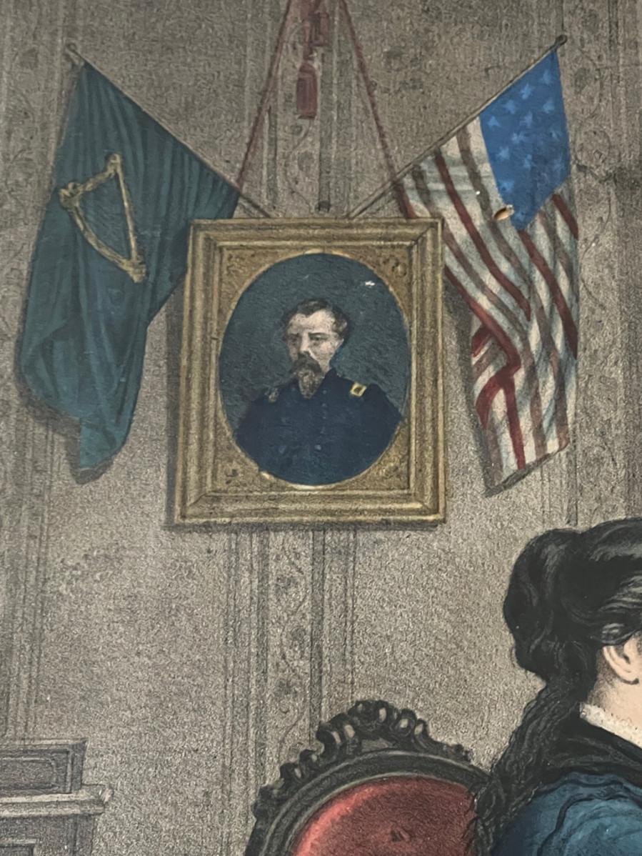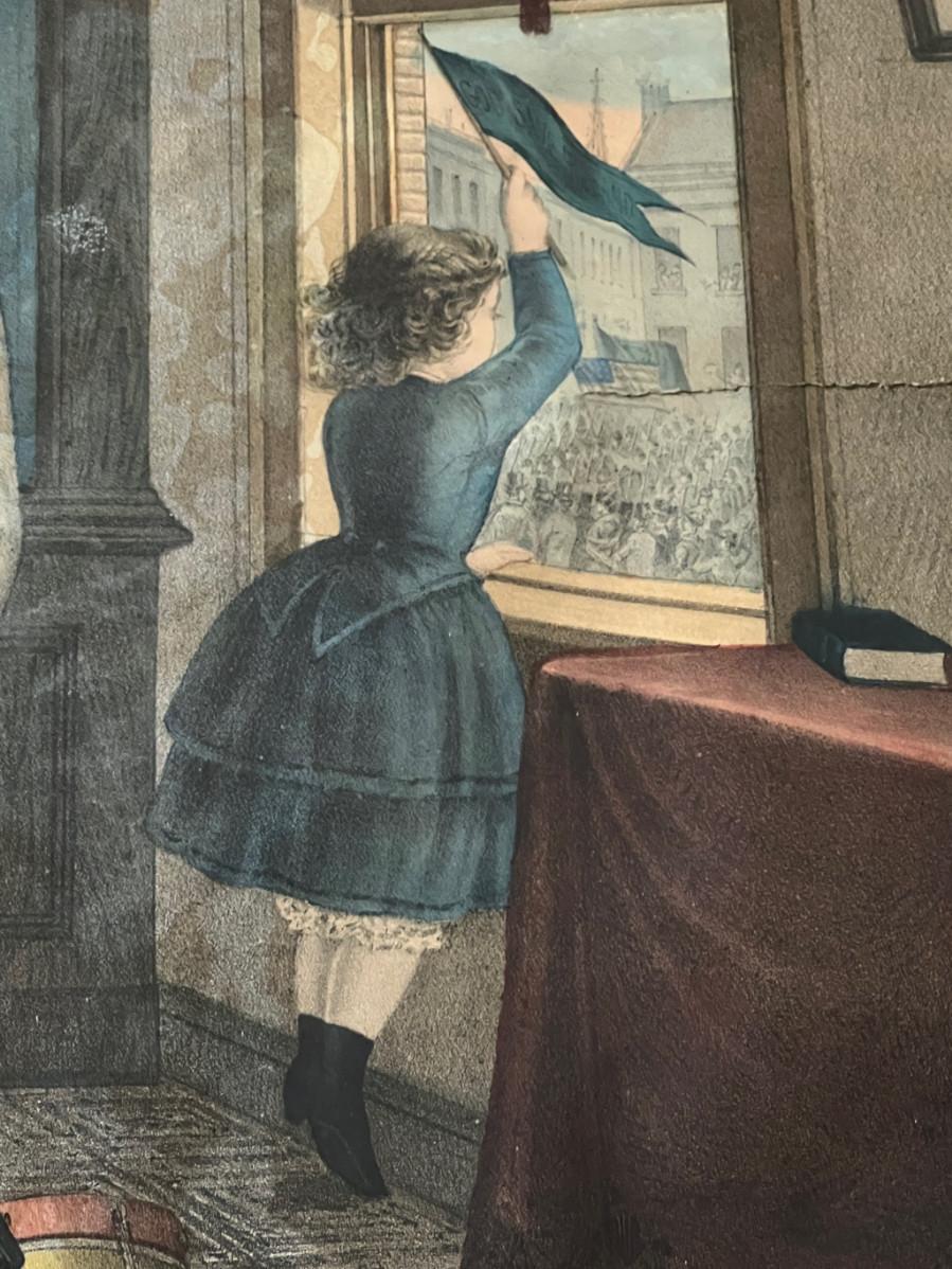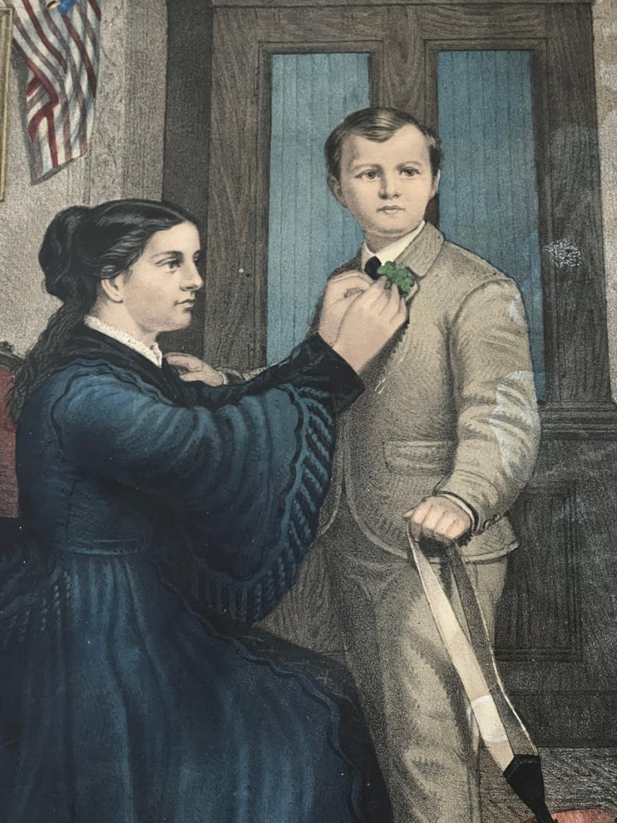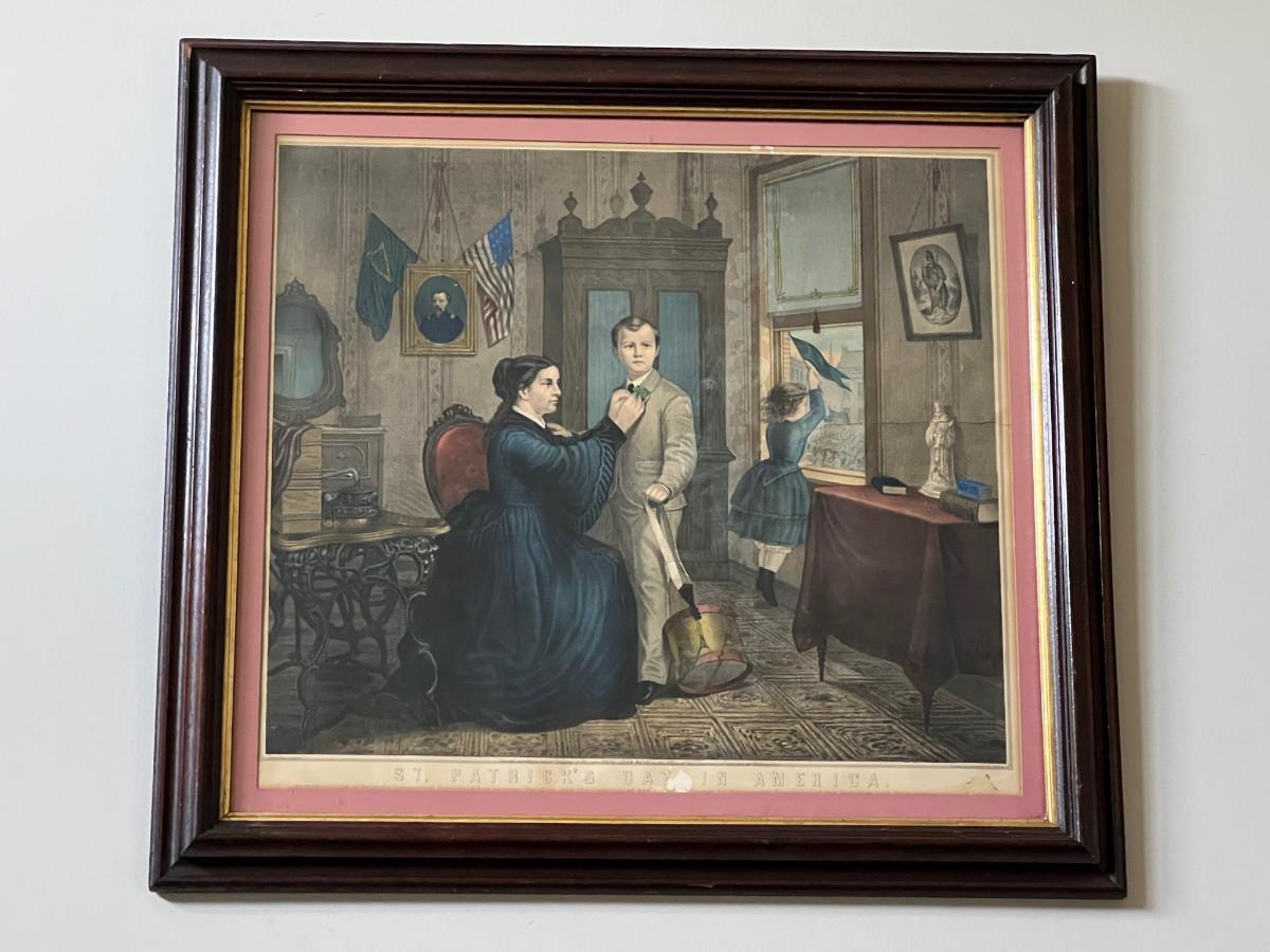 Antique 19th C Lithograph St Patrick's Day in America by Reid. This circa 1872 color lithograph shows a mother pinning clover on her son's suit lapel. On the right, a young girl is standing at an open window waving a "God Save Ireland" banner to the (assumed) parade passing by. Print by Duval and Hunter, Lithographers. CONDITION: Some margin damage - tear to proper right margin. SIZE: Image (under glass) 22 x 20", Frame 28.5 x 26"