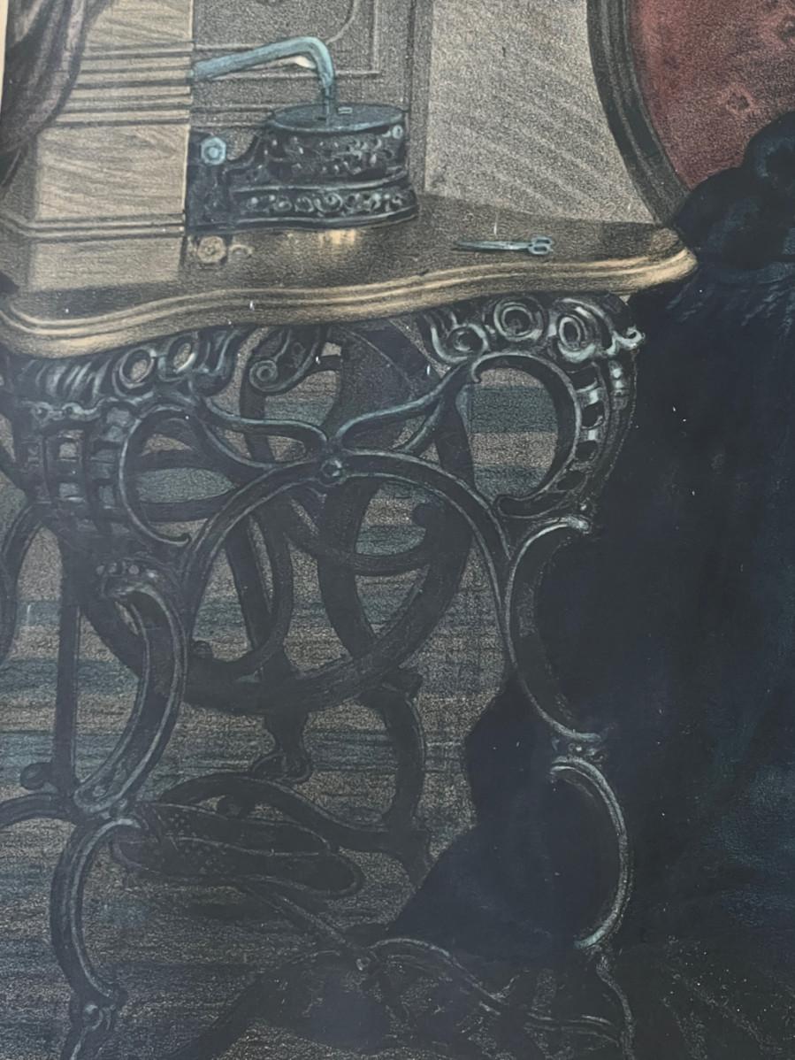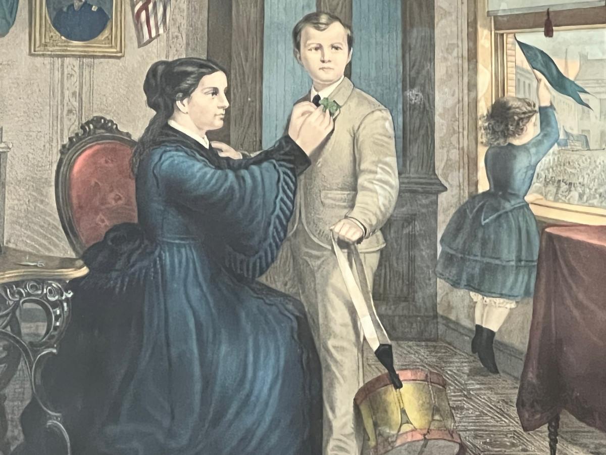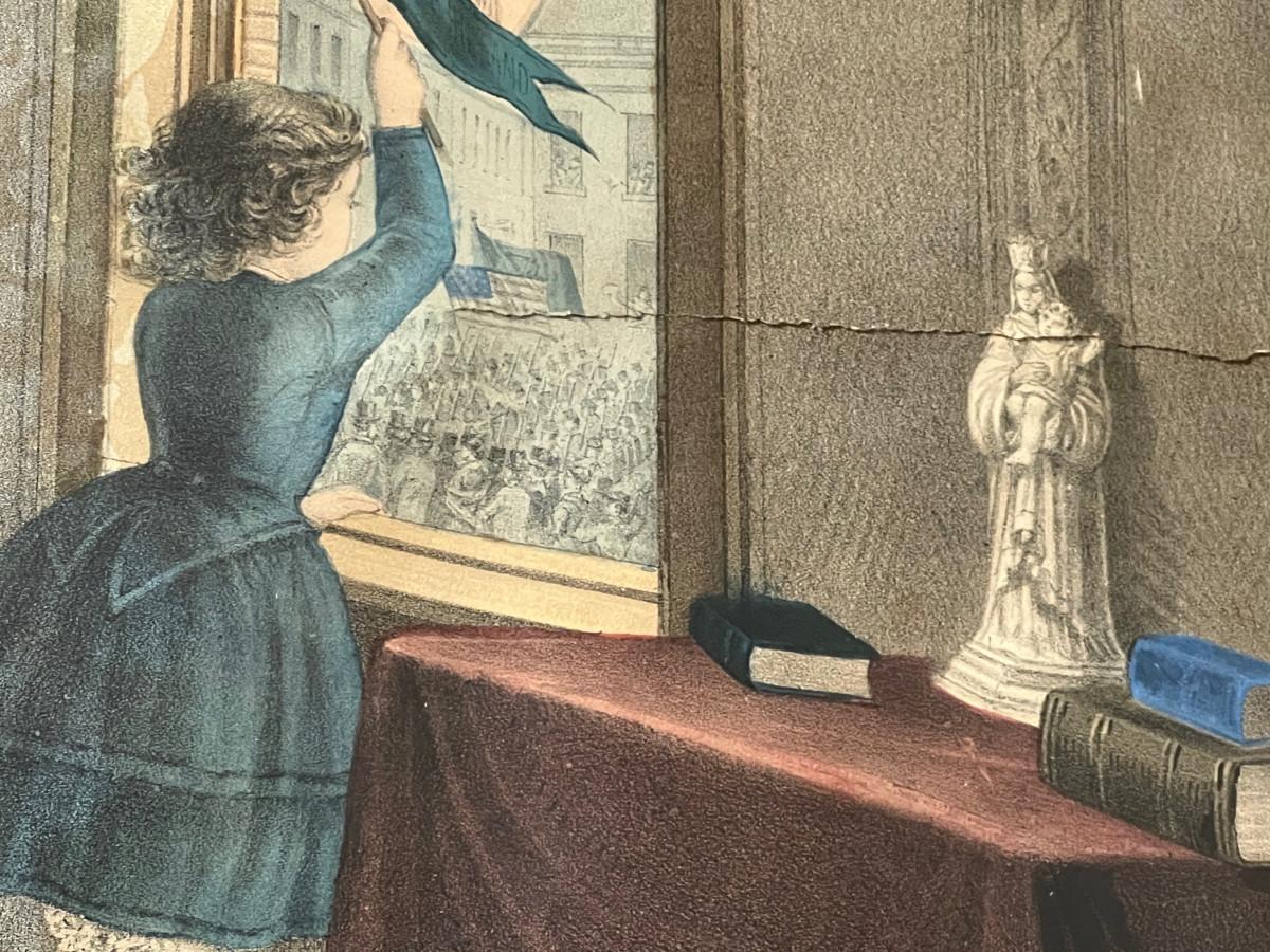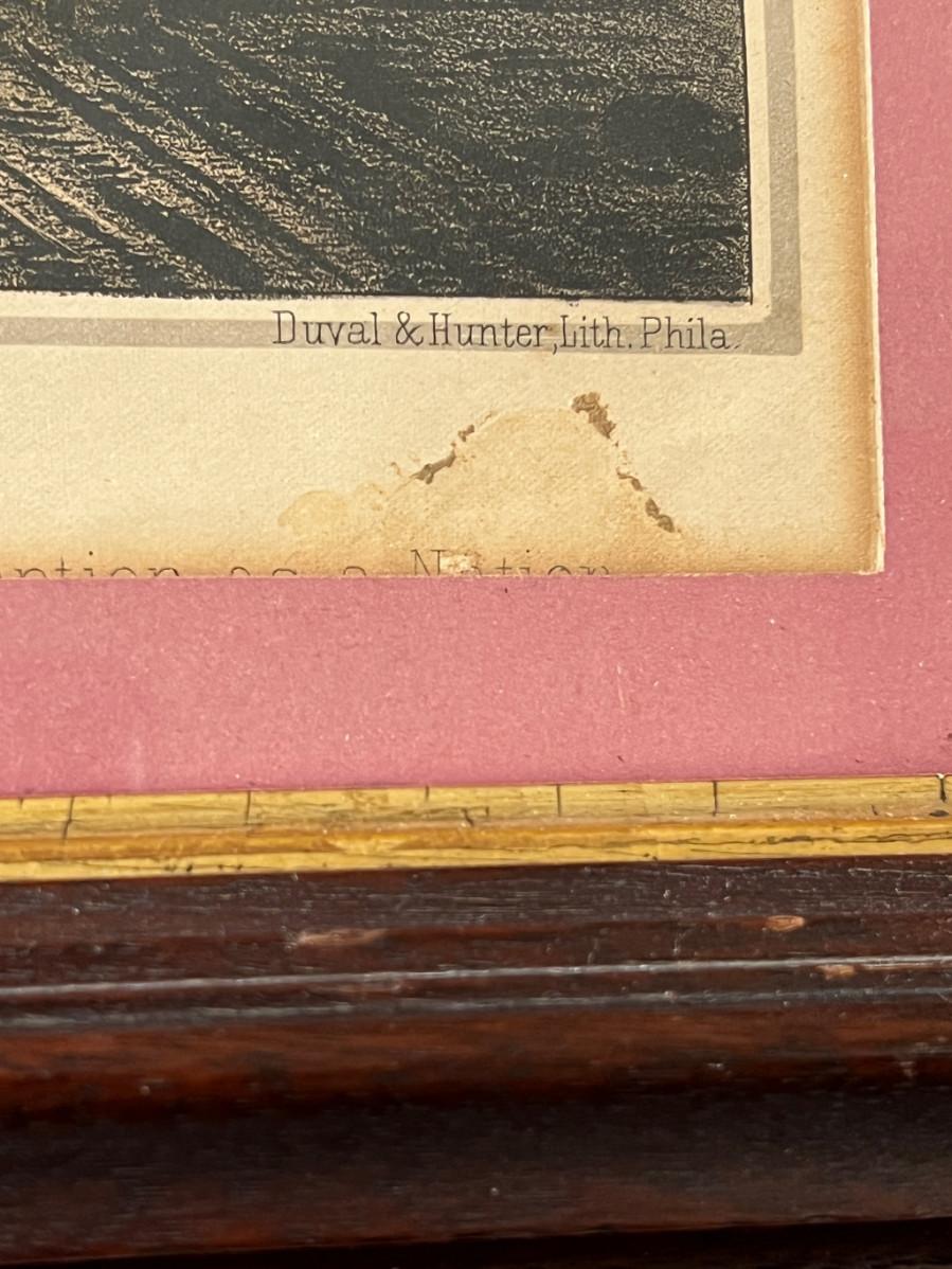 Antique 19th C Lithograph St Patrick's Day in America by Reid. This circa 1872 color lithograph shows a mother pinning clover on her son's suit lapel. On the right, a young girl is standing at an open window waving a "God Save Ireland" banner to the (assumed) parade passing by. Print by Duval and Hunter, Lithographers. CONDITION: Some margin damage - tear to proper right margin. SIZE: Image (under glass) 22 x 20", Frame 28.5 x 26"