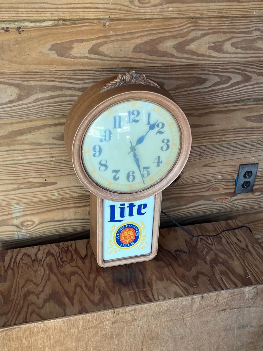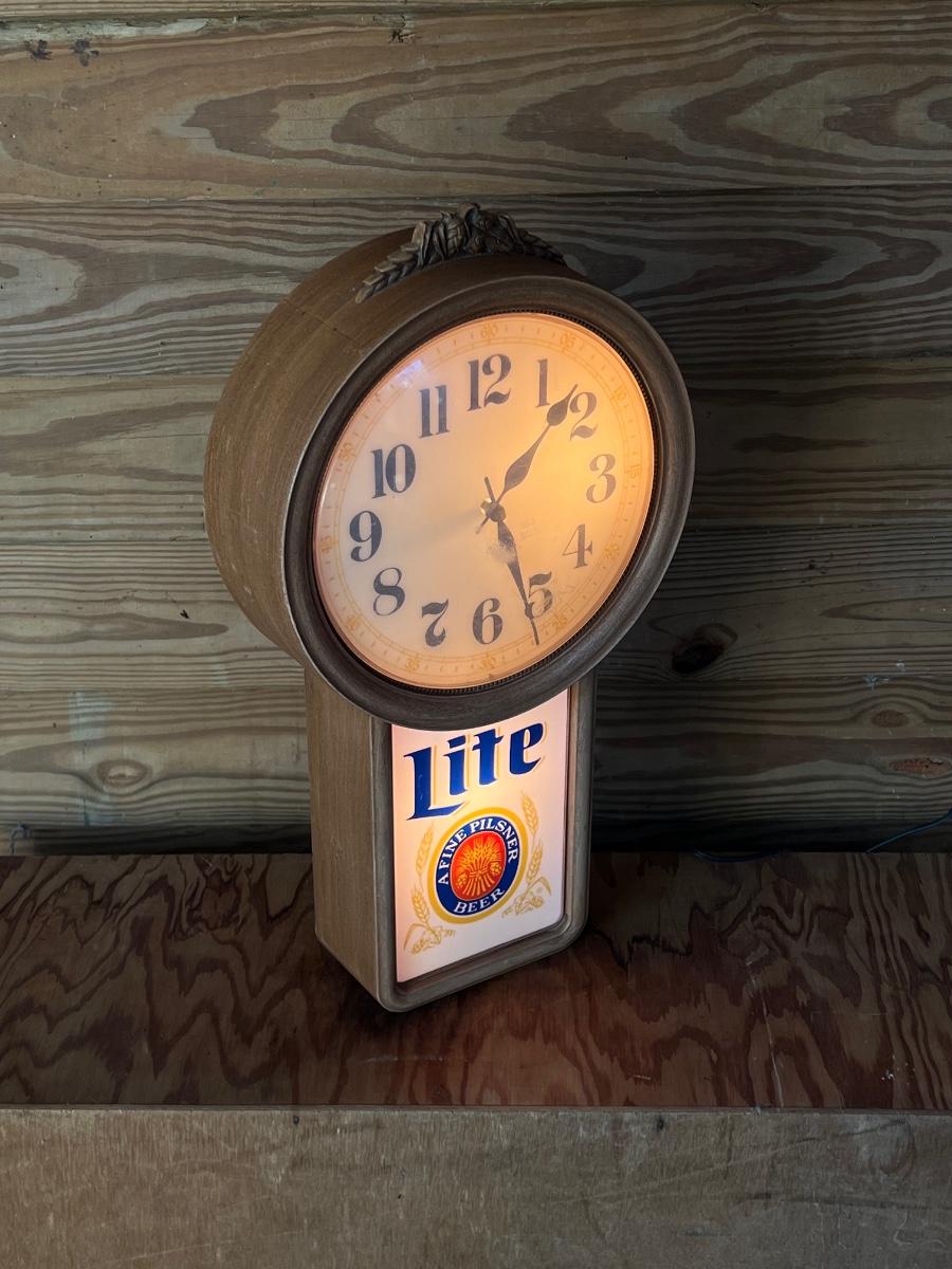 Has been porch kept. The light does work but the clock does not 23” H x 12” W x 5” D