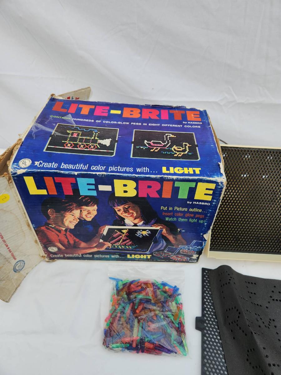 Lite-Brite toy including the original box, perforated black panels, pegs in various colors, and a sample template sheet. The box shows signs of wear and age. The toy appears intact with its components. Power cord is visibly included. Condition of light function and completeness of peg and templates not verified.