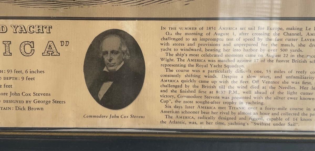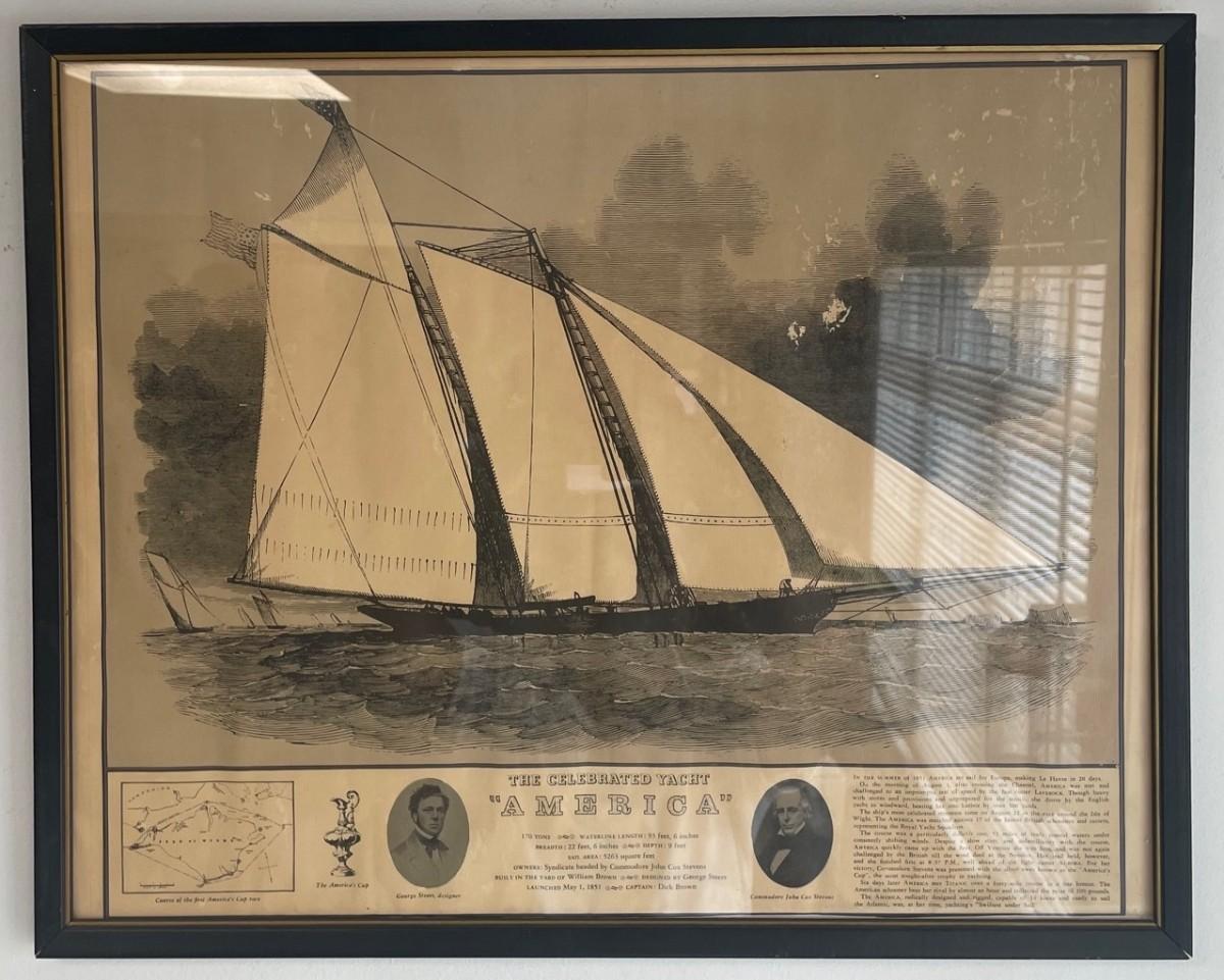 Description: The celebrated Yacht/ AMERICA/ Syndicate headed by Commodore John Cox Stevens built in the yard of William Brown; Measurement approximate: 17”x21” (framed); 16”x20” (image); Material: Lithograph on paper