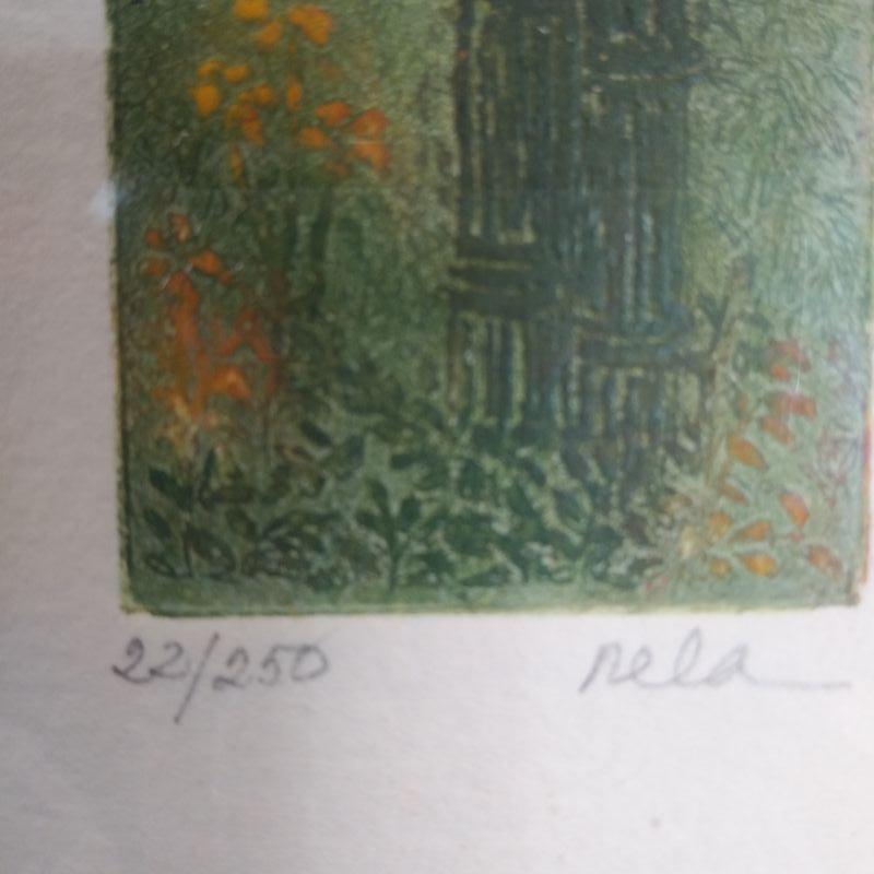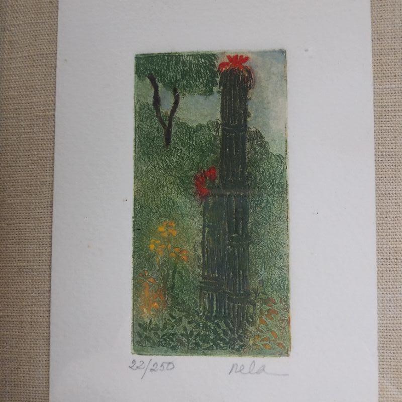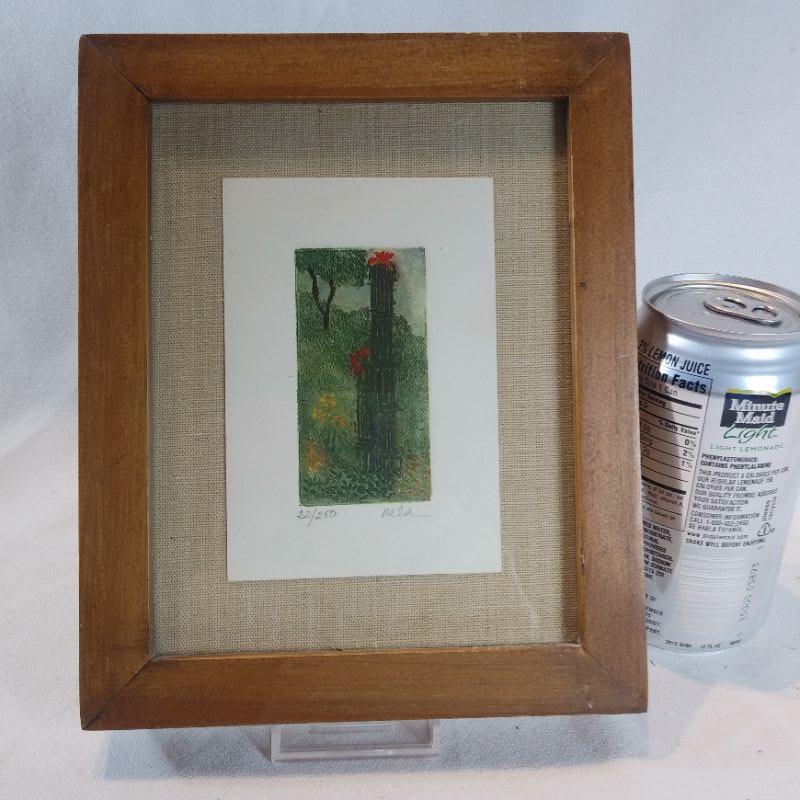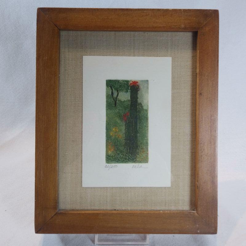 Lithograph of Cactus Flowers. Nicely framed small lithograph of Cactus Flowers. Signed Nela and numbered 22 of 250. Measures 8-inches tall X 6 1/2-inches wide. Nicely Framed and ready for your gallery.