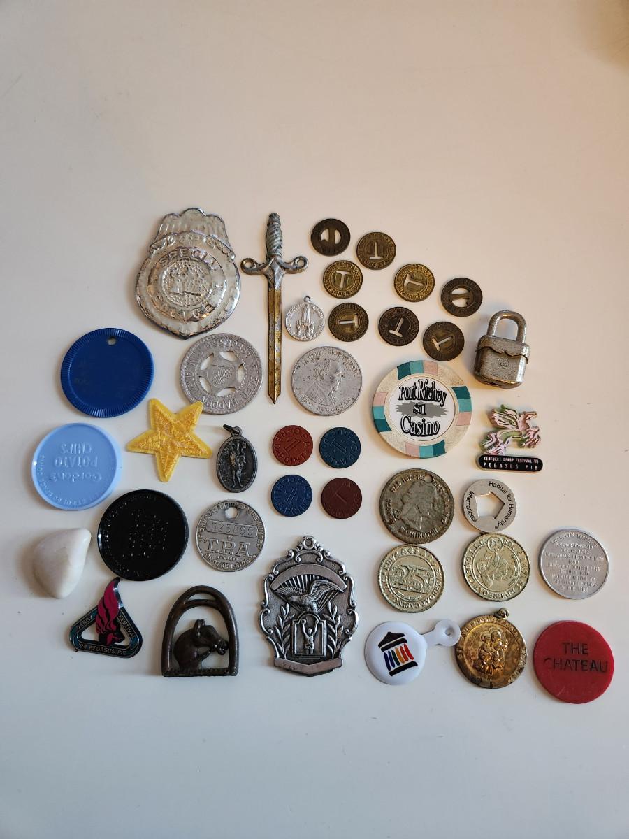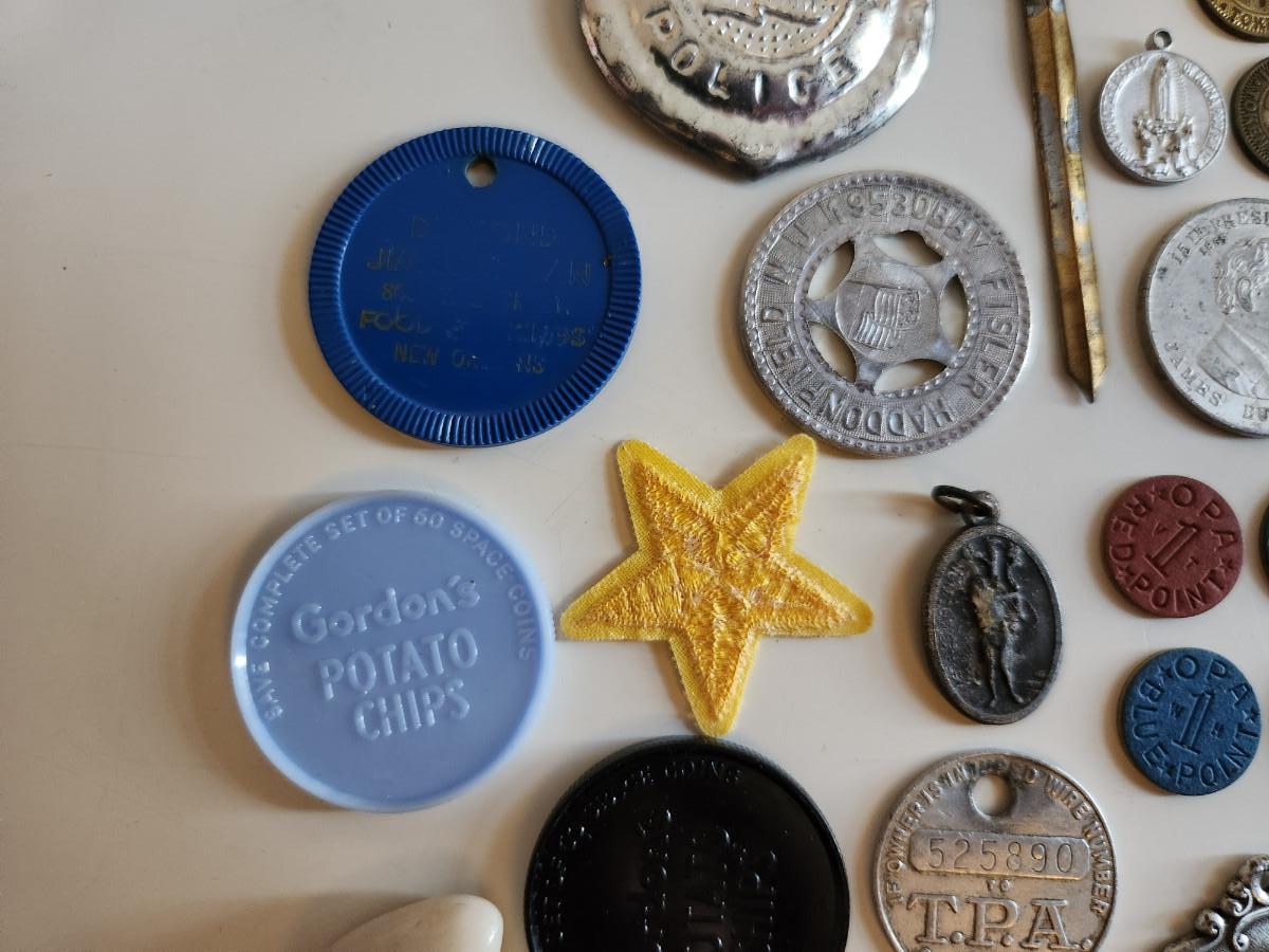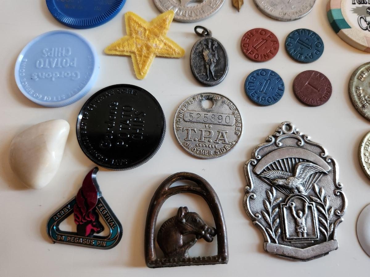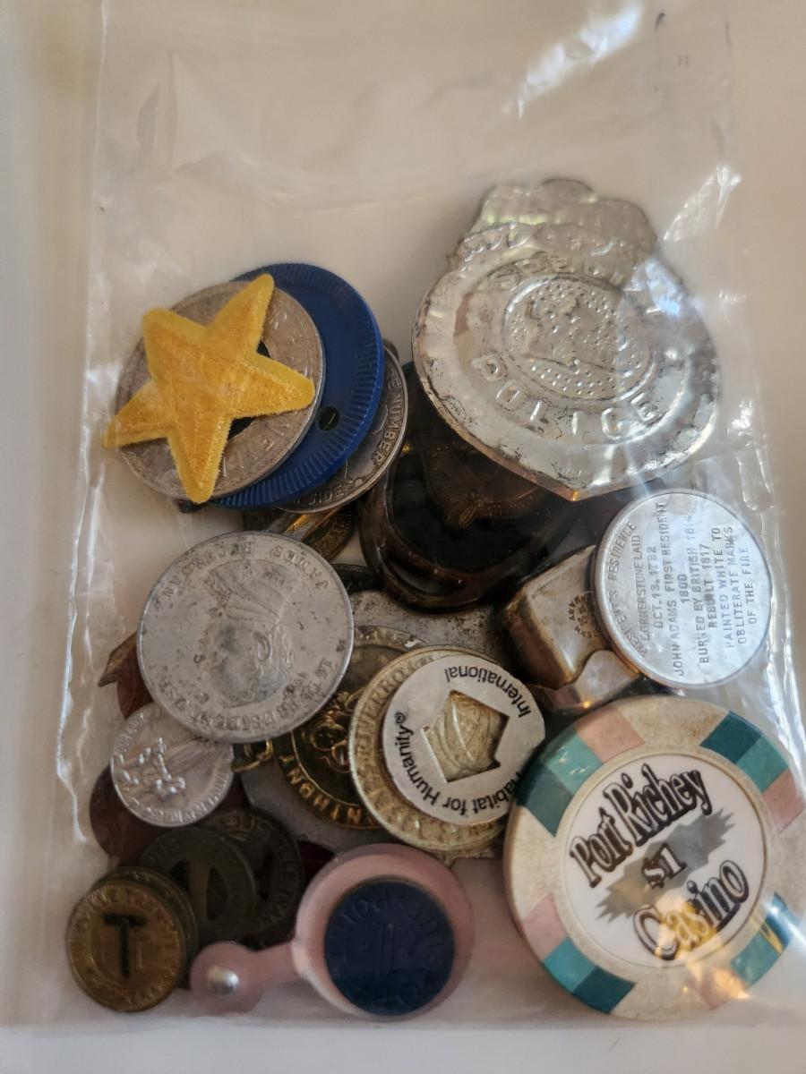 This lot is for a Little Bag of Whatever. When we clean out an estate there are usually little bits and pieces found in the back of drawers and desks. Here is a bag filled with things from a recent estate. Could be used for an art piece, for resell or most any purpose. The horse piece is metal and the tin badge gives you no authority.