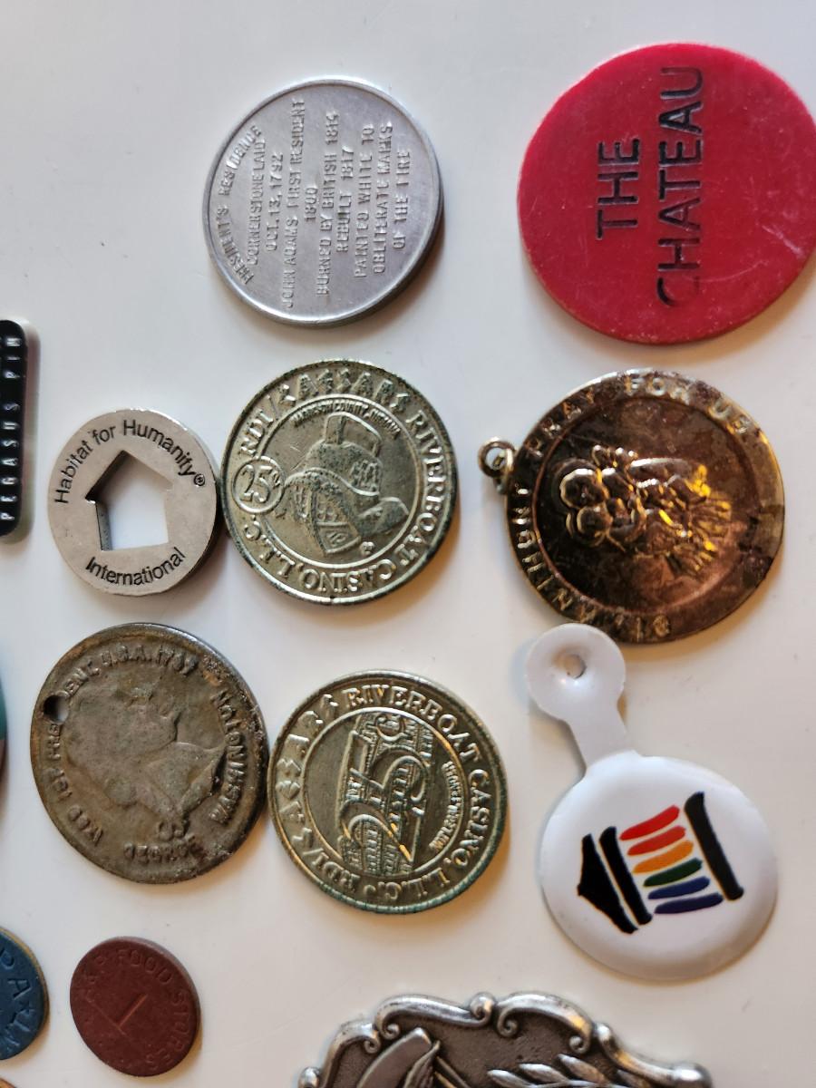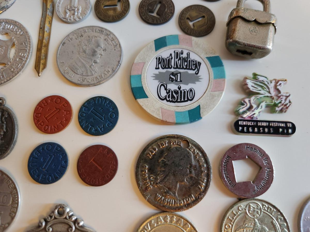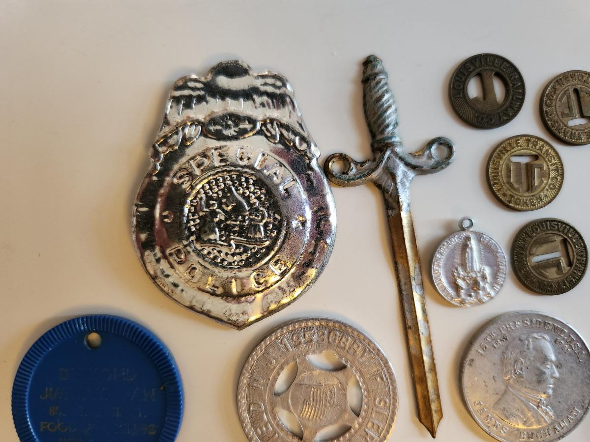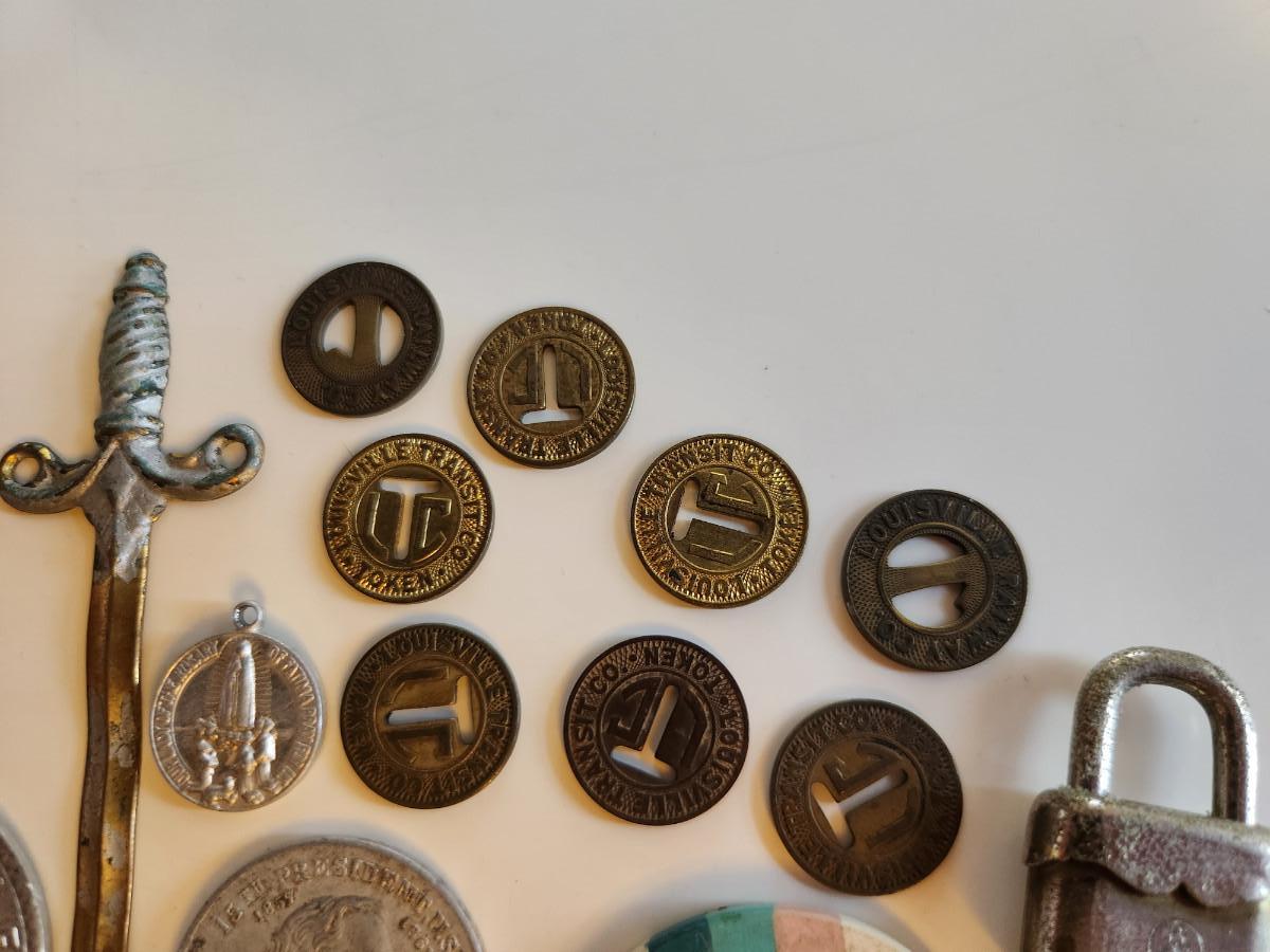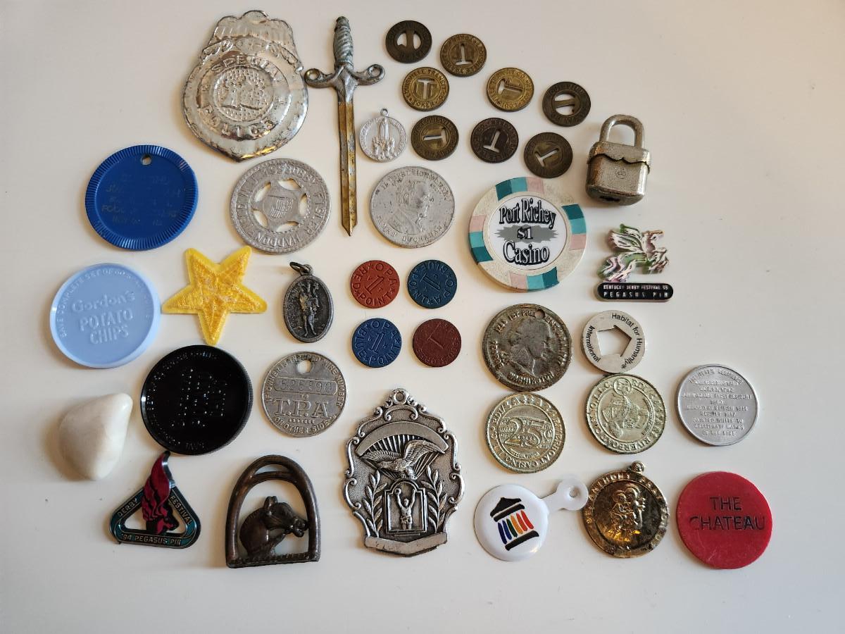 This lot is for a Little Bag of Whatever. When we clean out an estate there are usually little bits and pieces found in the back of drawers and desks. Here is a bag filled with things from a recent estate. Could be used for an art piece, for resell or most any purpose. The horse piece is metal and the tin badge gives you no authority.