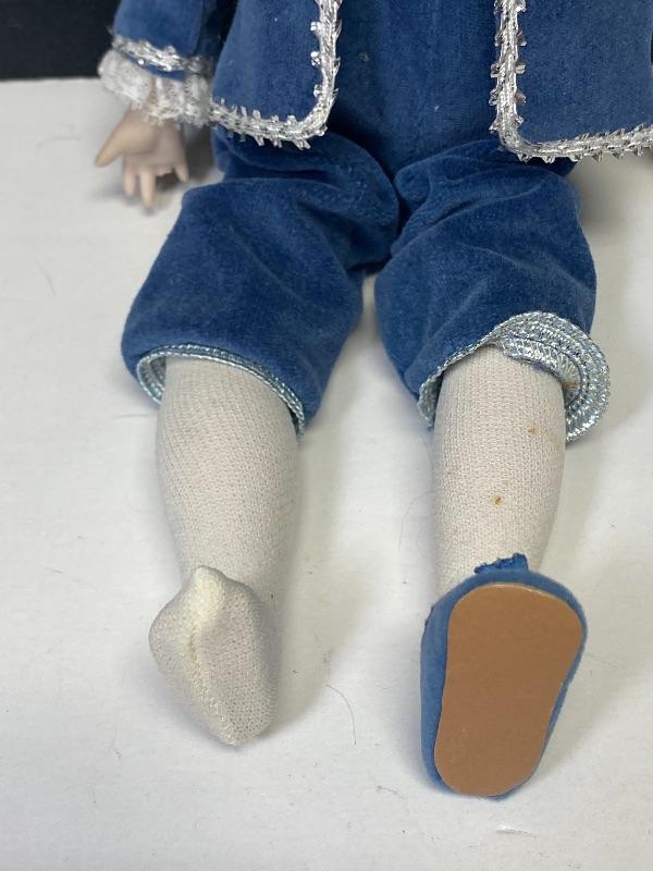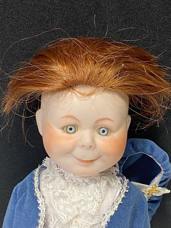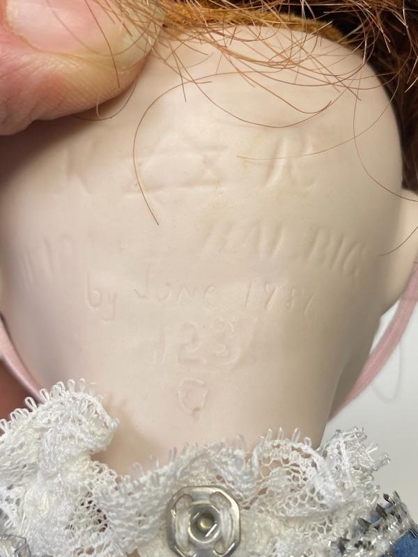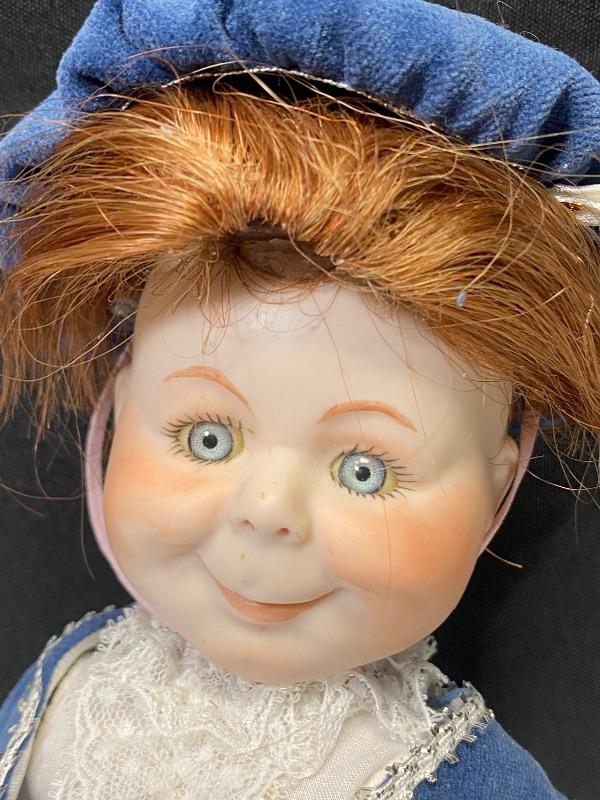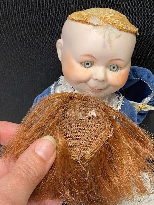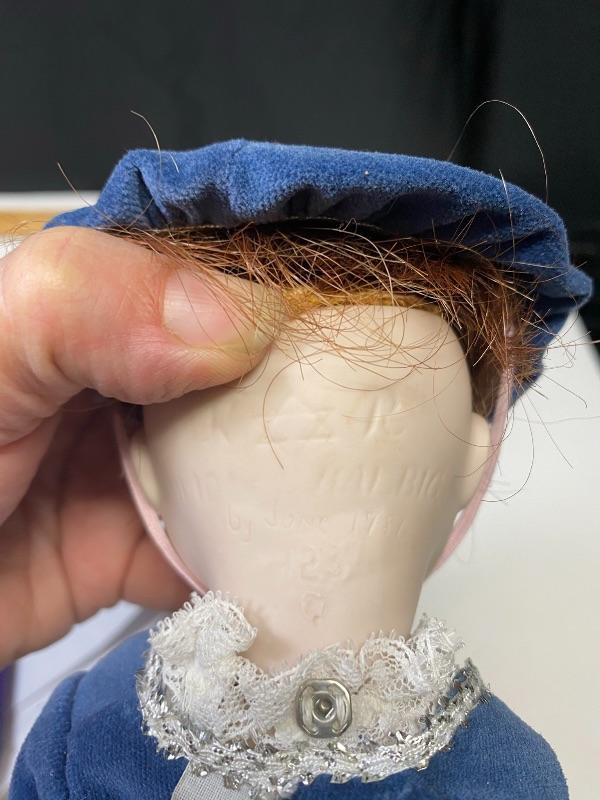 11" Little Boy Blue jointed bisque doll. Simon & Halbig #123 head, marked on back. Repro done by June in 1986. He is missing a shoe, the outfit is from Madame Alexander, has tag. Eyes are pale blue, yellowed a bit. He has a bad wig, previous owner has used museum putty to hold it on. He is also missing a finger on one hand.