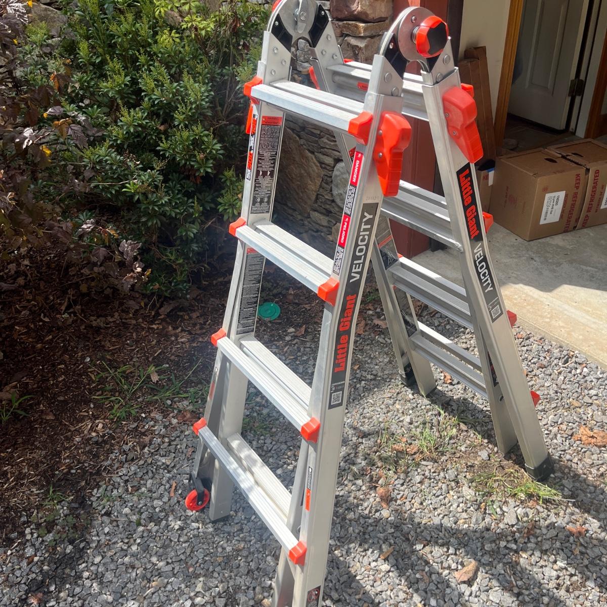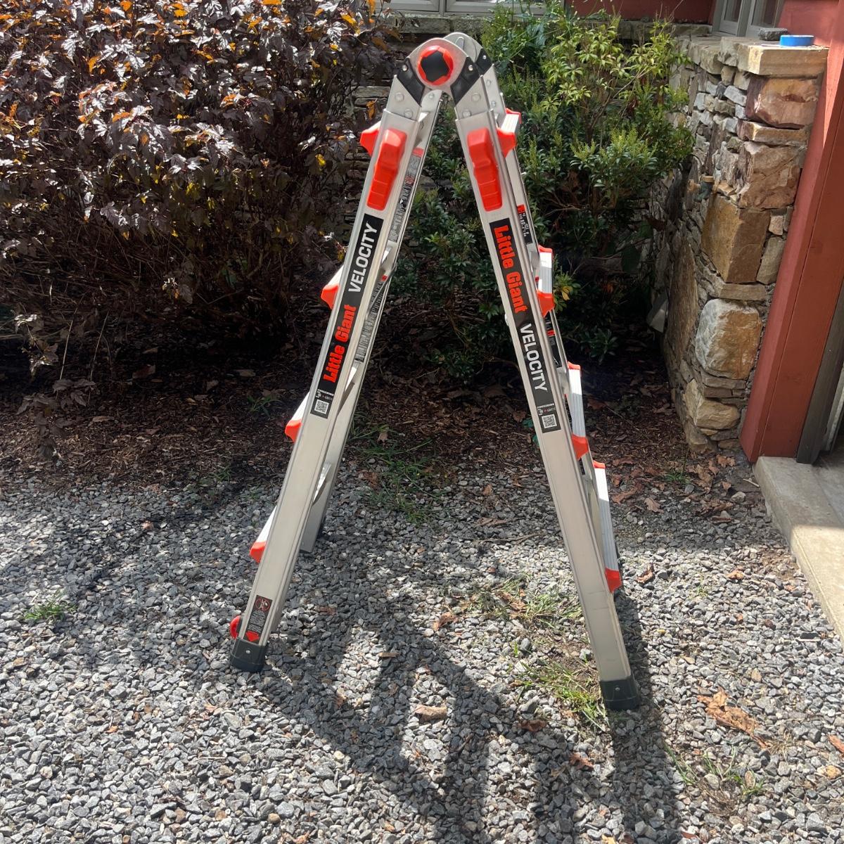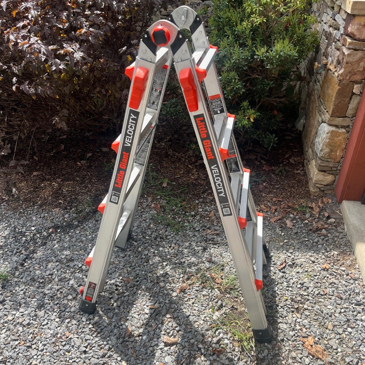 Lot includes an aluminum Little Giant Velocity ladder. Ladder measures 24” x 8” x 56” when folded up. Ladder has wheels for easy transport.