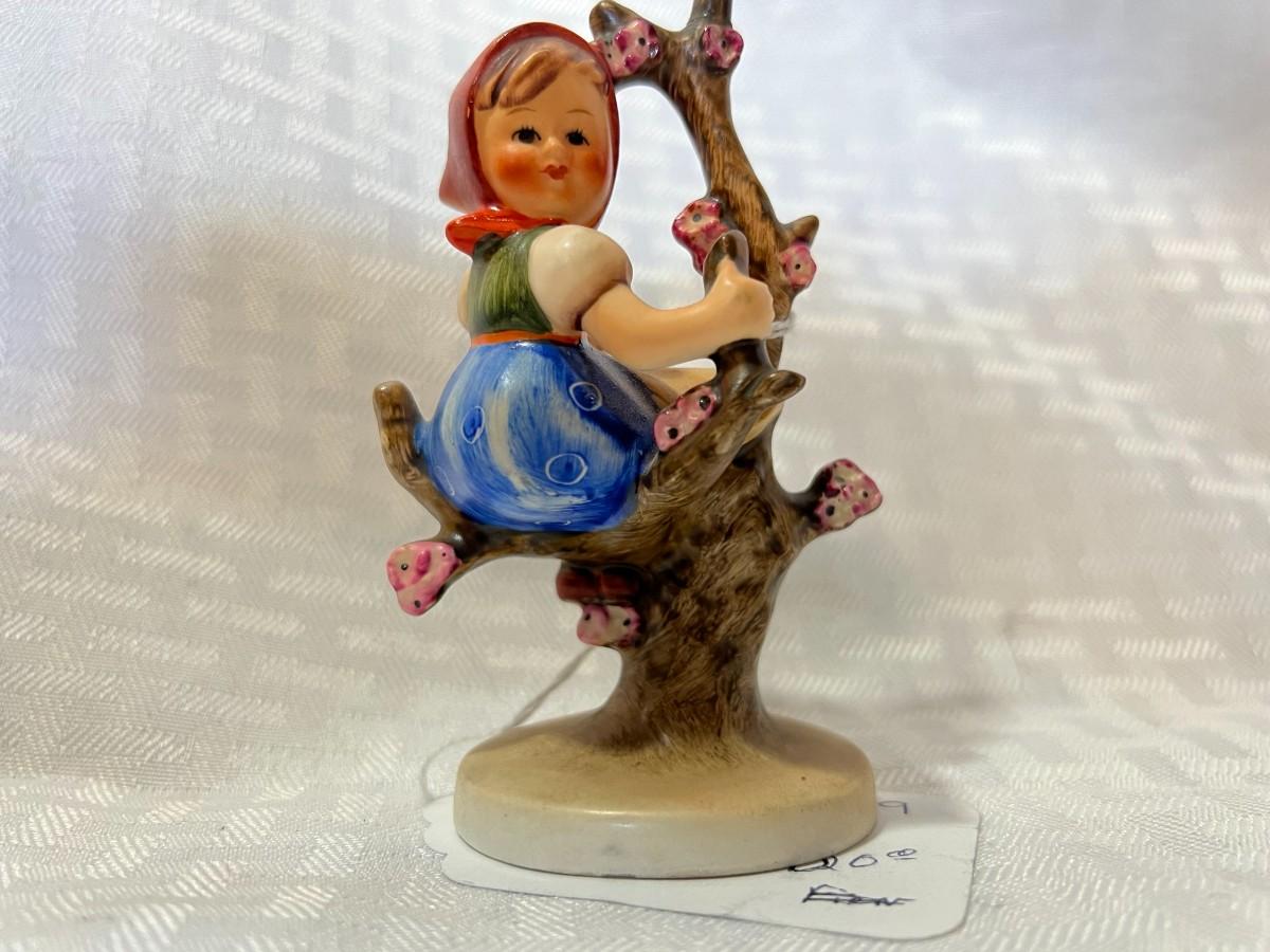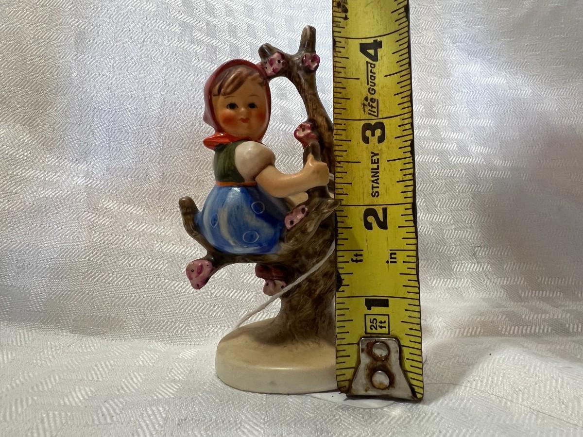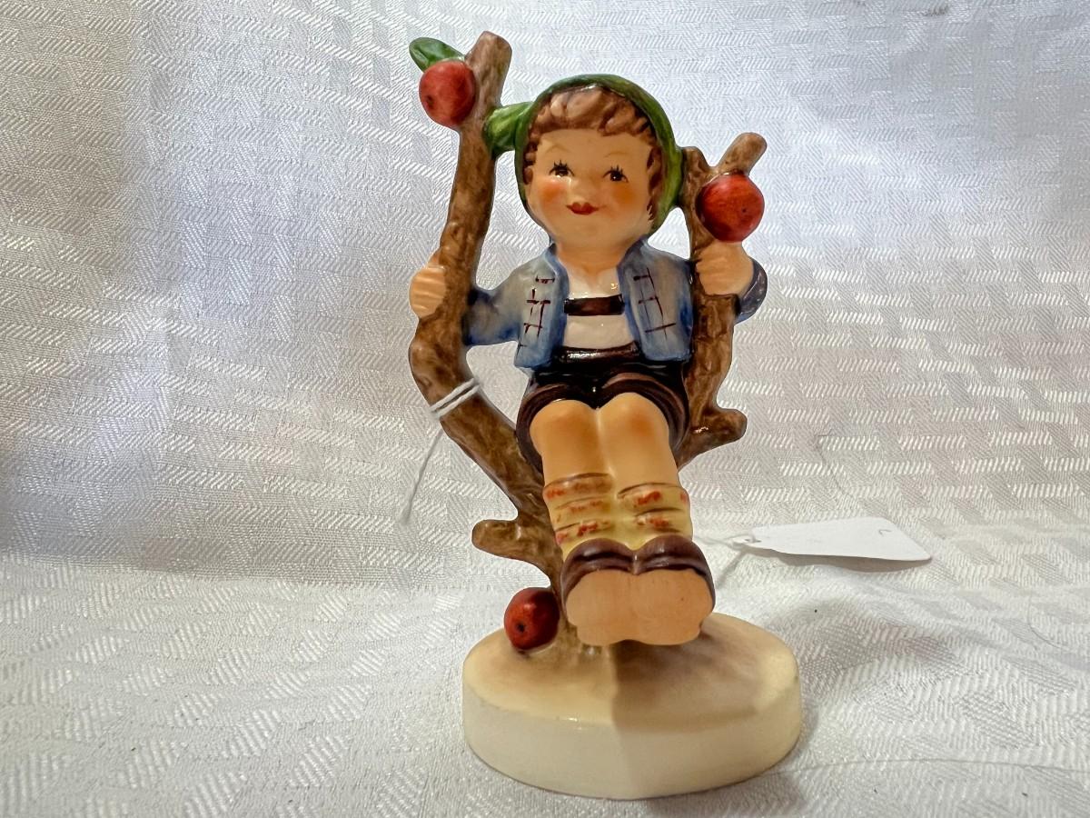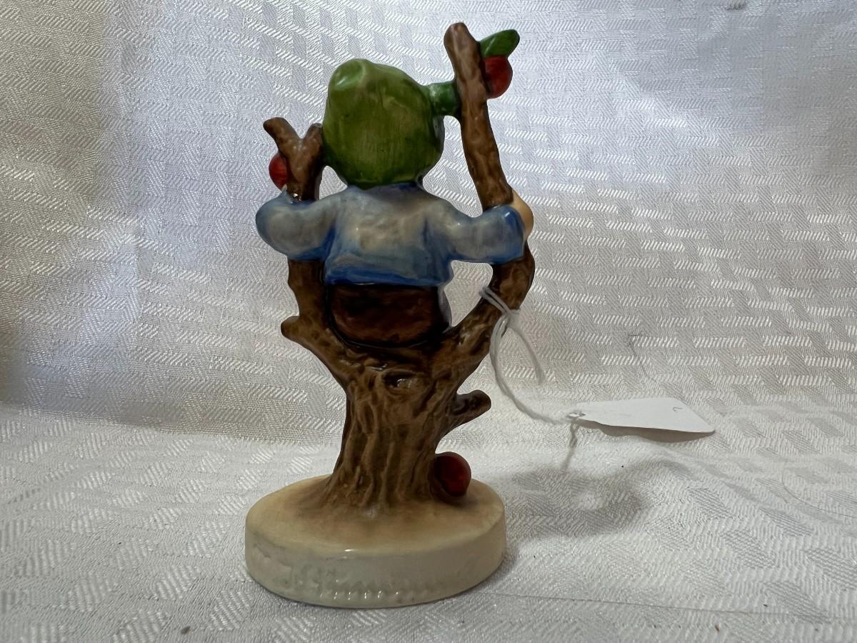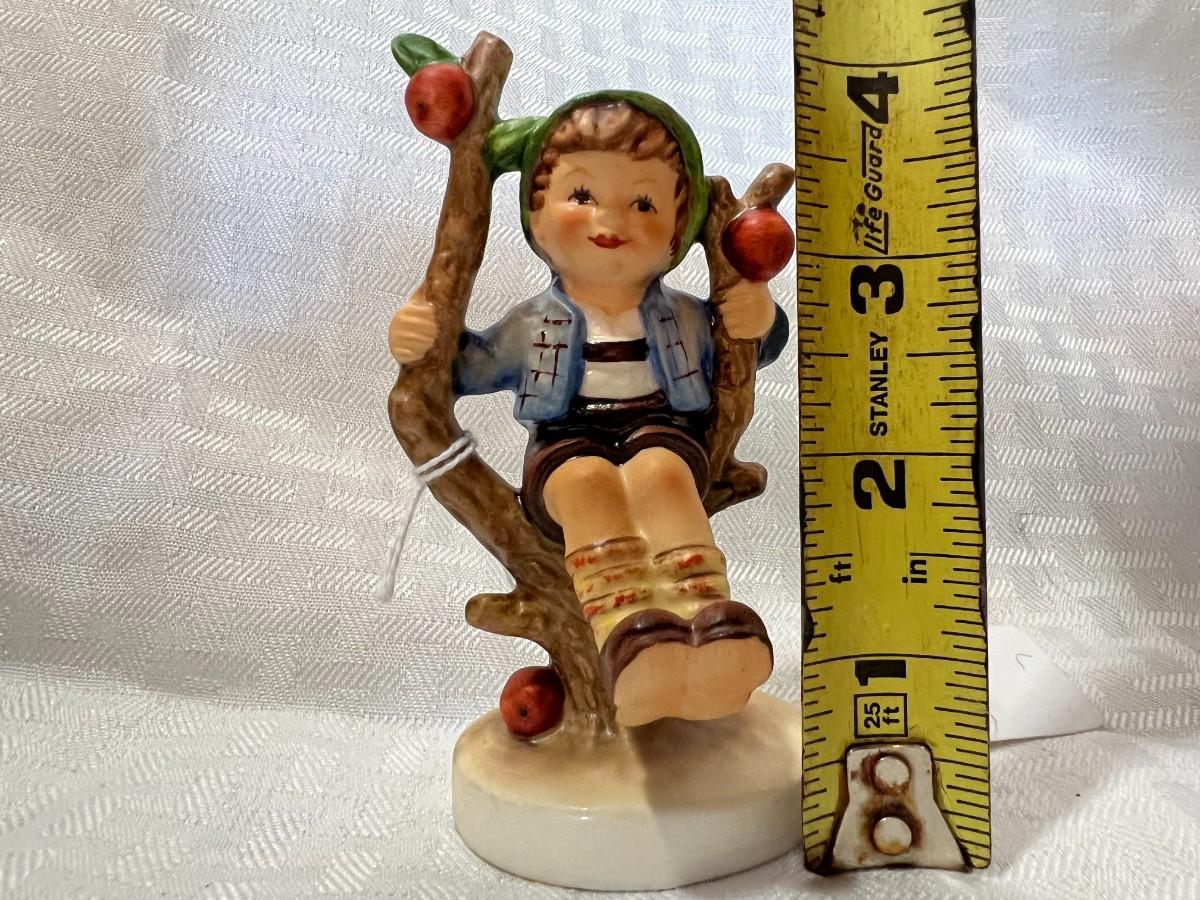 LITTLE BOY IN APPLE TREE BLUE JACKET, BROWN OVERALLS, GREEN CAP. GOBEL W. GERMANY 4 INCHES TALL