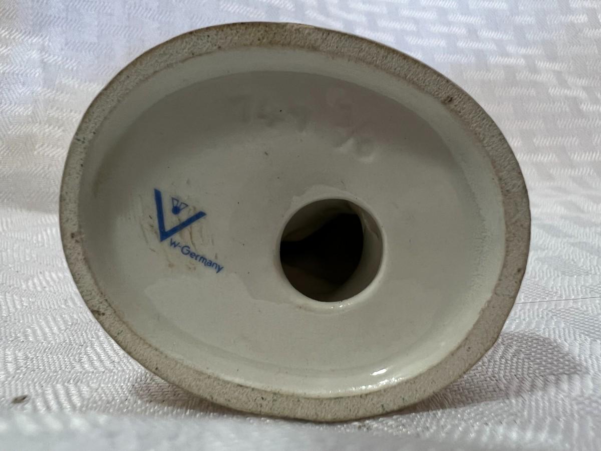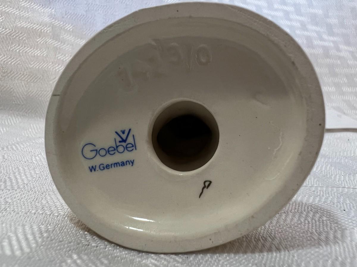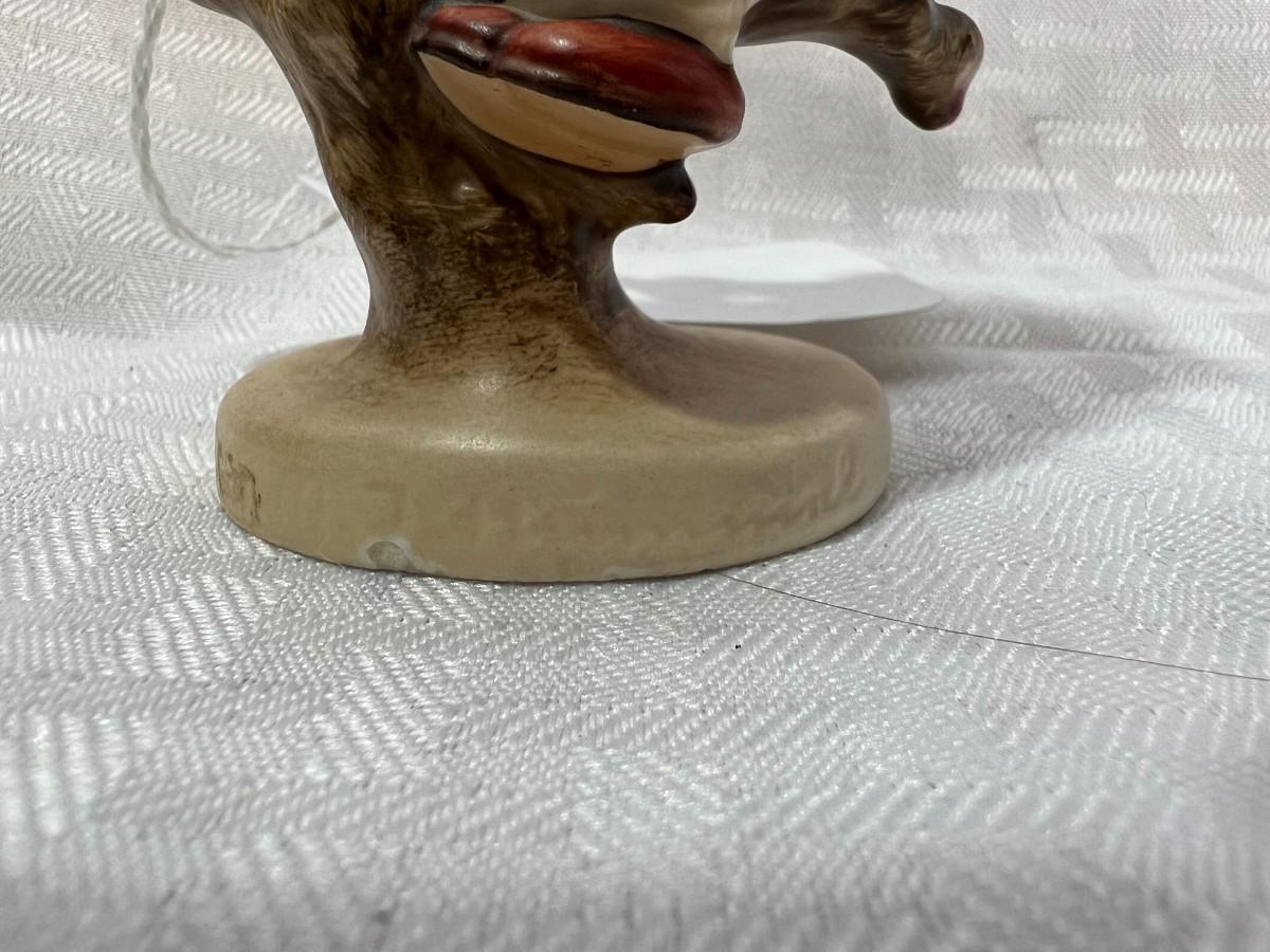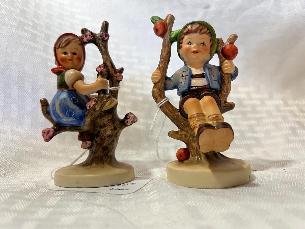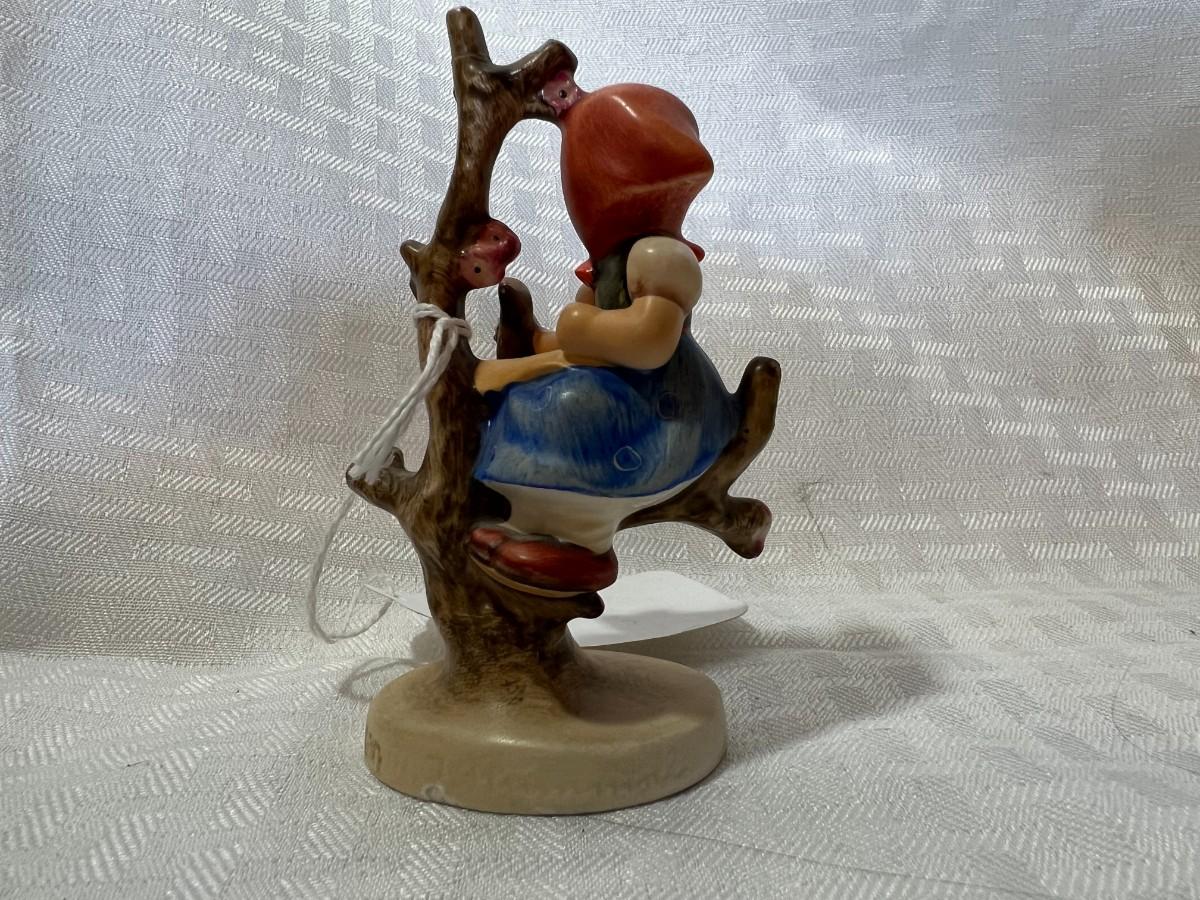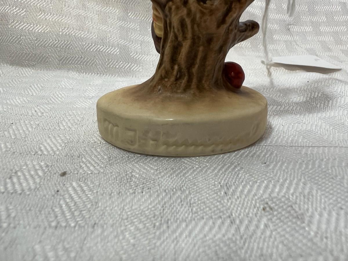 LITTLE BOY IN APPLE TREE BLUE JACKET, BROWN OVERALLS, GREEN CAP. GOBEL W. GERMANY 4 INCHES TALL