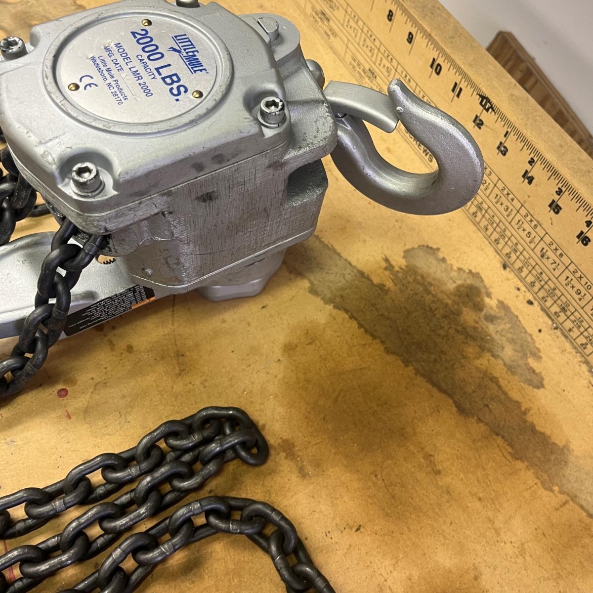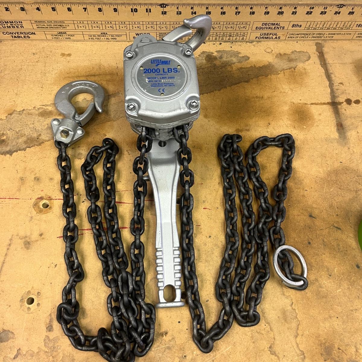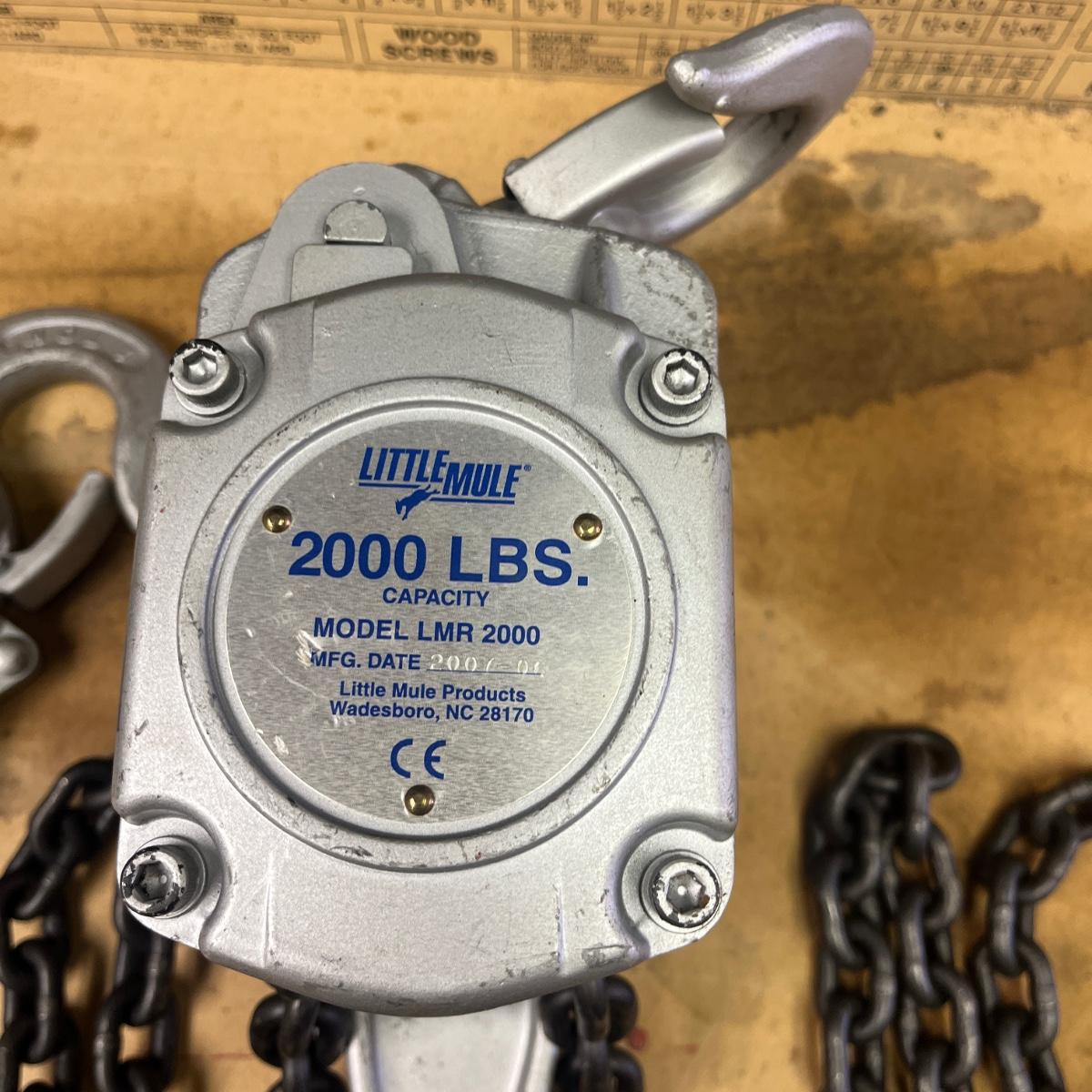Lot includes a Little Mule 2000-pound capacity level chain hoist. Hoist measures 6.5” x 4.5” x 17.5” long.