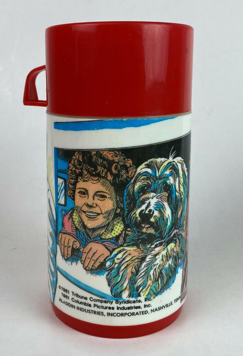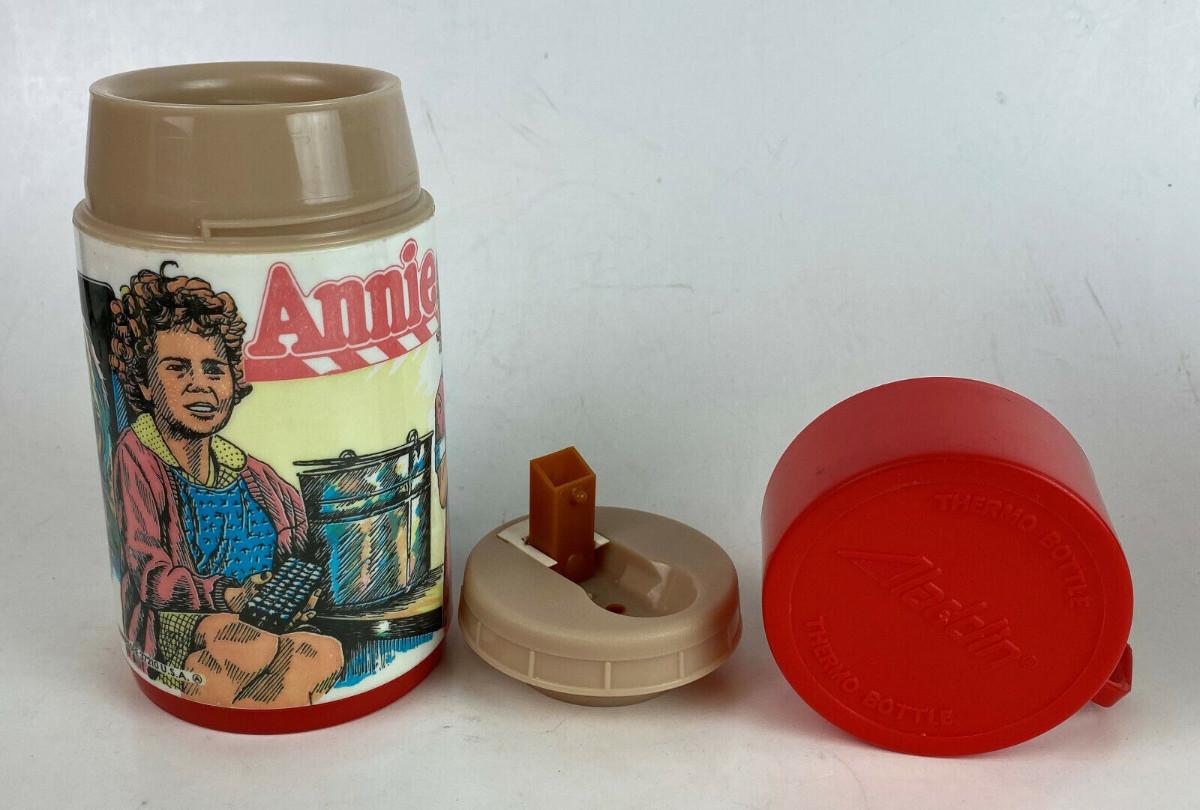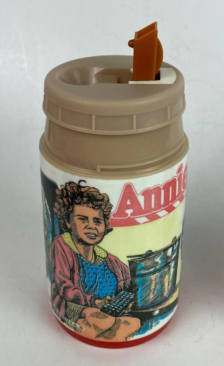 In nice shape here is a replacement thermos for your 1981 Aladdin ANNIE lunchbox based on the 1982 Columbia movie about cartoon character Little Orphan Annie...Directed by John Huston with Aileen Quinn, Albert Finney, Carol Burnett, Ann Reinking, Tim Curry and Bernadette Peters...No fading on the graphics...Dated 1981..6.5" tall with cup and stopper...as shown.