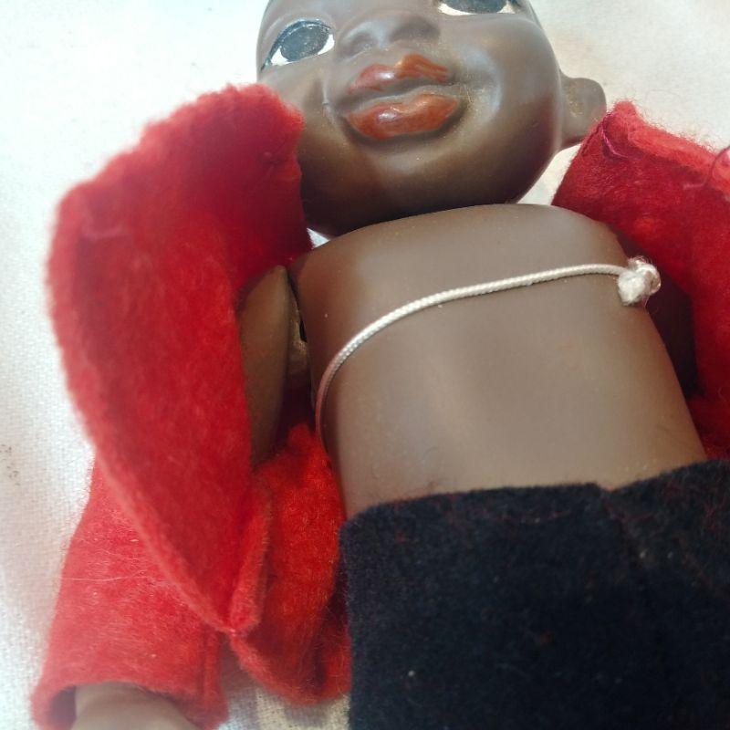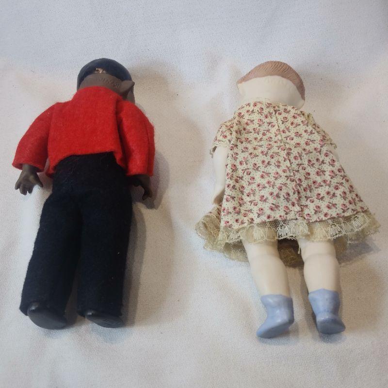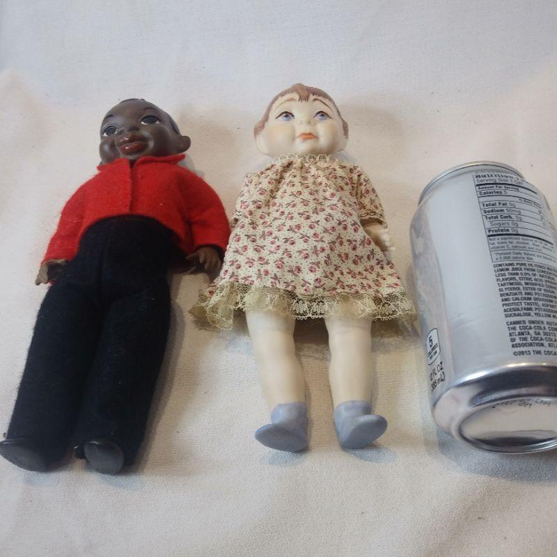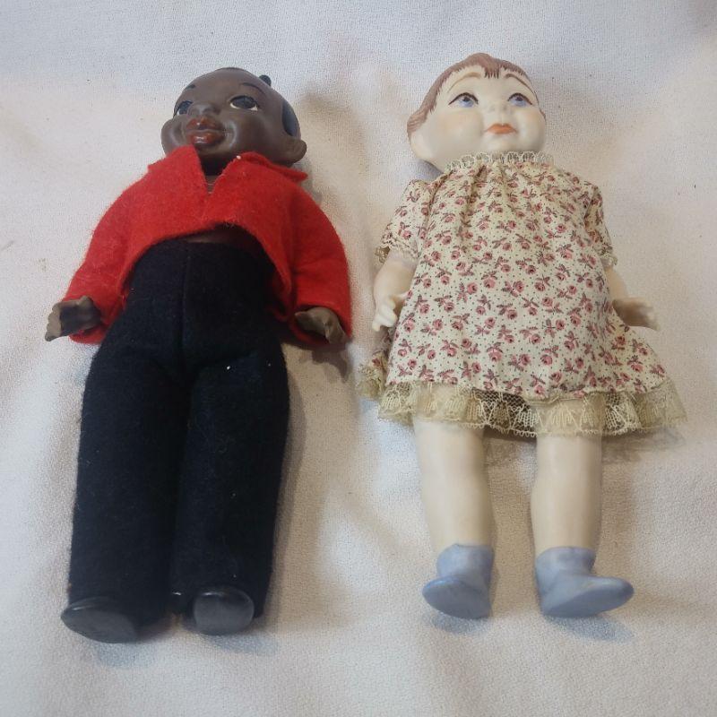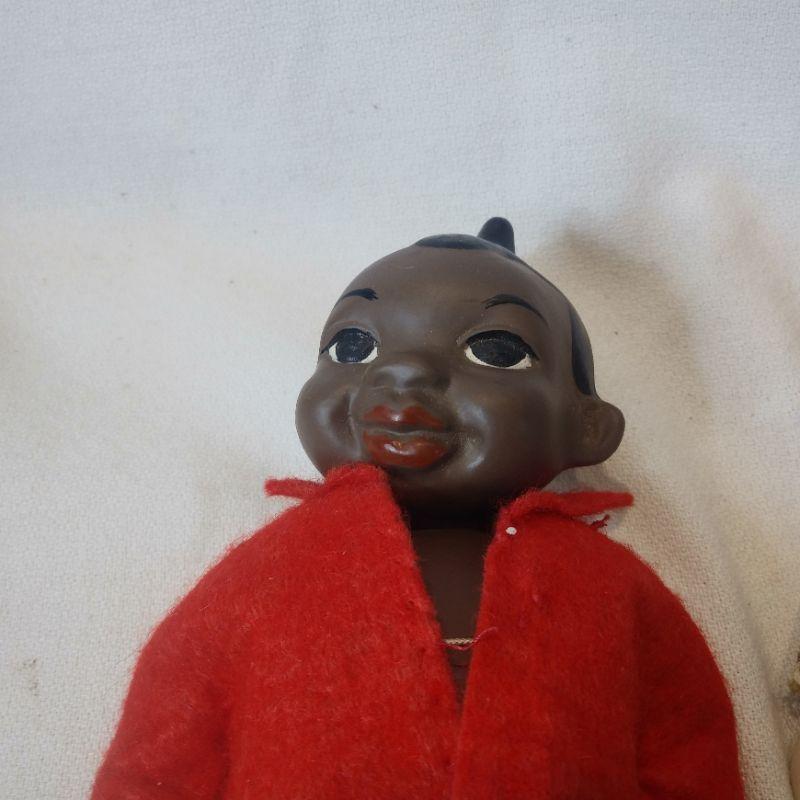 Little Rascals Dolls. Selling in this lot as a pair. Star Winkle is the little black boy doll - some of the stringing of his arms and legs has been make-shiftily reworked. All else is in very good condition. Mable is the little white girl and is very good condition. Both dolls are 9-inches tall. From the sixties and oh, so cute.