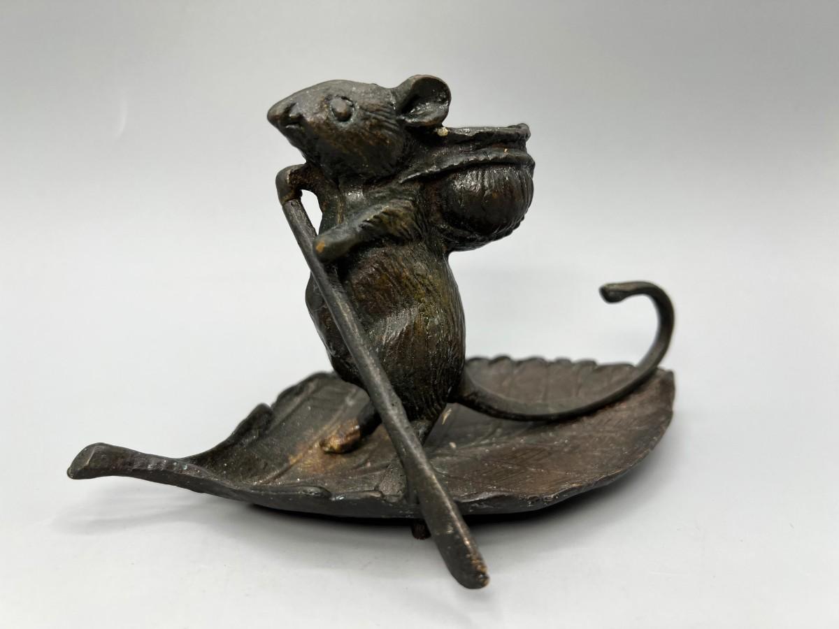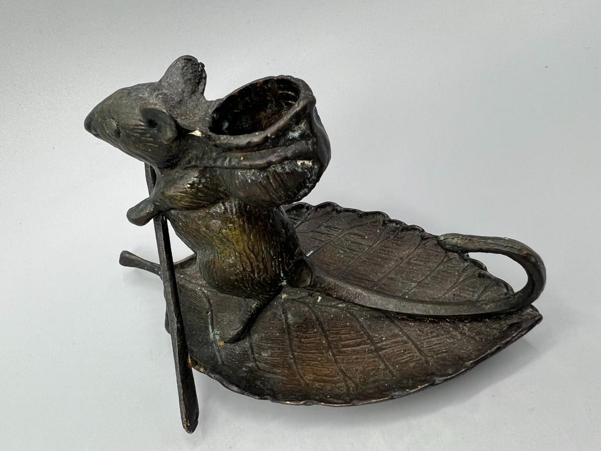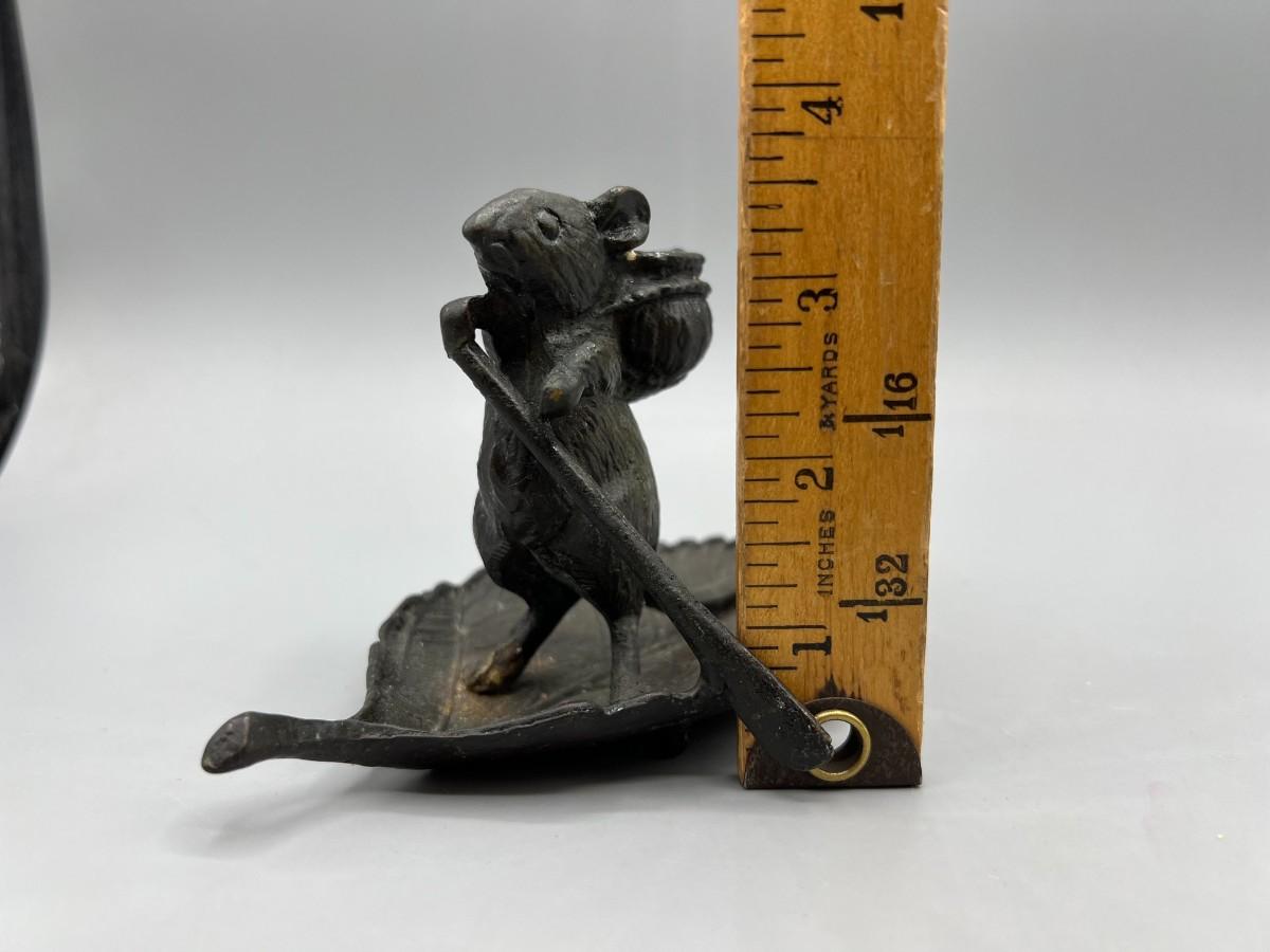 Little Rowing Traveling Mouse Floating on Leaf Cast Metal Candle Holder, there is no significant damage to the piece and is in good displayable condition. Check pictures for more details and for sizing.