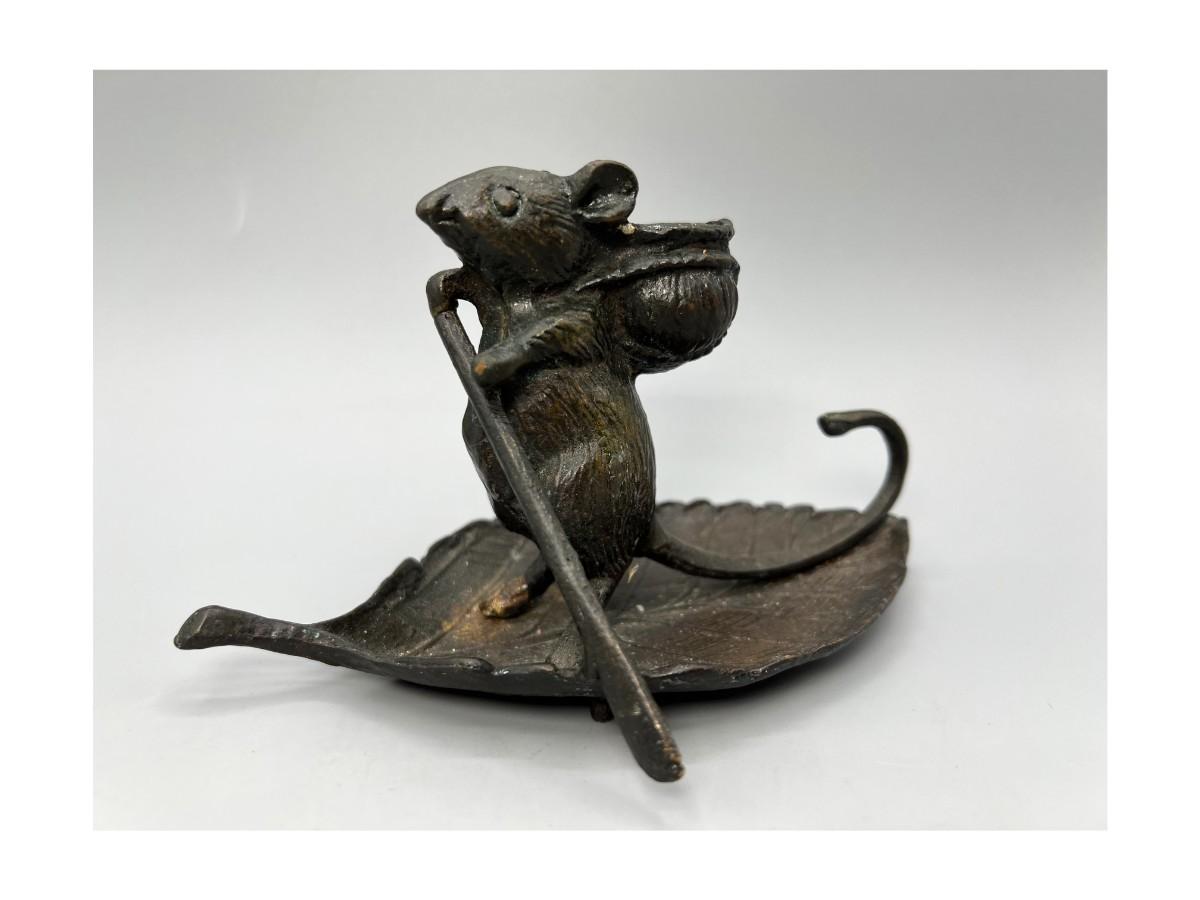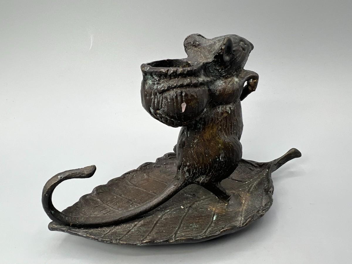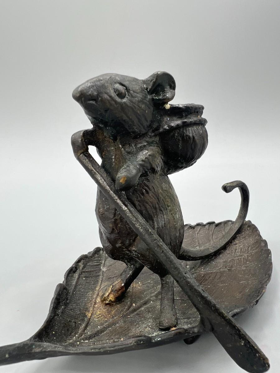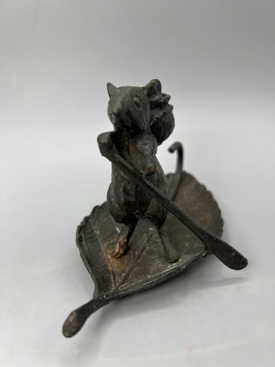 Little Rowing Traveling Mouse Floating on Leaf Cast Metal Candle Holder, there is no significant damage to the piece and is in good displayable condition. Check pictures for more details and for sizing.