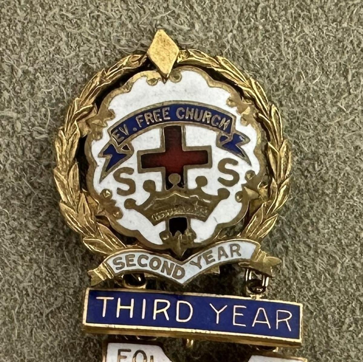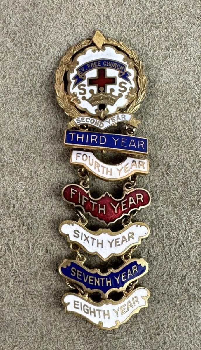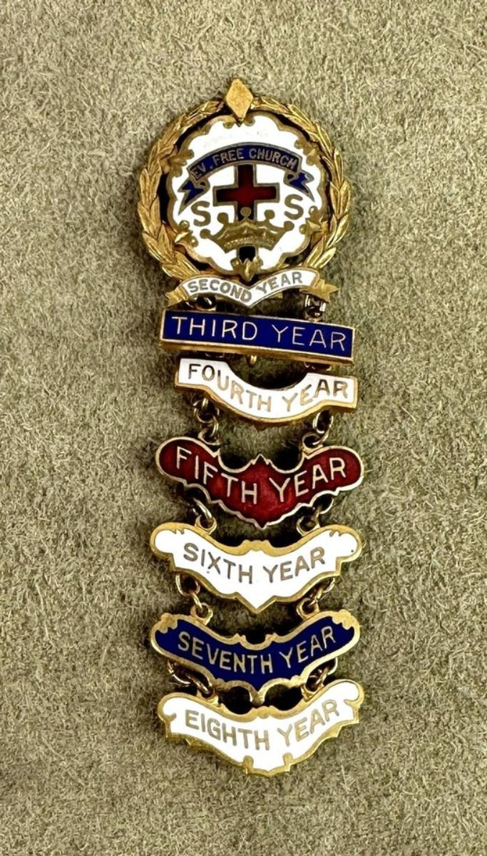 Very good condition on this antique Little System Cross and Crown Sunday School gold-filled enamel medallion with eight years of attendance bars...Reads EV. FREE CHURCH, which I believe may be the Evangelical Free Church...The Cross and Crown is a Christian symbol used by various Christian denominations as well as in heraldry...As shown...3"/76mm long..Early twentieth century..